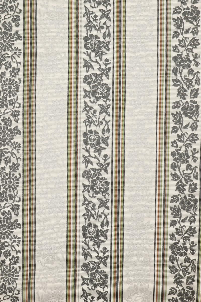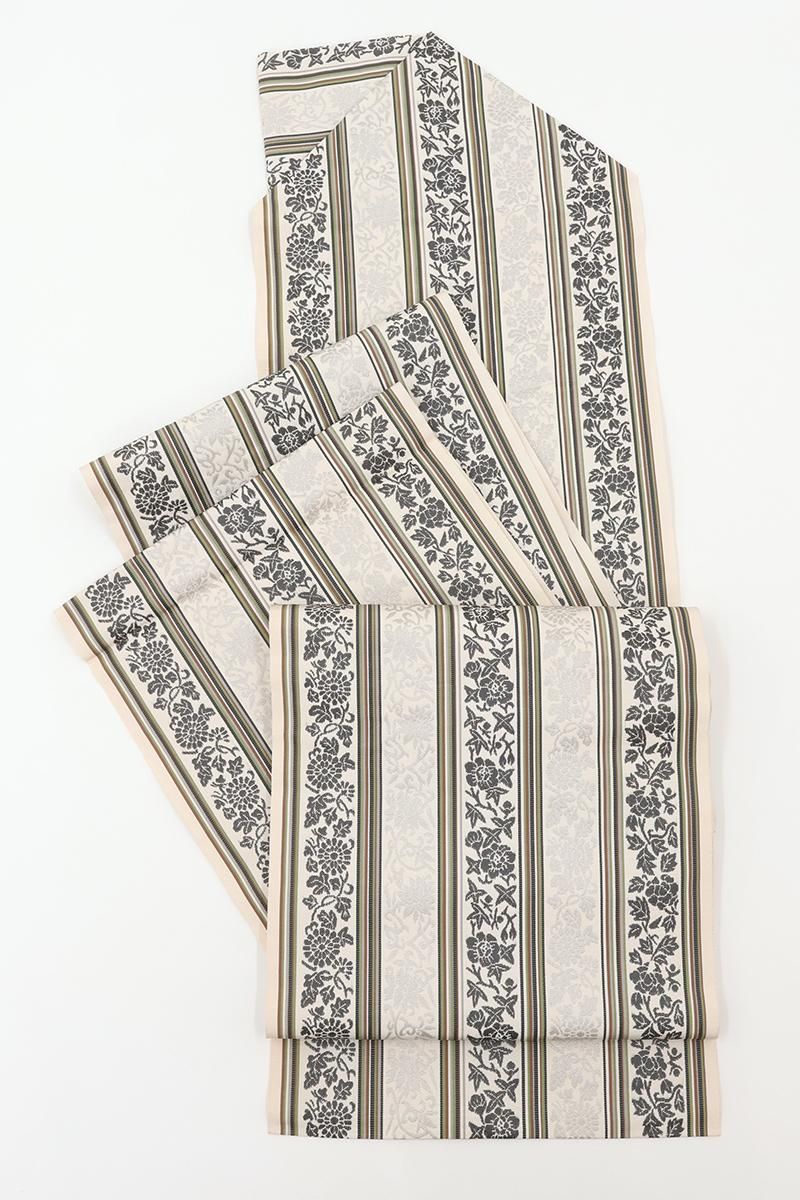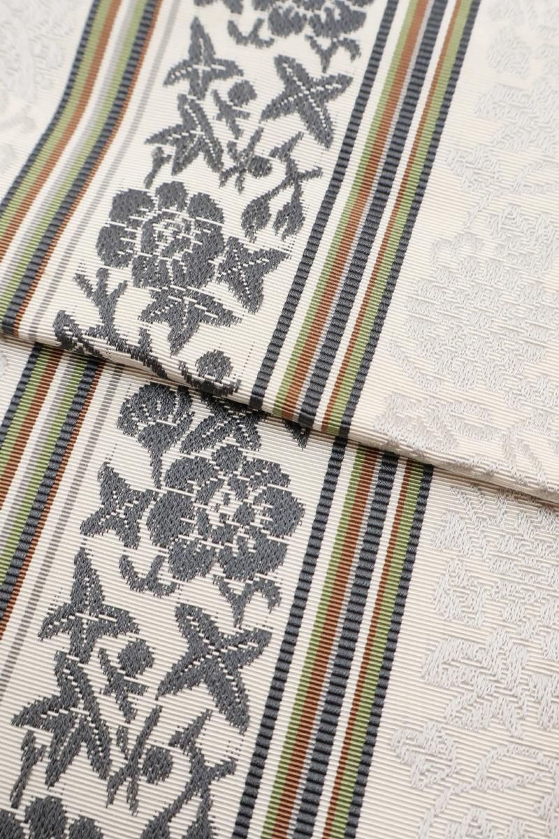こちらはぐっと色を薄めた薄香色が近いでしょうか、ベージュみを帯びた白色系の地に様々な花文を竪縞に配したお品、品良い華やぎで装いをしっとりと引き立ててくれることと思います。一年を通して重宝にお使いいただける博多の八寸は、出番の多いお品だけに素敵な色柄のものは複数揃えておきたいですね。小紋や紬などに合わせてちょっとしたお出かけなどにいかがでしょうか。
