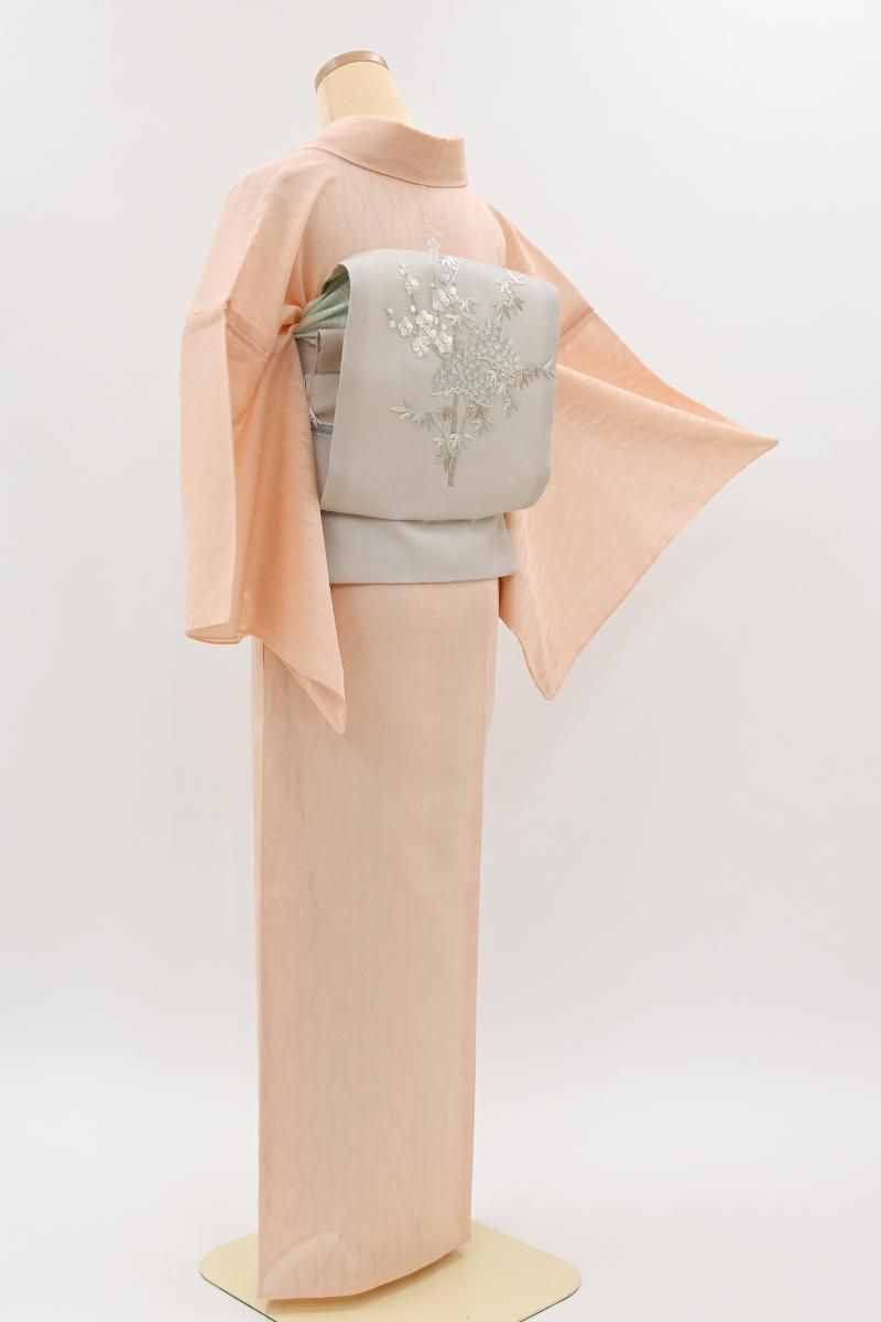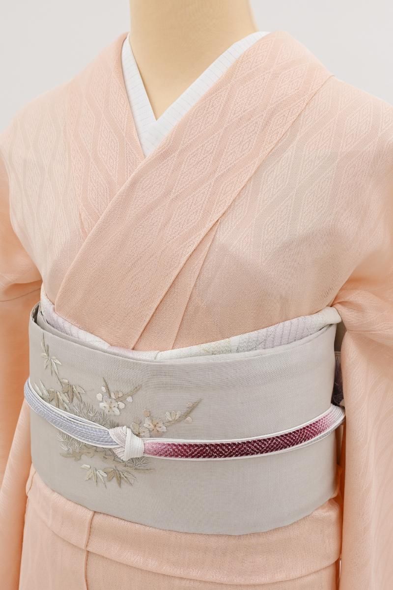 こちらは甘さのある優しいお色目が、装いを女性らしく華やかに引き立てるお品、透け感の豊かなさらりとした風合いが見る人の目にも涼やかですね。格高の名古屋帯から袋帯などを合わせ、改まったお席や集まりに重宝にお召しいただけることと思います。夏のお呼ばれにいかがでしょうか。