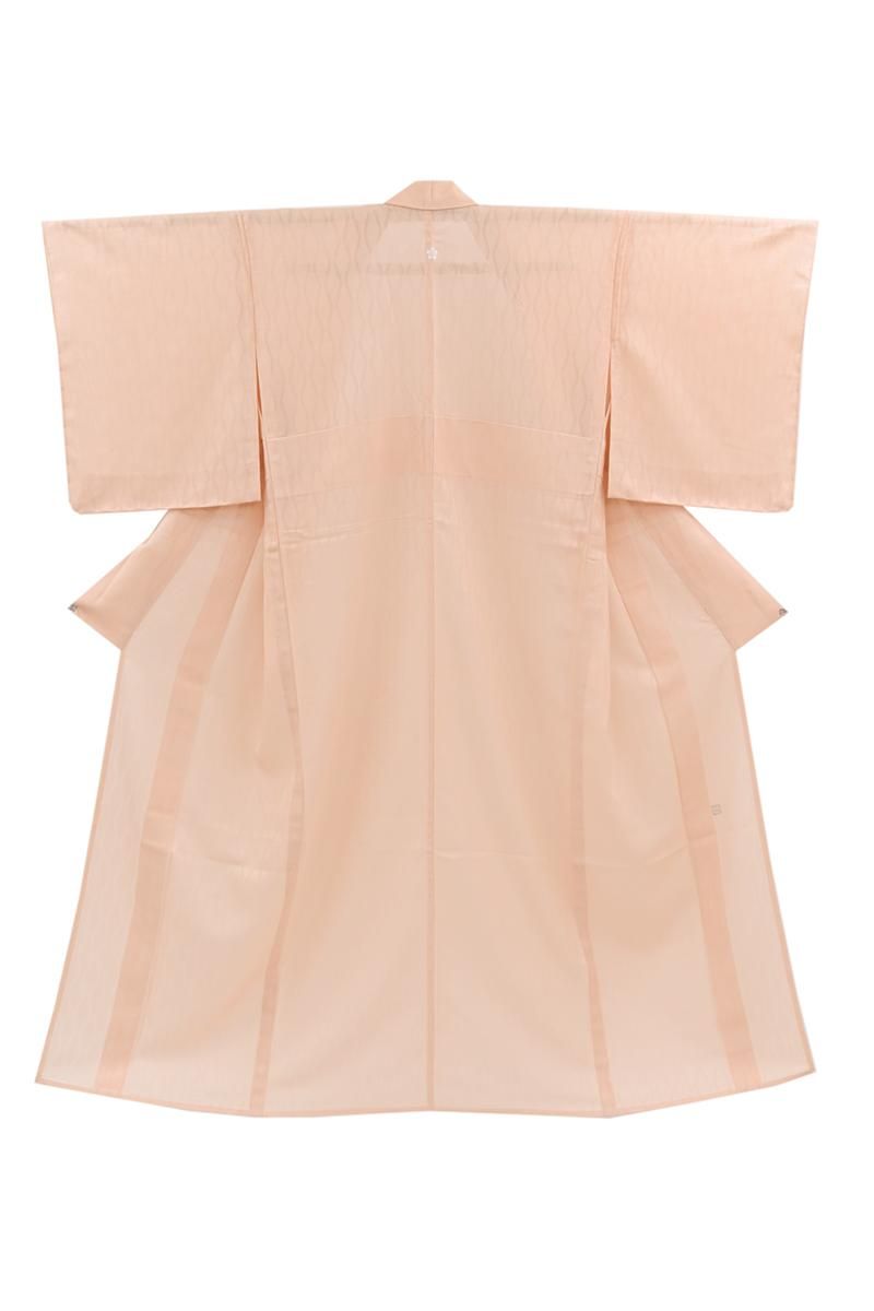 やや色を深めたシェルピンクが近いでしょうか、明るいサーモンピンクの地に菱の地紋の浮かぶ色無地です。