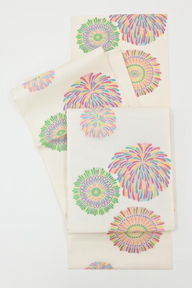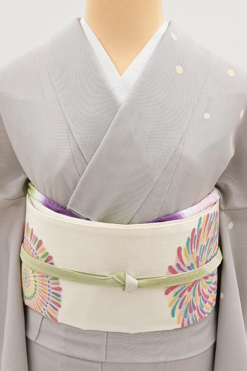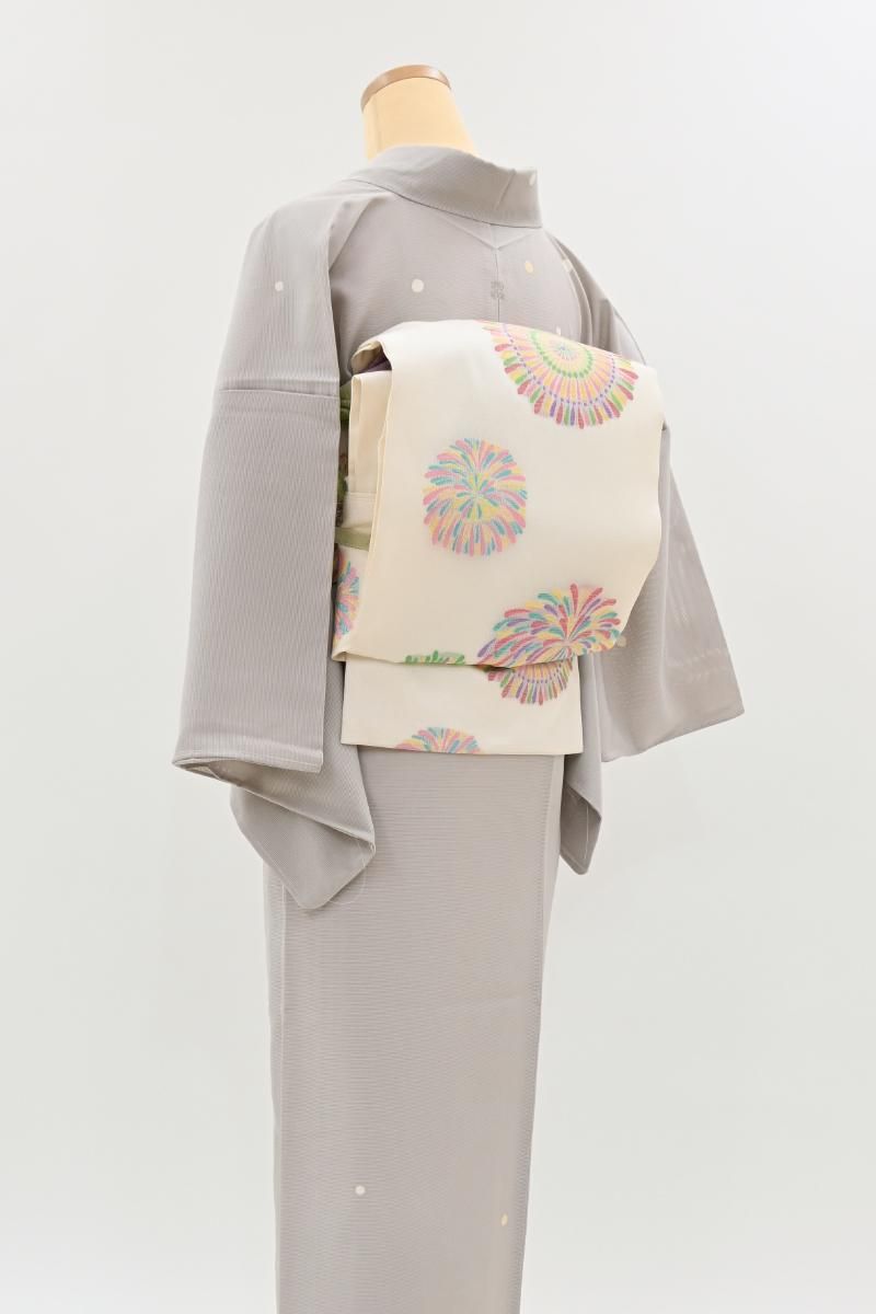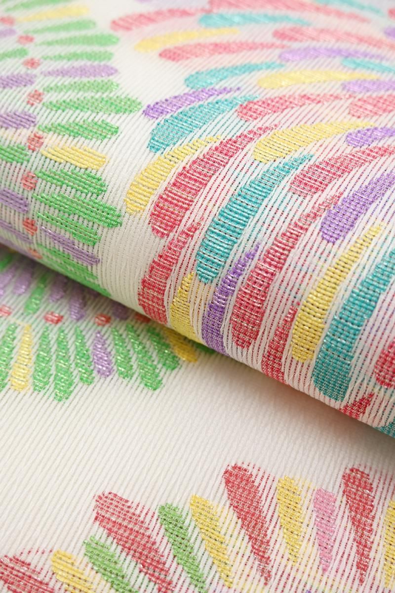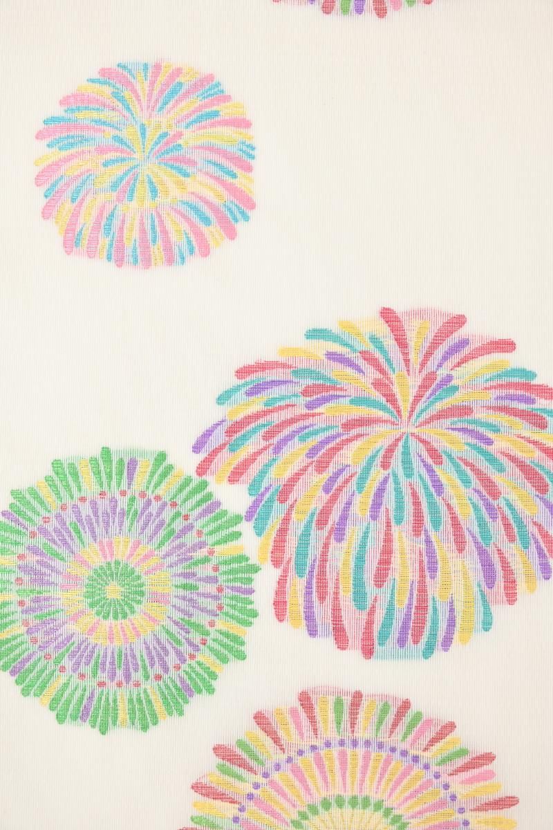 こちらはさっくりとした地風の白色の地に、大輪の花のような花火が織り出されたお品、打ち上げ花火はまさに夏の風物詩、色とりどりのラメ糸をふんだんに用いた華麗な景色が後ろ姿を鮮やかに、そして季節感豊かに彩ってくれることと思います。色無地から付下げ、訪問着などに合わせて、夏のお呼ばれやパーティなどのお席にいかがでしょうか。