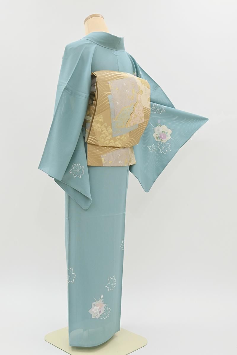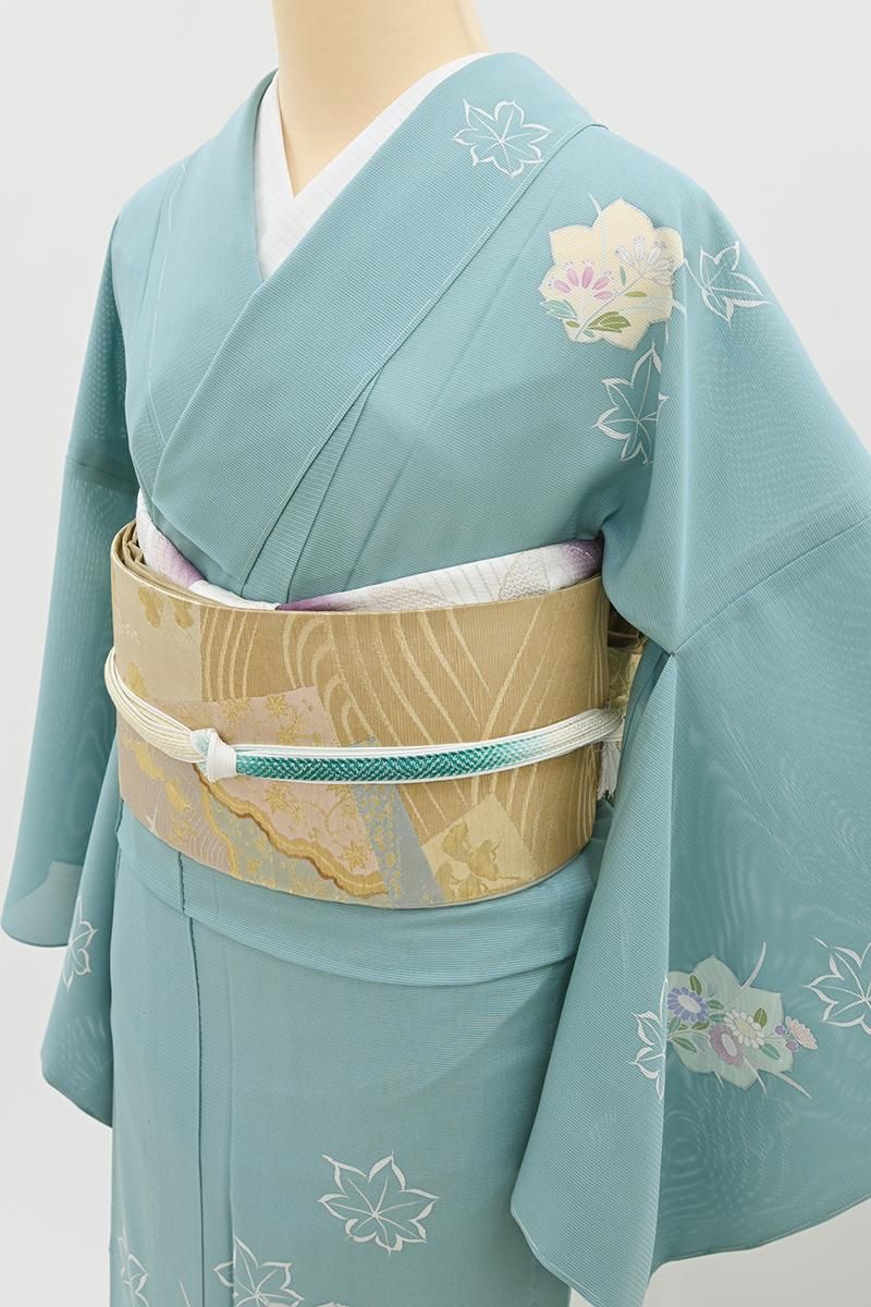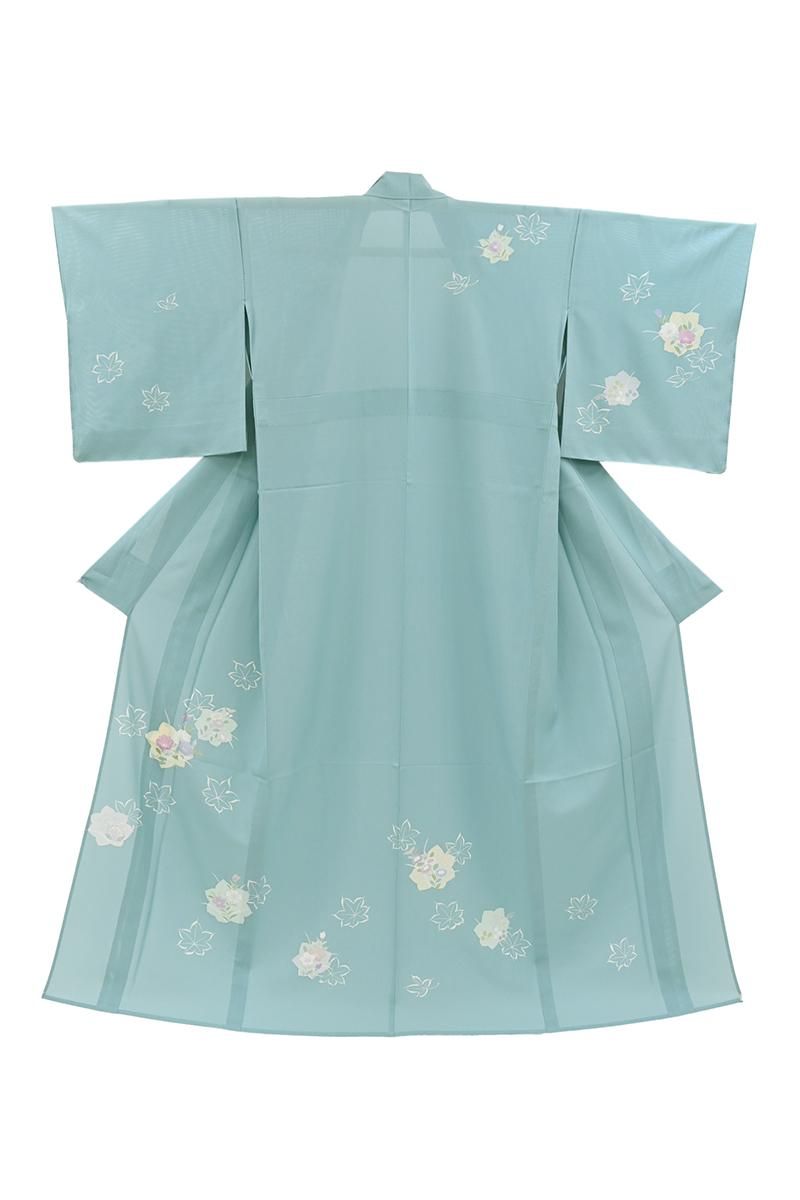 瓶覗色が近いでしょうか、ほんのり灰みを帯びた緑みの水色の地に、楓に秋草の図を描いた絽の付下げです。さらりとした地風の爽やかなお色目に、優美な色遣いで描かれた意匠が清涼感を運ぶお品、銀彩の煌めきがさりげない気品を添え、装いをはんなりと引き立ててくれることと思います。改まったお席やパーティ、お茶席などの場面に風情豊かな装いをお楽しみくださいませ。