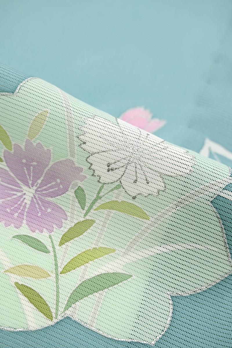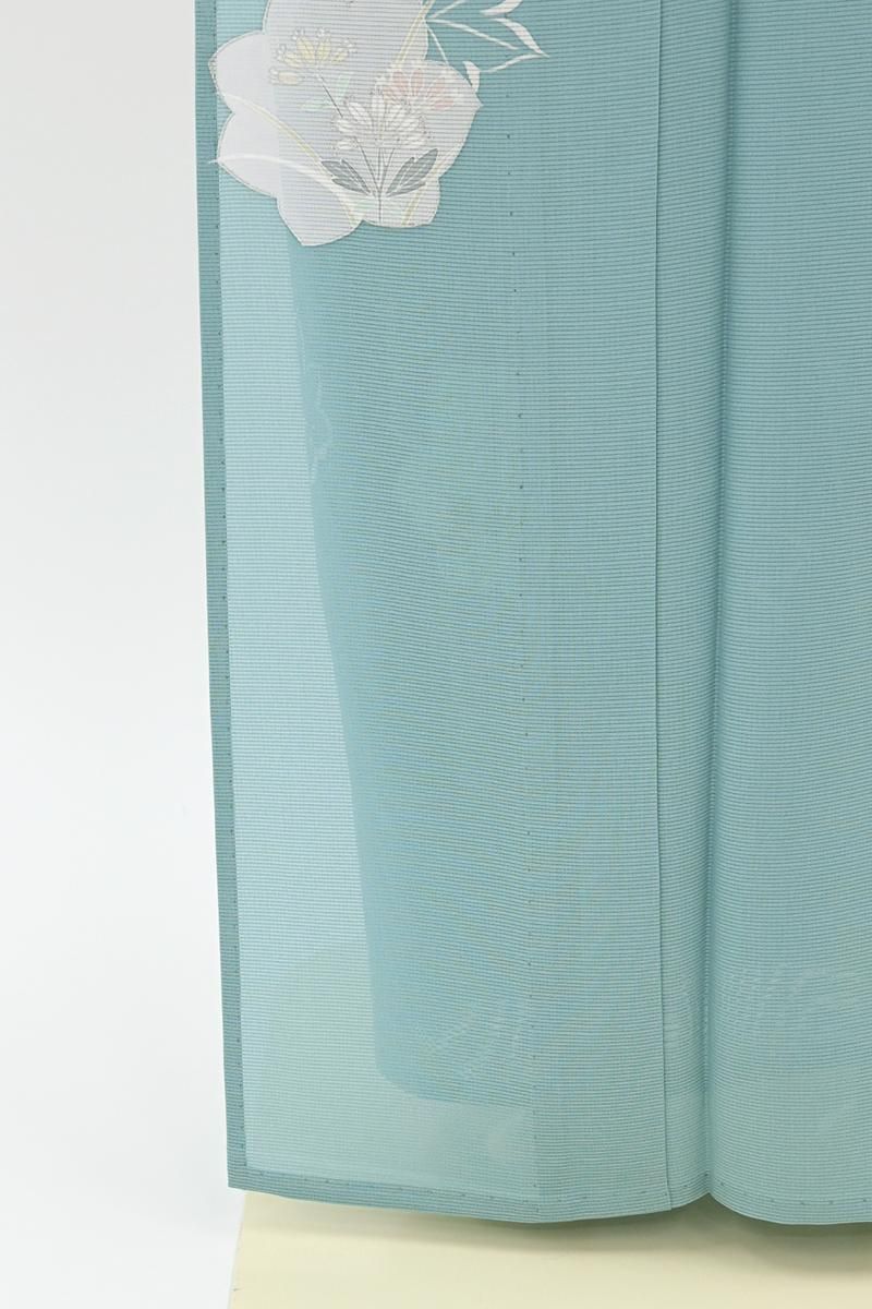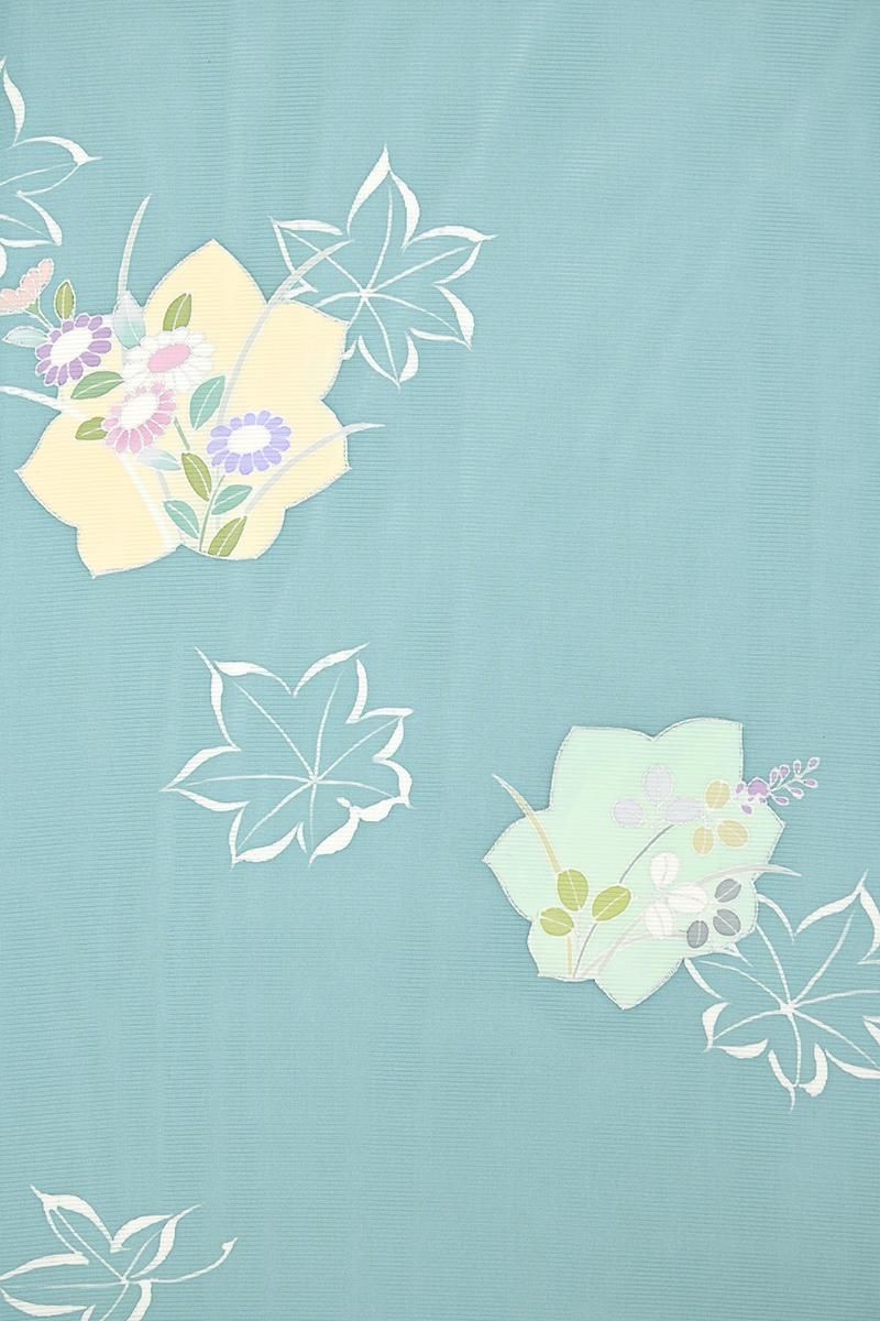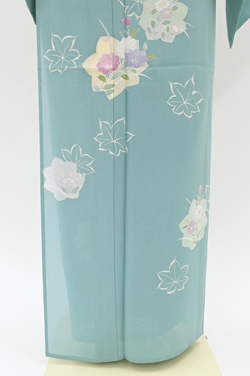 瓶覗色が近いでしょうか、ほんのり灰みを帯びた緑みの水色の地に、楓に秋草の図を描いた絽の付下げです。さらりとした地風の爽やかなお色目に、優美な色遣いで描かれた意匠が清涼感を運ぶお品、銀彩の煌めきがさりげない気品を添え、装いをはんなりと引き立ててくれることと思います。改まったお席やパーティ、お茶席などの場面に風情豊かな装いをお楽しみくださいませ。