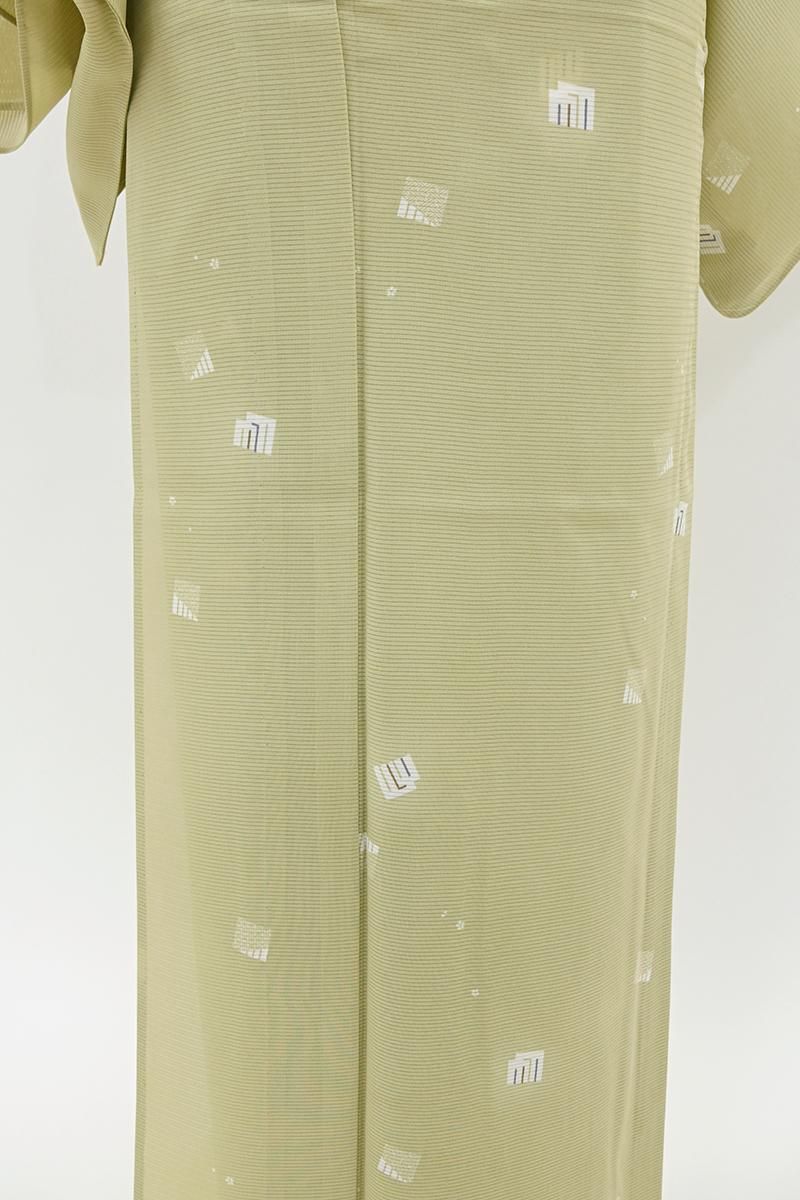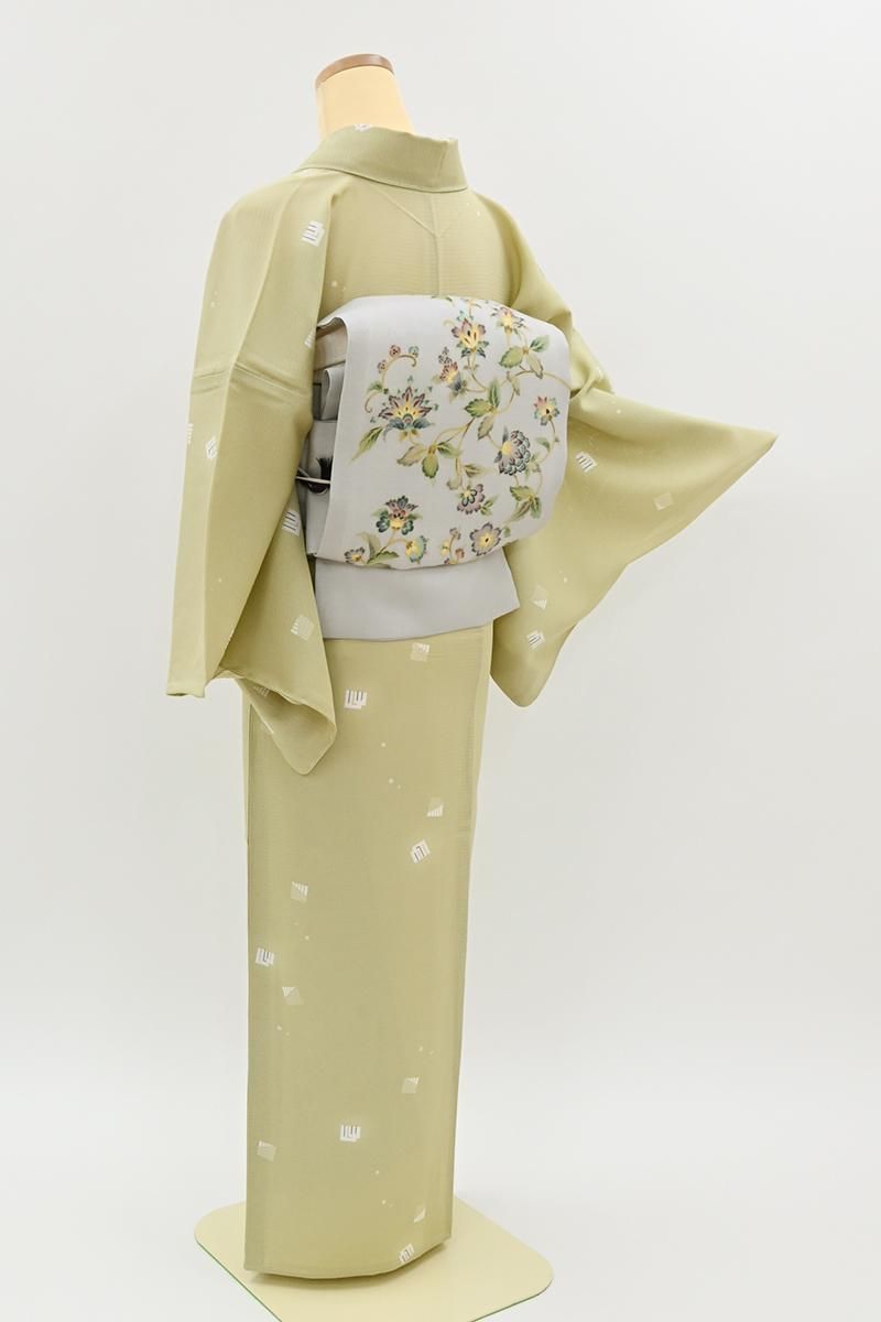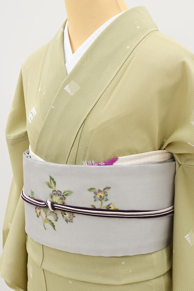 やや色を深めたねこやなぎ色が近いでしょうか、灰みの薄緑色の地に、源氏香やごく小さな花文を散らした絽の小紋です。さらりとした地風のやさしいお色目に、ごく控えめに配された意匠がはんなりと上品な印象のお品、無地場を多めにとった飛び柄ですので、季節の染め帯から軽めの袋帯まで帯合わせも幅広く、様々な場面に重宝いただけそうですね。お出かけやお稽古着に活躍してくれる一枚をこの機会にいかがでしょうか。