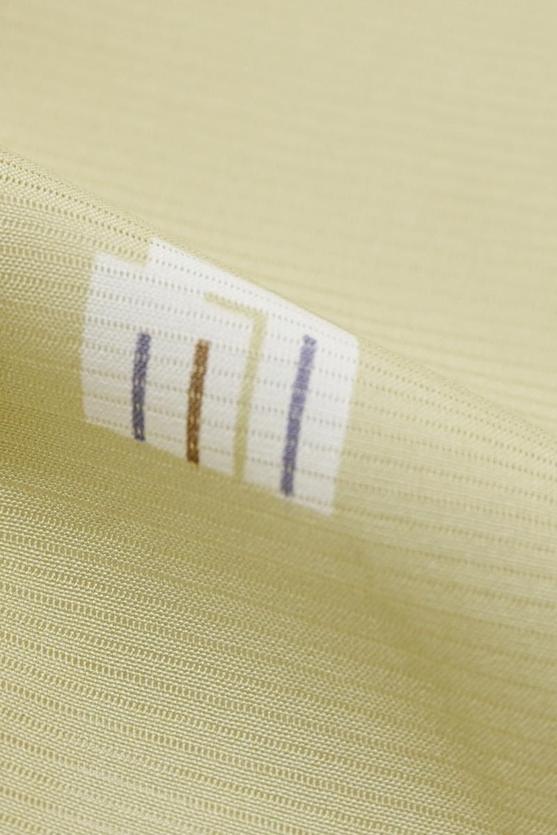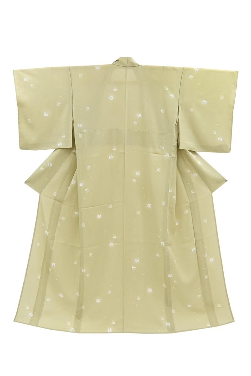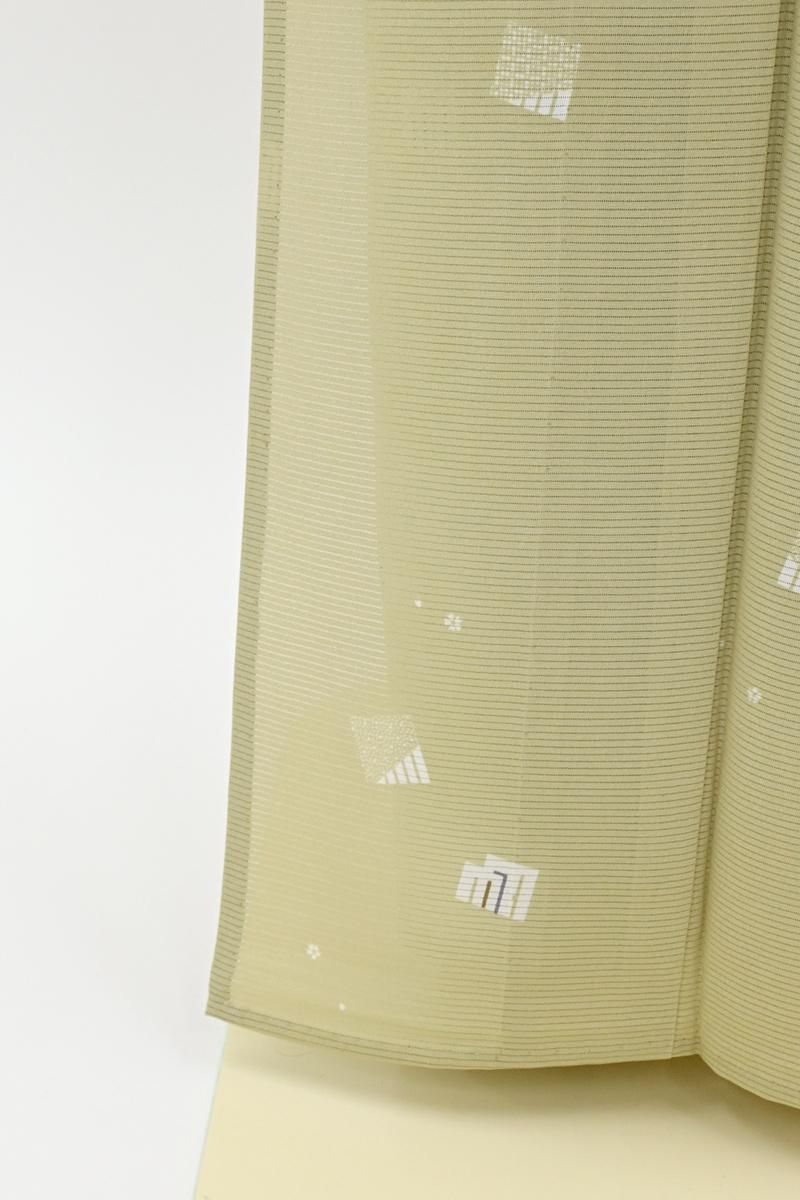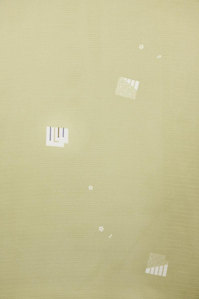 やや色を深めたねこやなぎ色が近いでしょうか、灰みの薄緑色の地に、源氏香やごく小さな花文を散らした絽の小紋です。さらりとした地風のやさしいお色目に、ごく控えめに配された意匠がはんなりと上品な印象のお品、無地場を多めにとった飛び柄ですので、季節の染め帯から軽めの袋帯まで帯合わせも幅広く、様々な場面に重宝いただけそうですね。お出かけやお稽古着に活躍してくれる一枚をこの機会にいかがでしょうか。