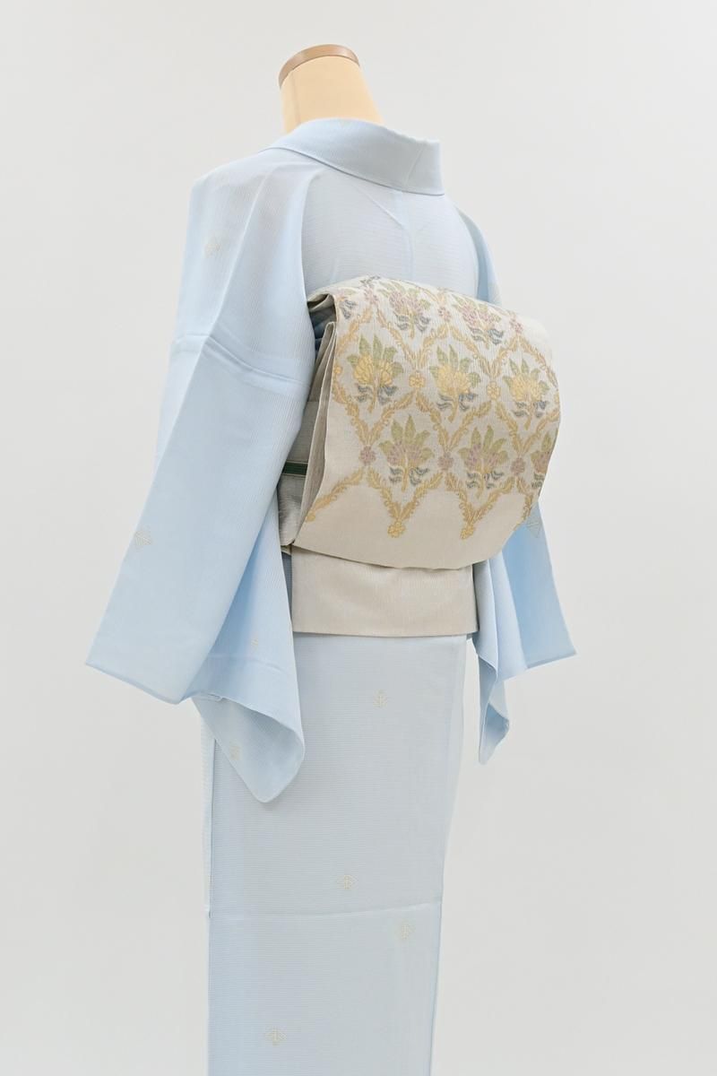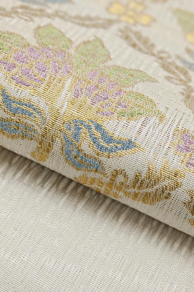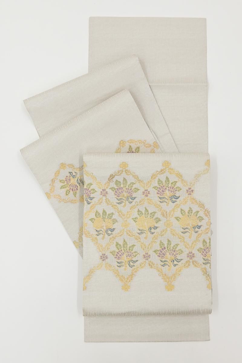 少し黄みを足した灰白色が近いでしょうか、ごく淡いグレーベージュの地に装飾的な花文を織り出した夏の袋帯です。