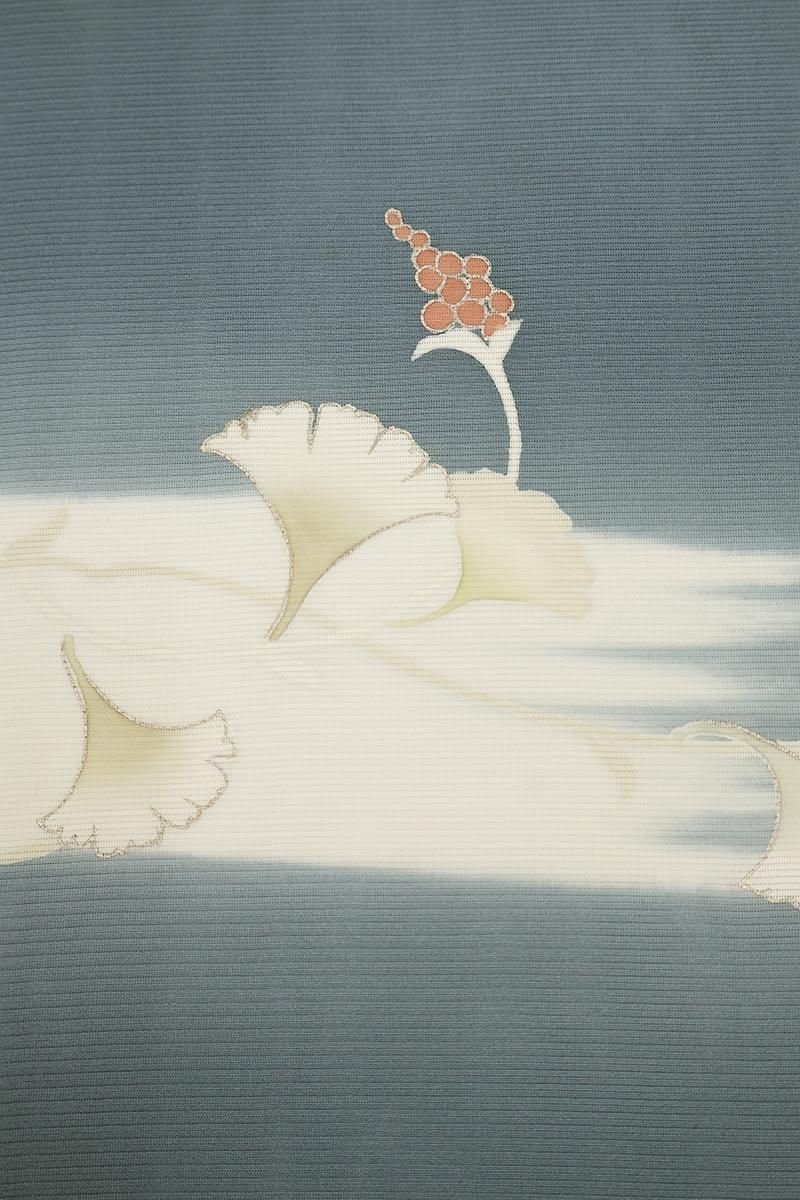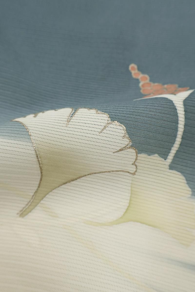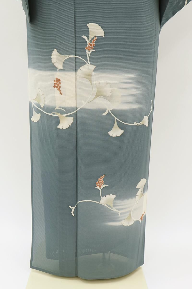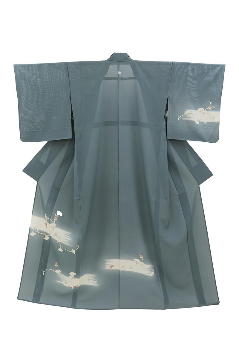 やや色を深めた浅葱鼠色が近いでしょうか、深いブルーグレー系の地に、霞暈かしに重ねて銀杏や葡萄の図を描いた絽の付下げです。さらりとした地風のシックなお色目に、控えめに配された意匠が秋らしい風情を添えるお品、柄を縁取る金彩のきらめきがさりげない気品を添え、装いをしっとりと引き立ててくれることと思います。様々な帯合わせで夏のお呼ばれやお茶席などにいかがでしょうか。