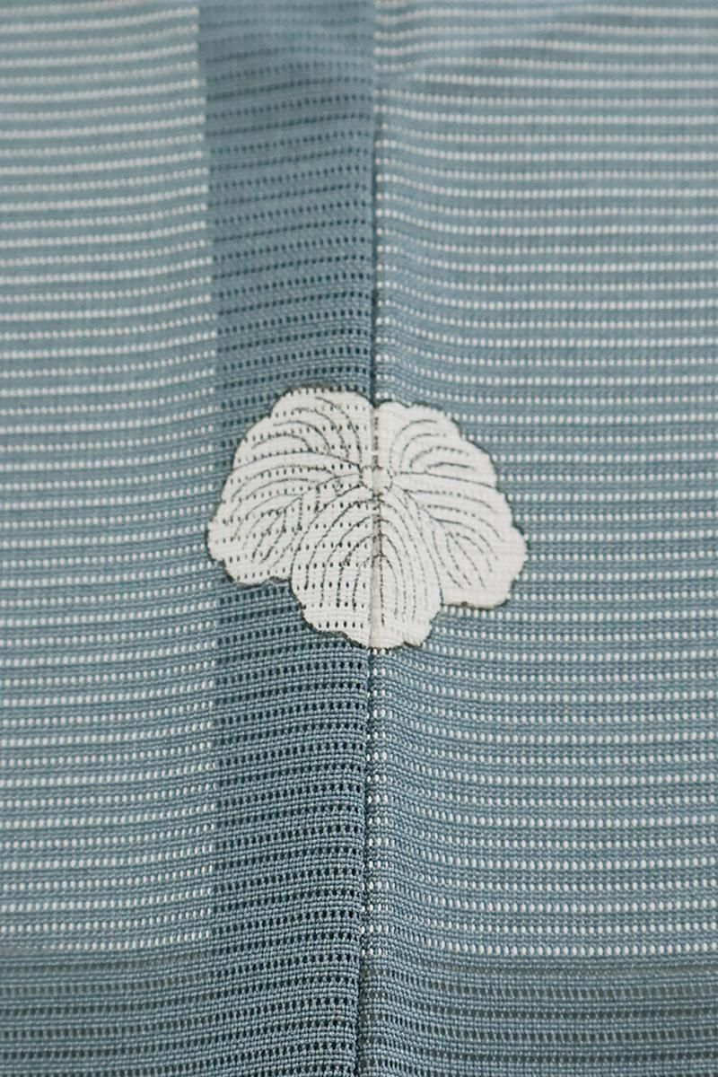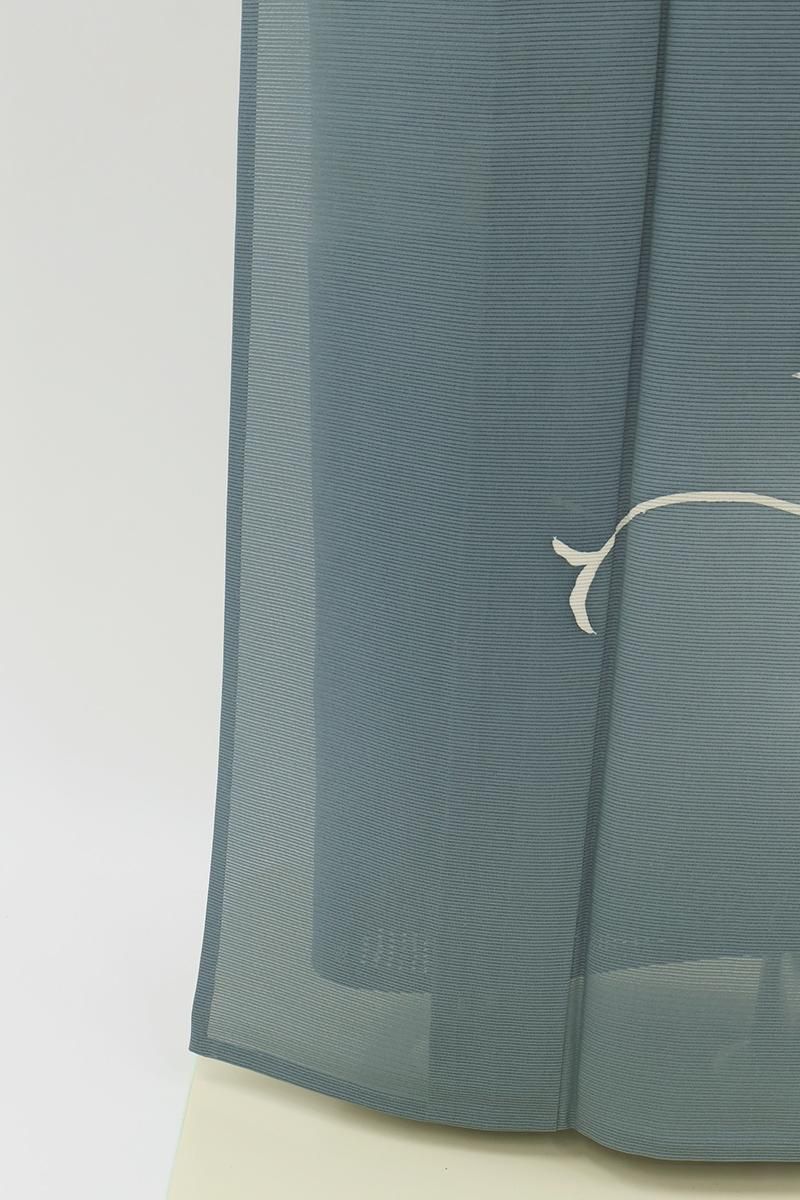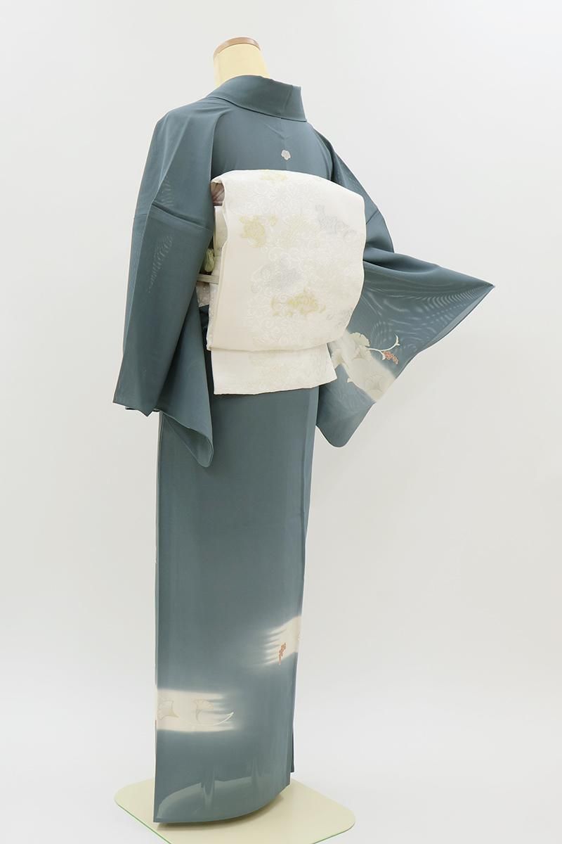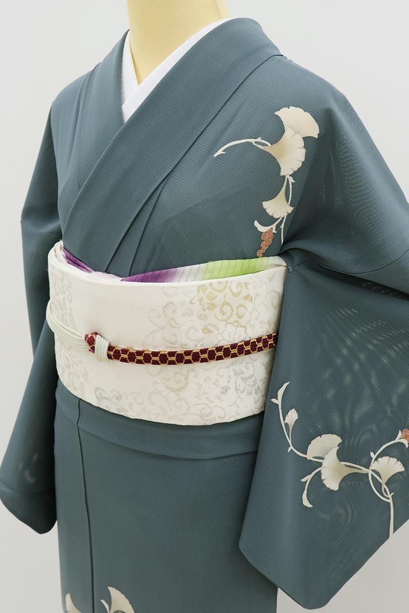 やや色を深めた浅葱鼠色が近いでしょうか、深いブルーグレー系の地に、霞暈かしに重ねて銀杏や葡萄の図を描いた絽の付下げです。さらりとした地風のシックなお色目に、控えめに配された意匠が秋らしい風情を添えるお品、柄を縁取る金彩のきらめきがさりげない気品を添え、装いをしっとりと引き立ててくれることと思います。様々な帯合わせで夏のお呼ばれやお茶席などにいかがでしょうか。