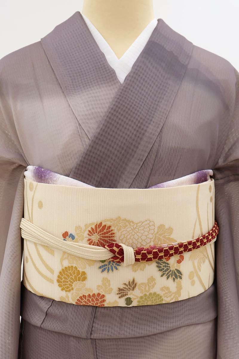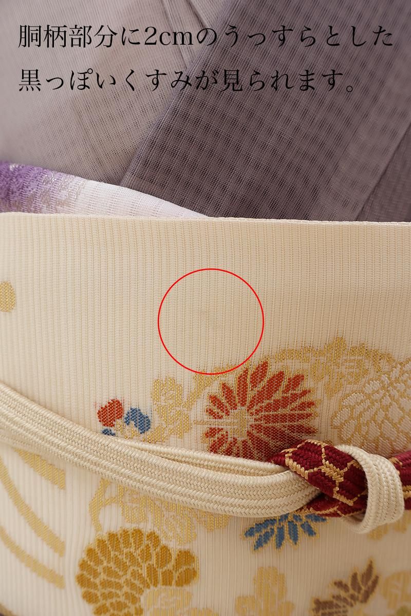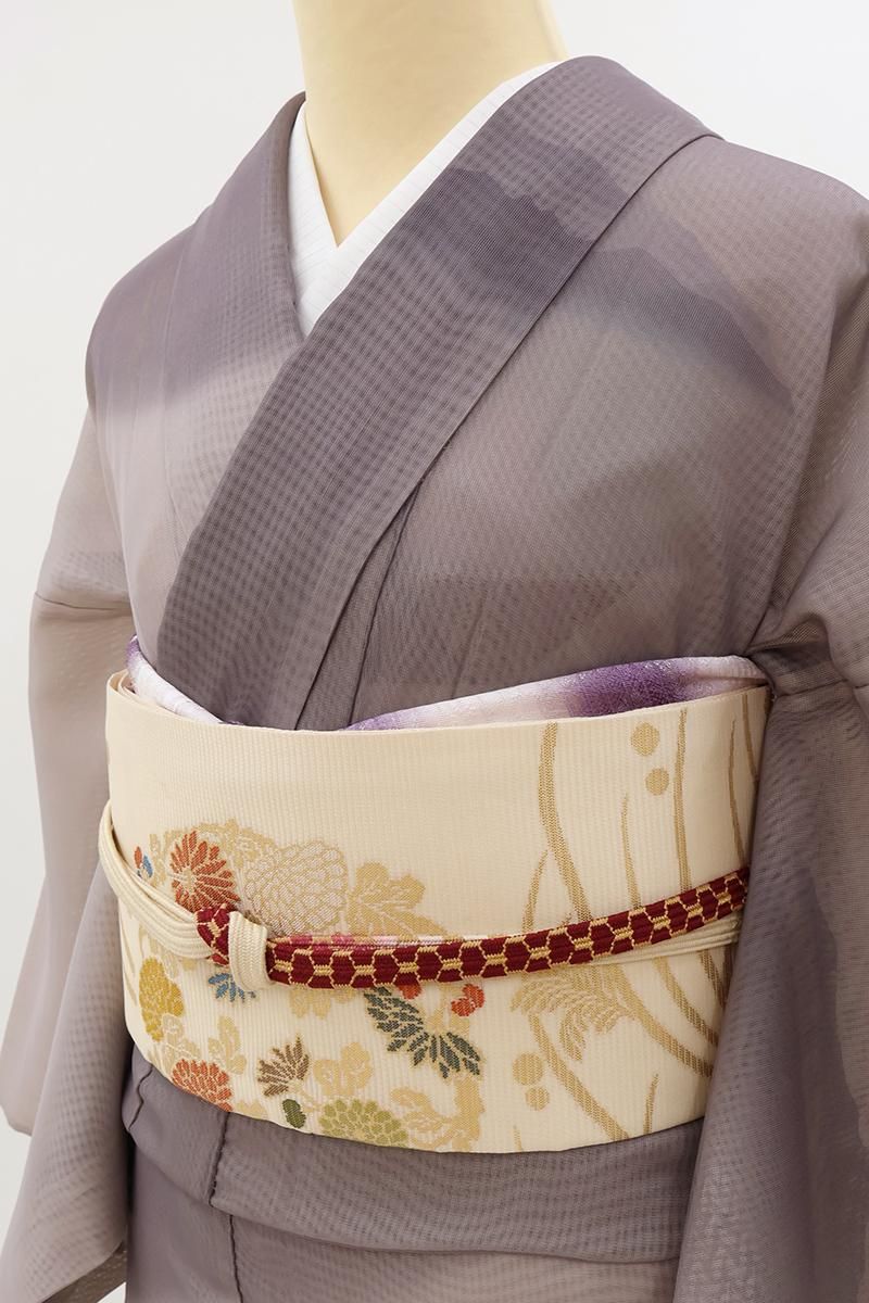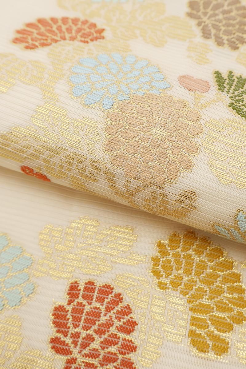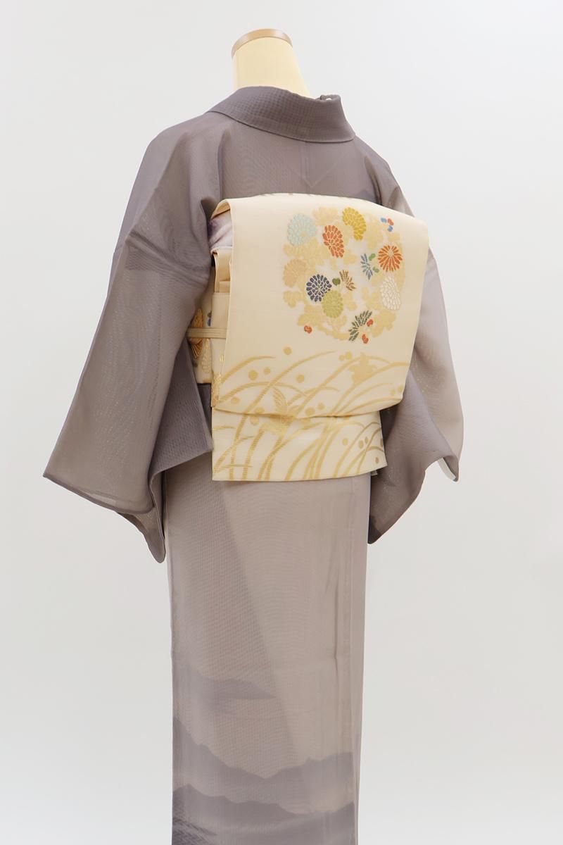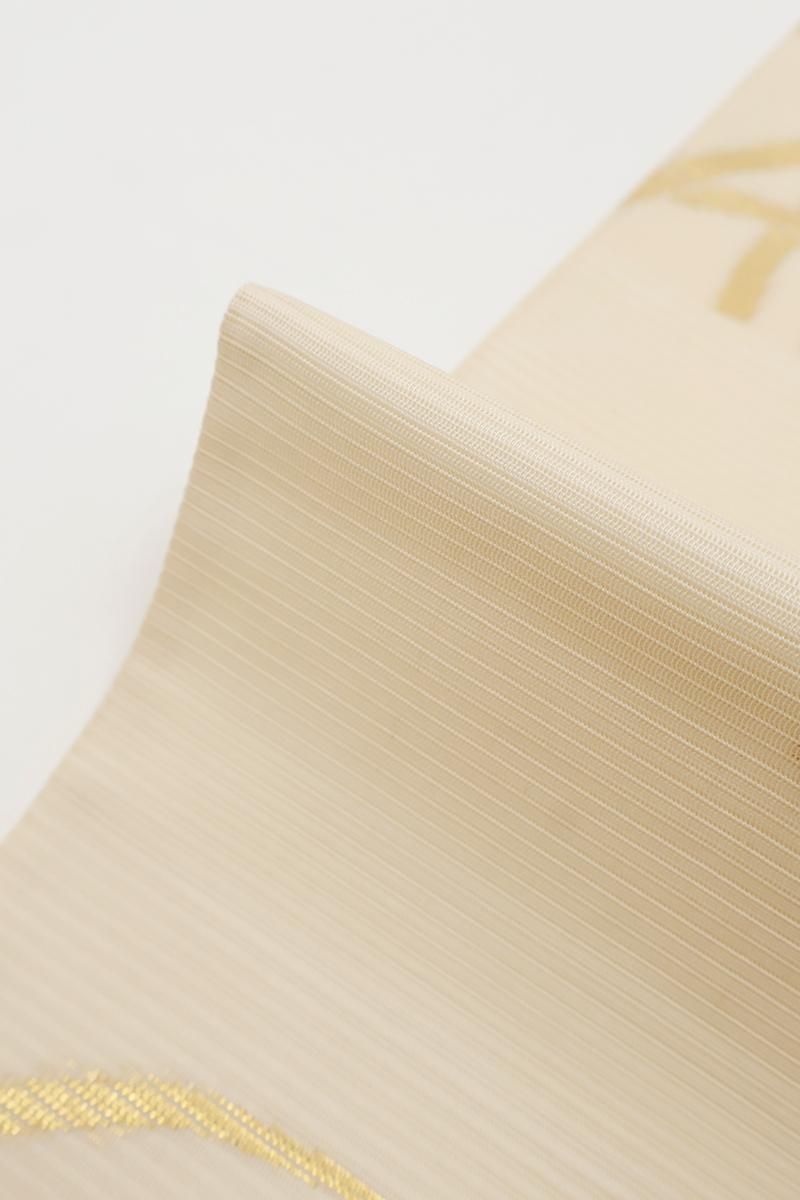 透け感のあるさっくりとした地風に、ふんだんな金糸とモダンな色遣いで表現された意匠が後ろ姿を優雅に彩るお品、 甘さと気品を兼ね備えた色柄ゆきは装いに楚々とした華やぎを添えて引き立ててくれることと思います。色無地や付下げ、訪問着などに合わせて夏の晴れやかなお席にいかがでしょうか。