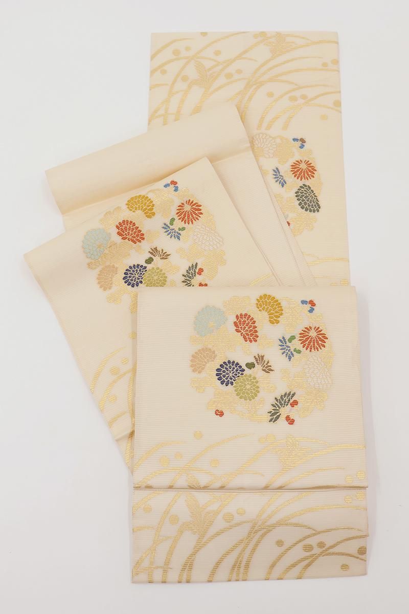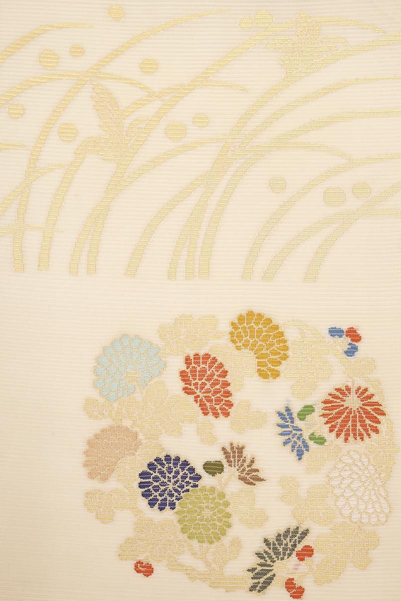 鳥の子色が近いでしょうか、淡いベージュの地に、露芝に菊の丸を織りだした絽の袋帯です。