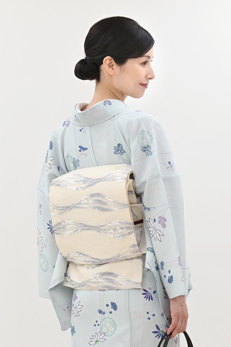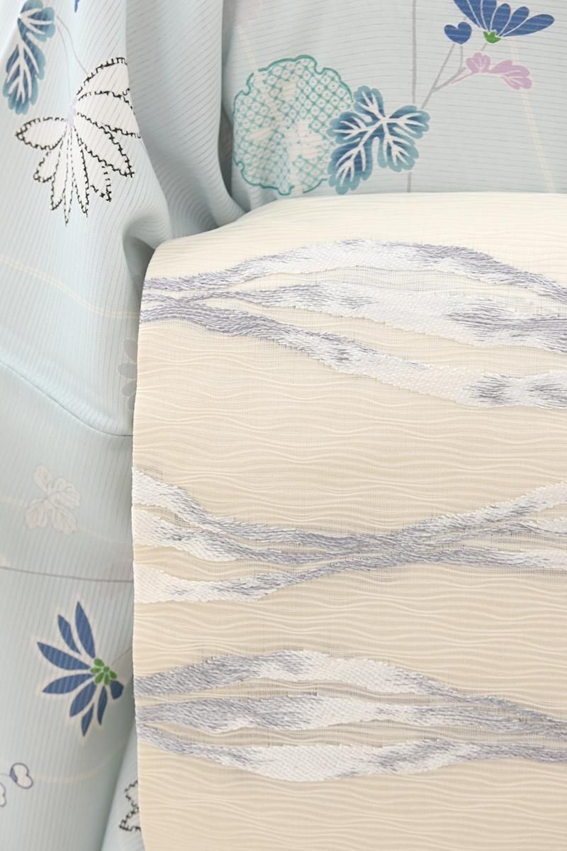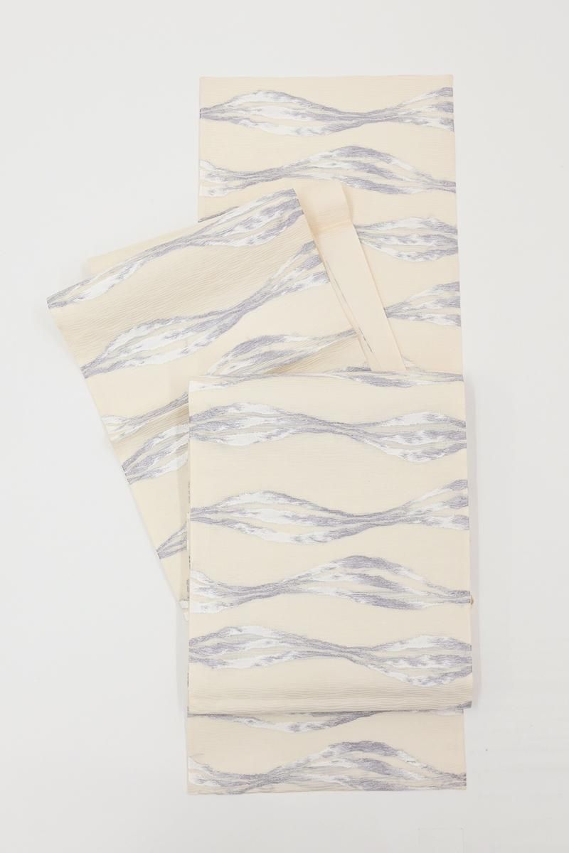こちらは透け感豊かなさっくりとした白色の地に、波のような抽象文を織りだしたお品、涼やかな色遣いで表現された意匠が装いをすっきりと引き立ててくれることと思います。シンプルでモダンな色柄ゆきは格高の小紋から付下げ、江戸小紋や色無地など幅広い装いに合わせて、様々な場面で活躍してくれることと思います。この機会にいかがでしょうか。