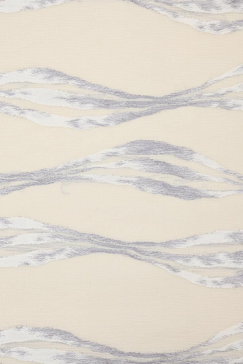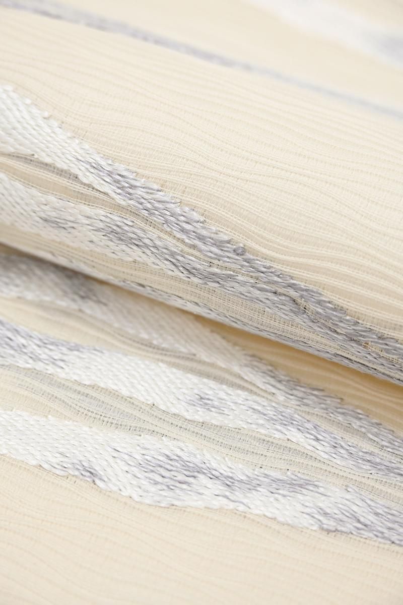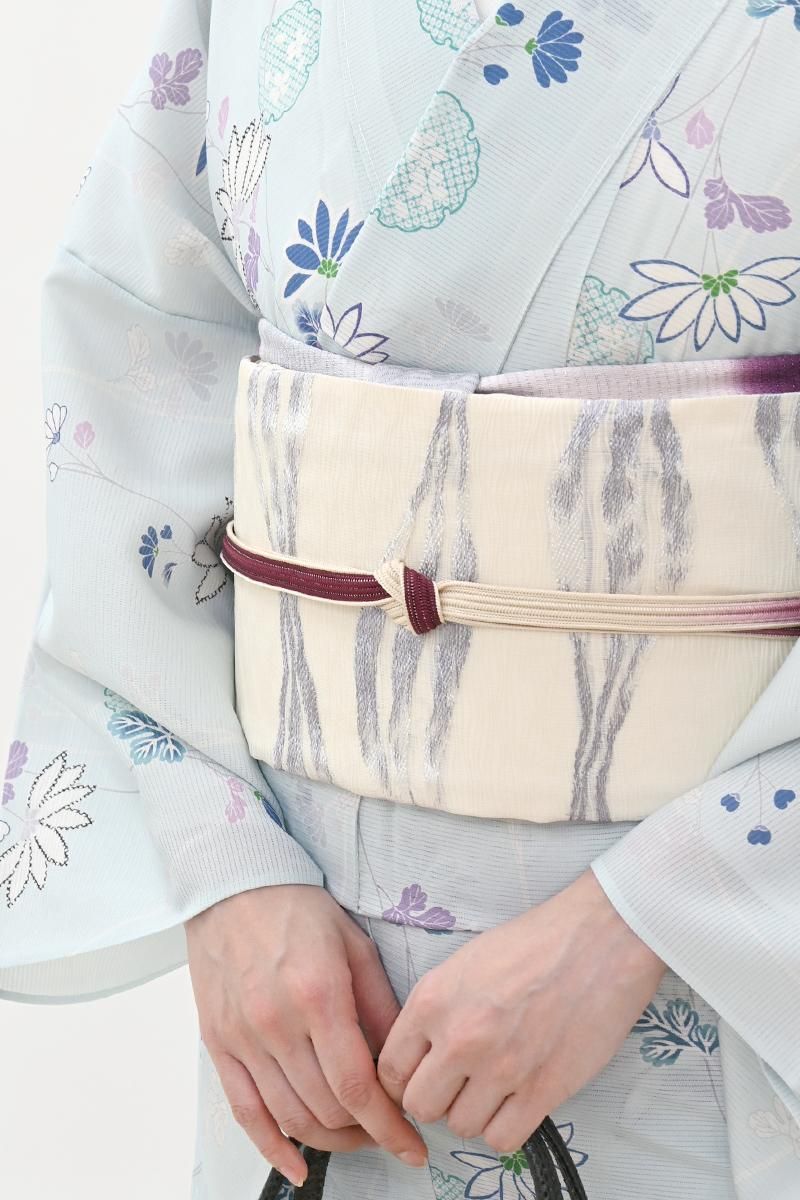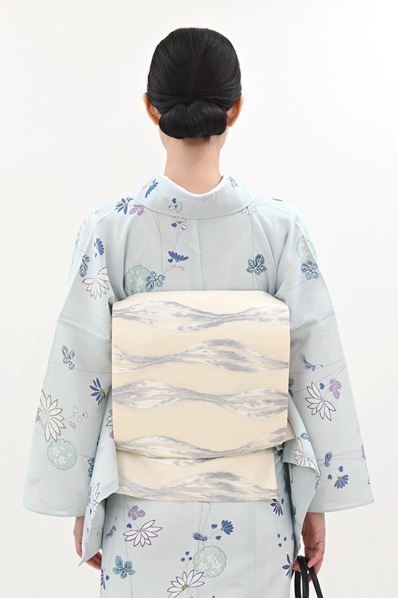 こちらは透け感豊かなさっくりとした白色の地に、波のような抽象文を織りだしたお品、涼やかな色遣いで表現された意匠が装いをすっきりと引き立ててくれることと思います。シンプルでモダンな色柄ゆきは格高の小紋から付下げ、江戸小紋や色無地など幅広い装いに合わせて、様々な場面で活躍してくれることと思います。この機会にいかがでしょうか。