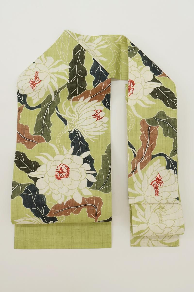こちらはほのかに灰みを含んださっくりと軽やかな黄緑色の地に、大らかに月下美人の図が配されたお品、ダイナミックな柄行きを朗らかな印象のお色目がモダンに引き立てていますね。よそ行きの浴衣から麻着物、夏紬などに合わせていかがでしょうか。