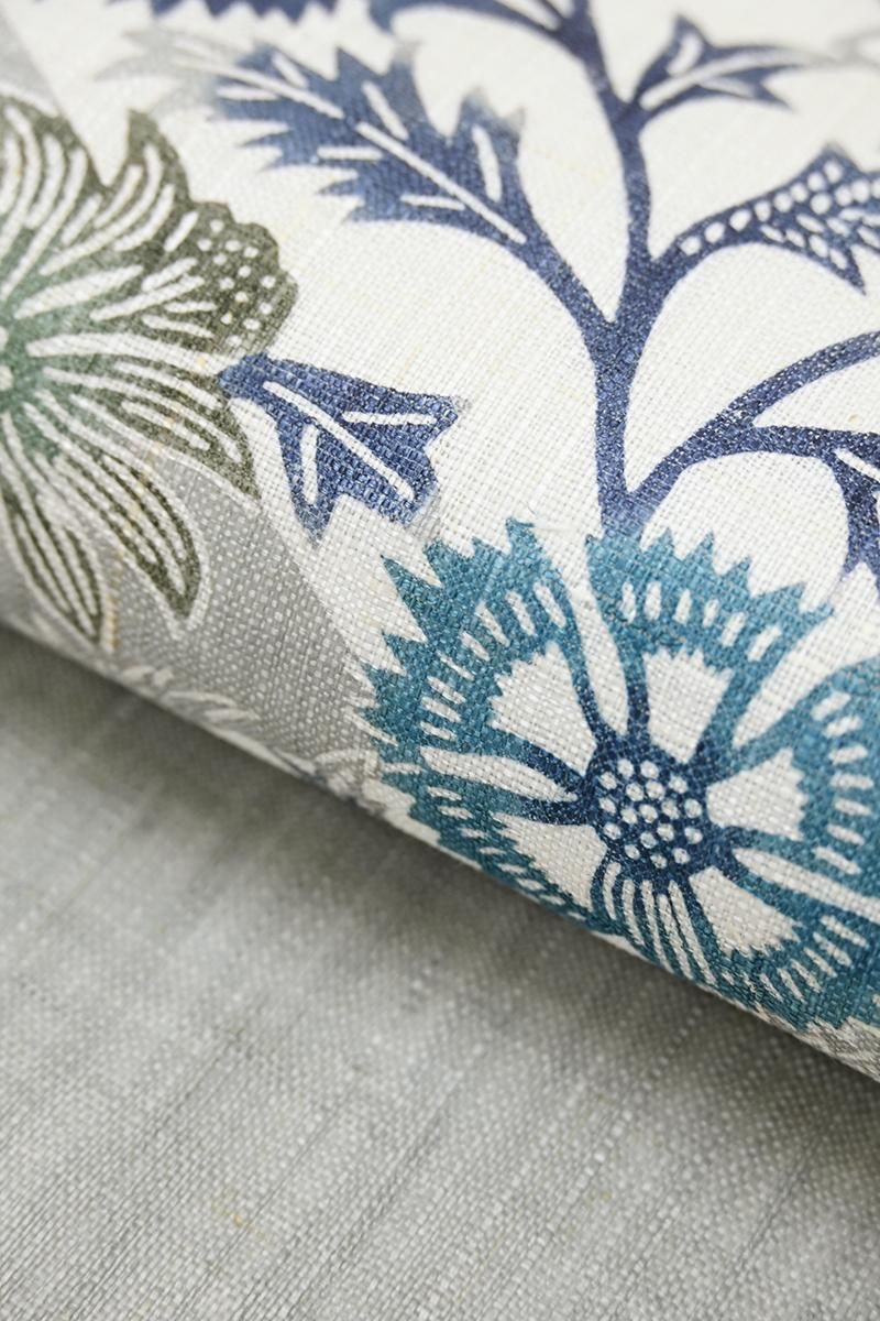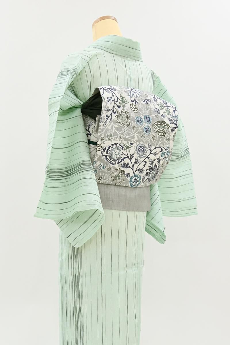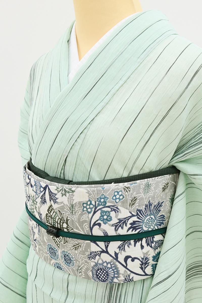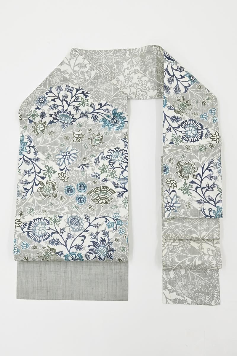 京都の山懐にて和染紅型の名で洗練された型染めの着物や帯を創り続ける「栗山工房」製の型染名古屋帯です。こちらは銀鼠色が近いでしょうか、淡いグレーの麻地に、清涼感のある彩りで更紗文が表現されたお品、さりげない個性の光るお柄をざっくりと涼感のある大麻素材の風合いが引き立て、モダンな洒落味を感じさせますね。 紬や小紋などに合わせて、夏のカジュアルな装いにいかがでしょうか。