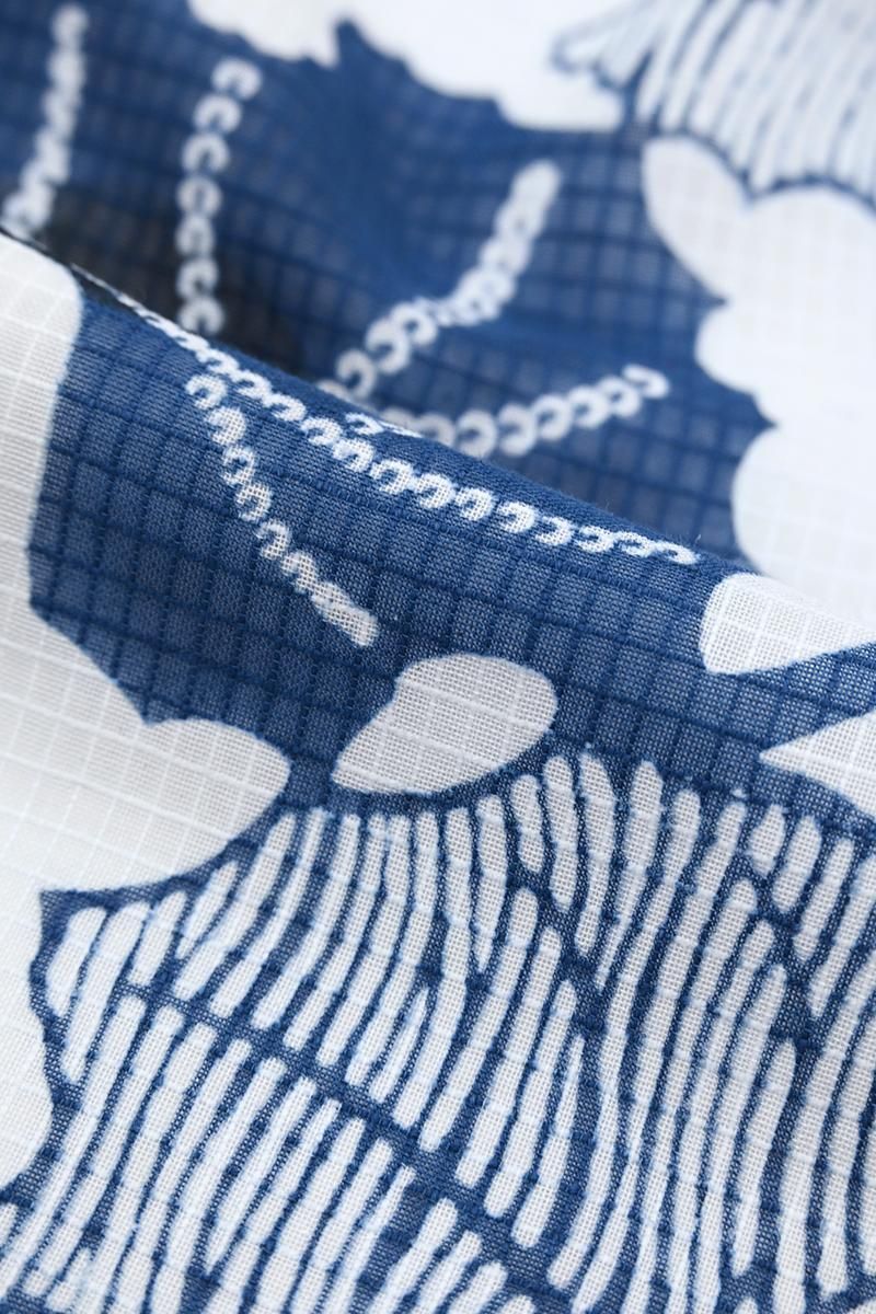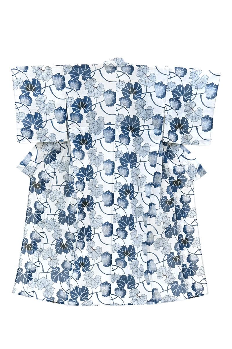 こちらはすっきりとした白色の地に、柔らかな紺色で蕗の図をおおらかに染めたお品、二種類の木綿糸で細やかな格子が織り上げられた綿紅梅素材はシャリ感と程よい透け感で涼やかな着心地をお楽しみいただけます。浴衣感覚の気軽な装いは勿論のこと、半衿と足袋に名古屋帯を合わせて少しきちんと感のある装いも素敵ですね。この夏のお支度にいかがでしょうか。
