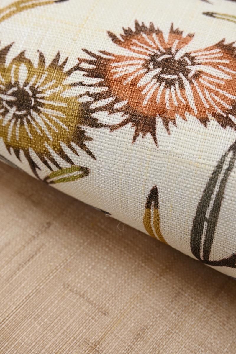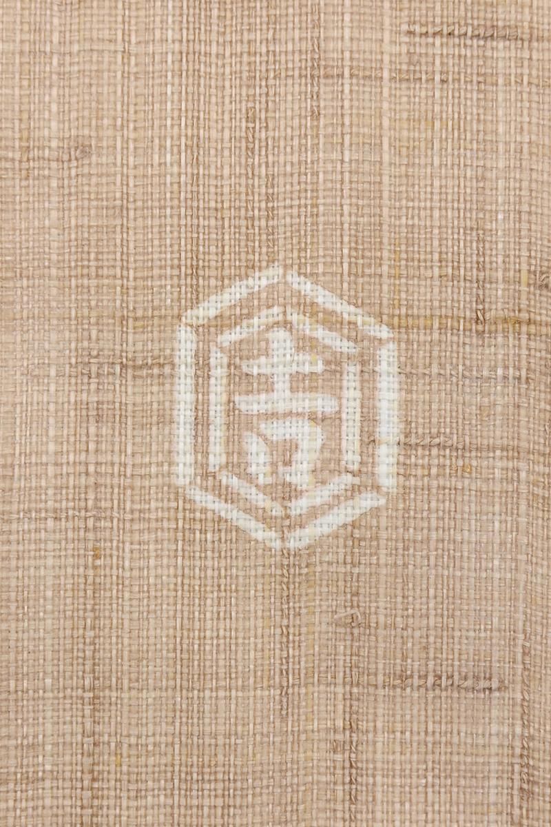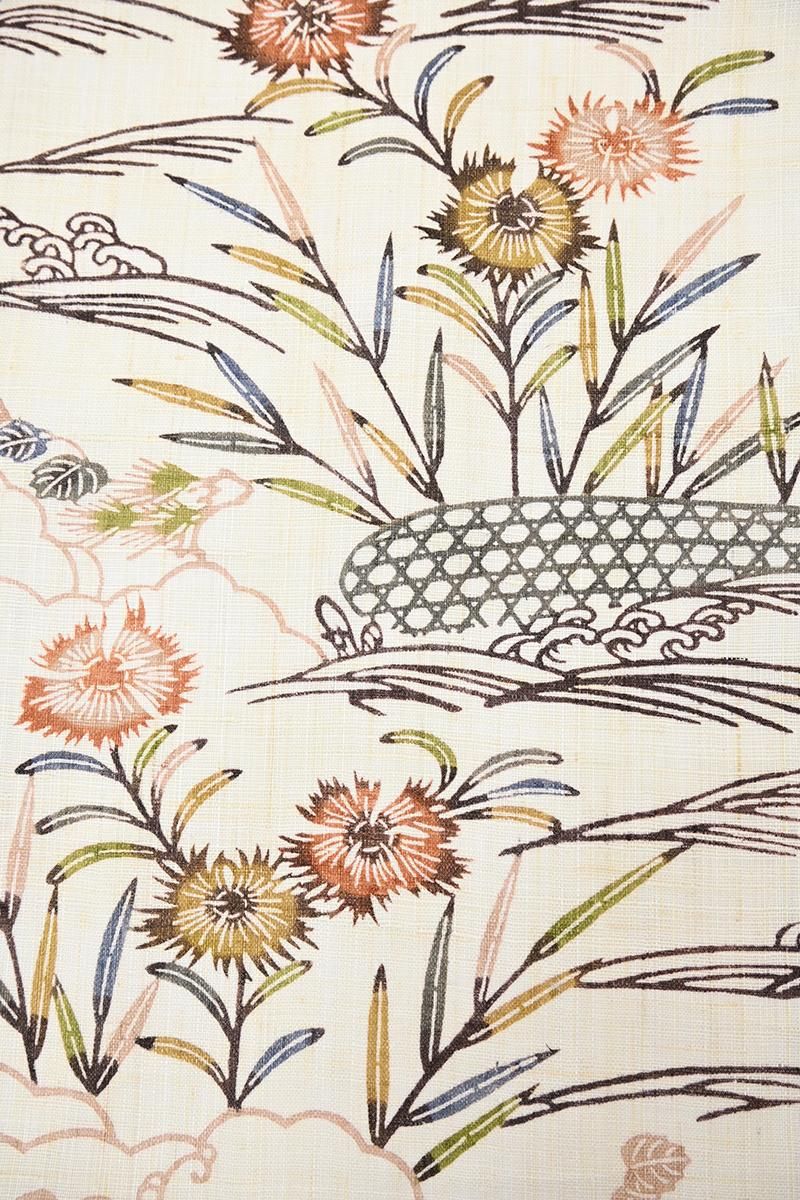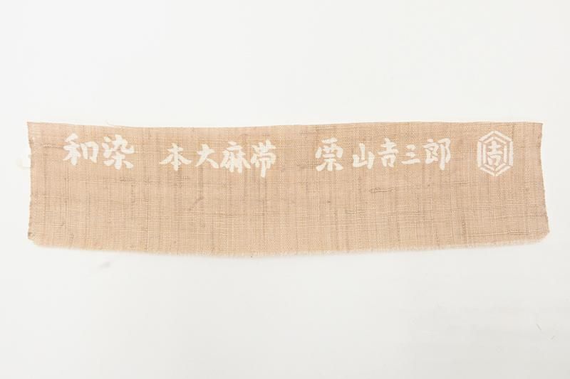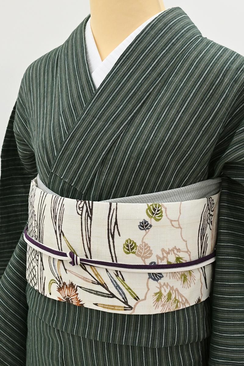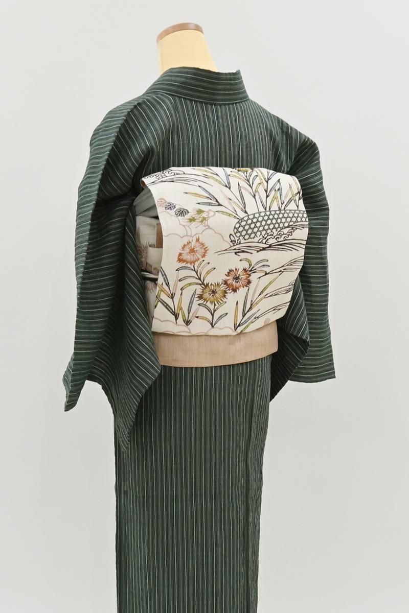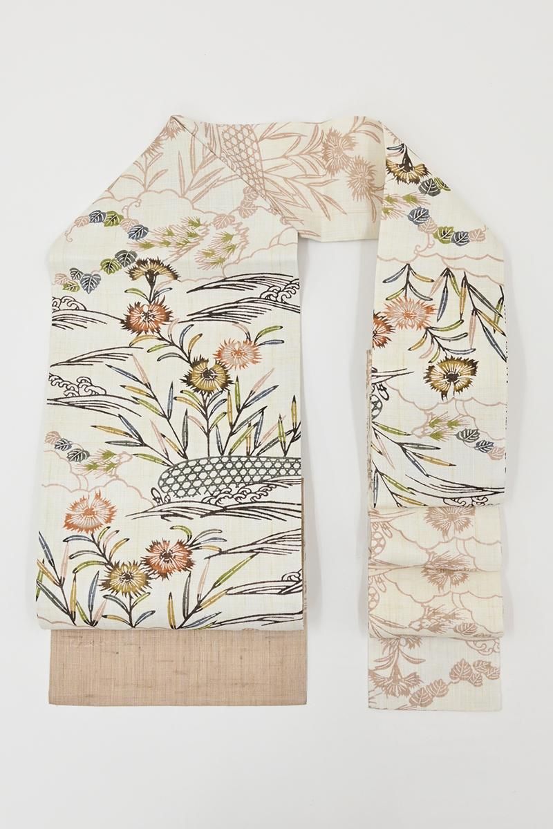 京都の山懐にて和染紅型の名で洗練された型染めの着物や帯を創り続ける「栗山工房」製の麻地の型染名古屋帯です。こちらはざっくりとした風合いの白色系の麻地に、モダンな彩りで蛇籠の置かれた水辺に撫子などを配したお品、程よく落ち着いた彩りの冴えが、栗山工房さんらしい存在感を備えていますね。よそゆきの浴衣から夏紬、小紋などに合わせてすっきりと趣味性豊かな装いをお楽しみくださいませ。
