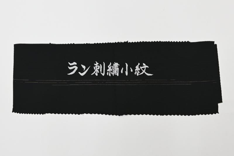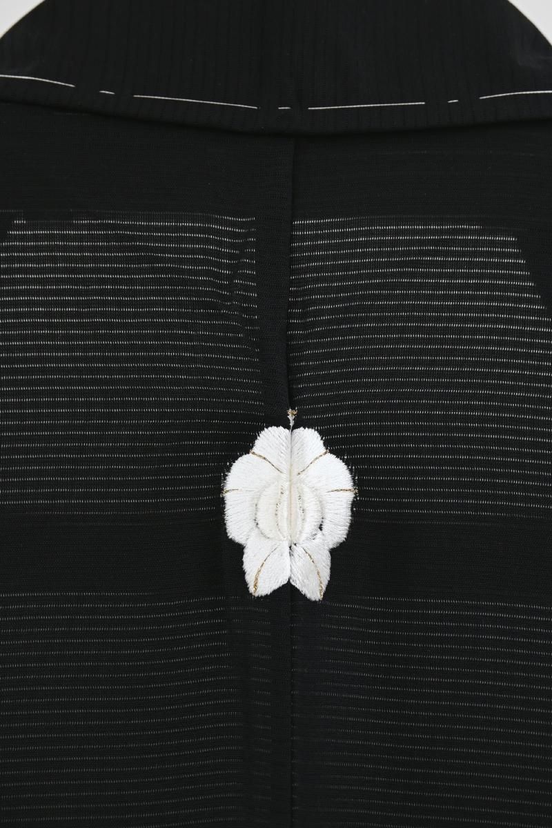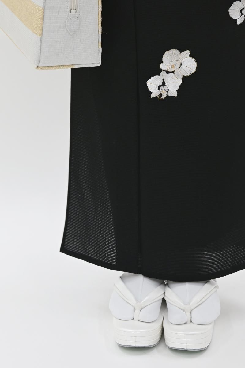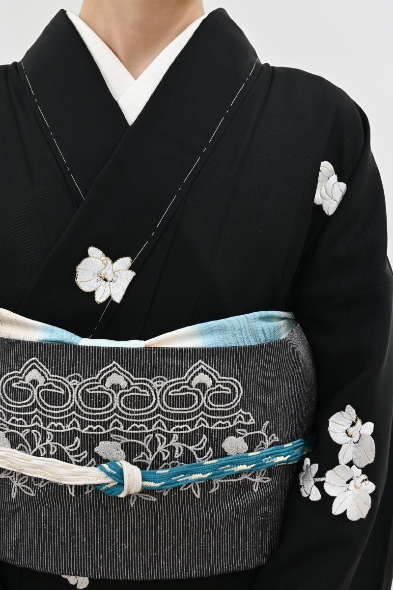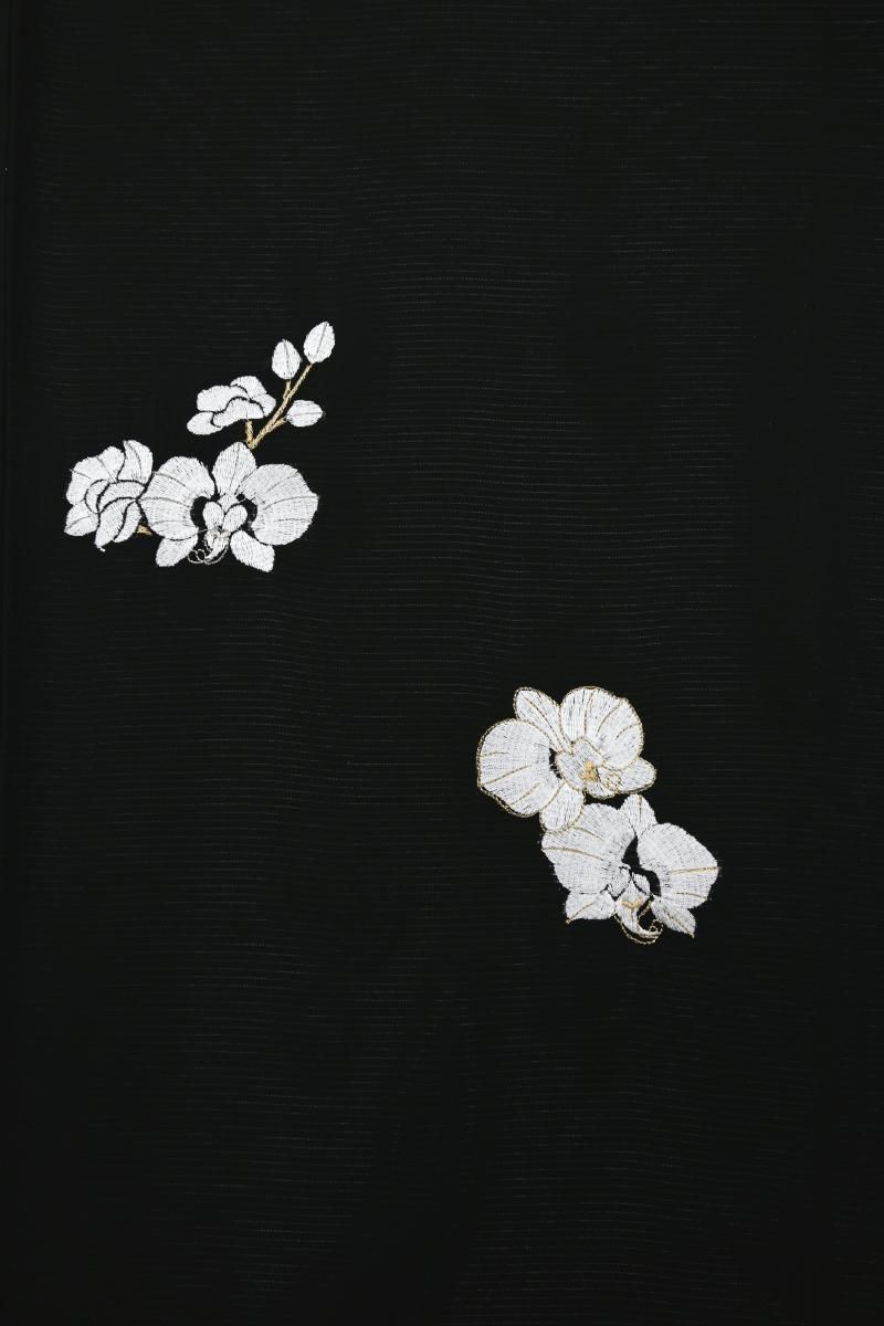 黒色の地に、胡蝶蘭の図を刺繍であしらった絽の小紋です。