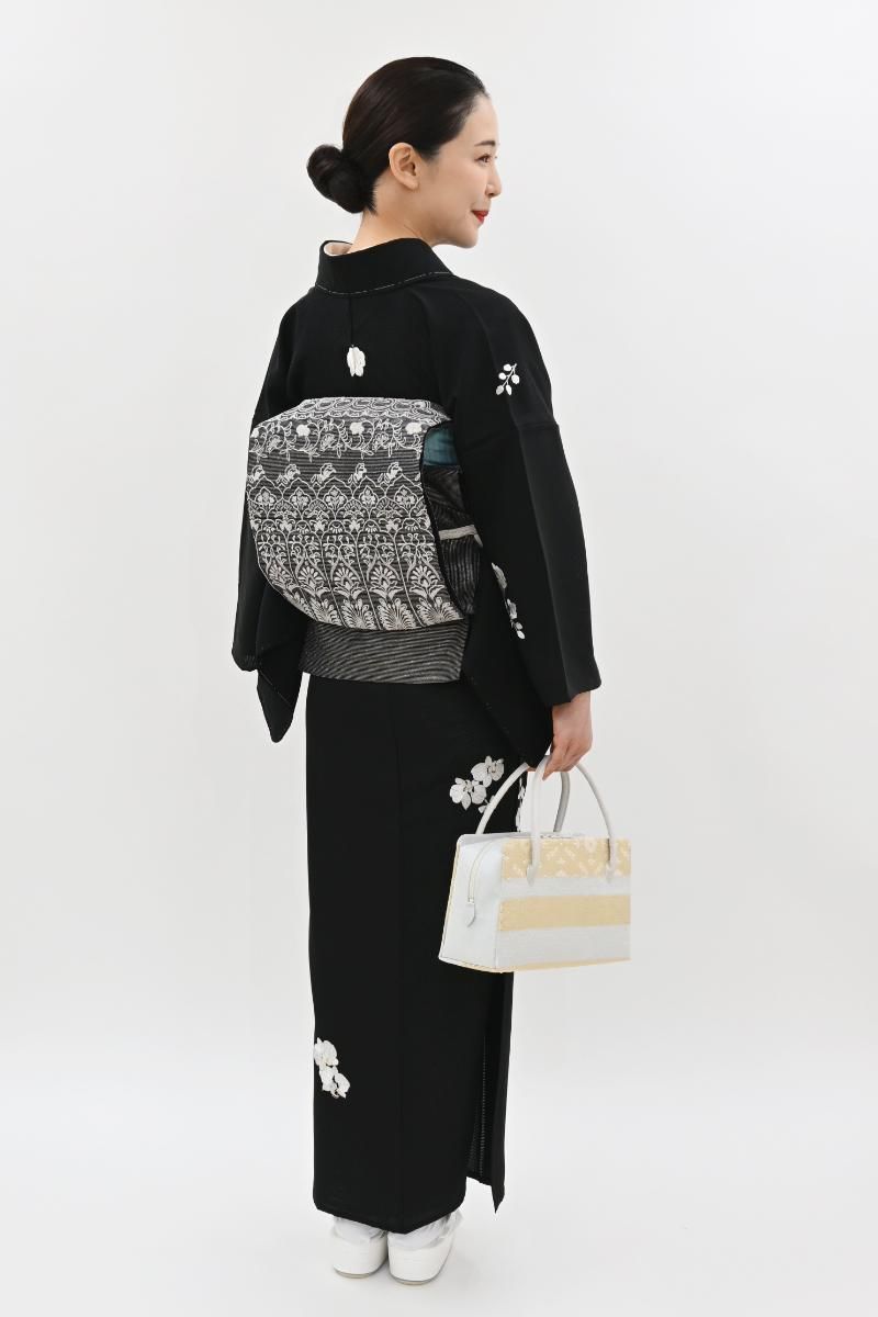 きりりとシックなお色目に、白と金のみを用いて品良く散らされた優美な意匠が凛とした佇まいのお品、しっとりと存在感ある着姿を創り出していますね。無地場を多めに取った飛び柄ですので少し格高の帯を合わせてお呼ばれのお席など、様々な場面で重宝頂けることと思います。白い襦袢を透かすことで一層の涼を誘う夏の黒、この機会にぜひいかがでしょうか。