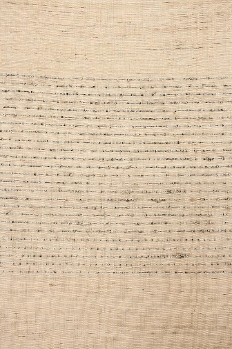 ナチュラルな灰みのベージュの生平麻地に、ポツポツと節の覗く太糸を横段に織り込んだ開きの名古屋帯です。
