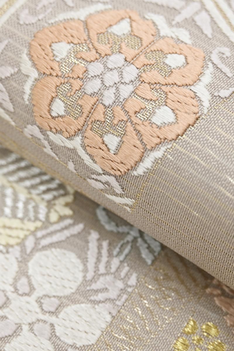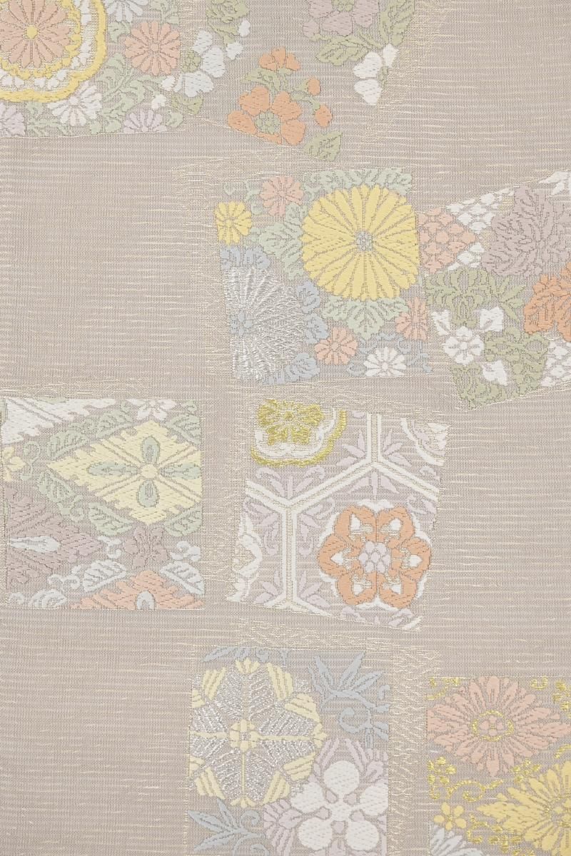 桜鼠色が近いでしょうか、ピンクみの淡いグレーの地に、色紙に花菱や亀甲、菊や梅などを配した絽の袋帯です。