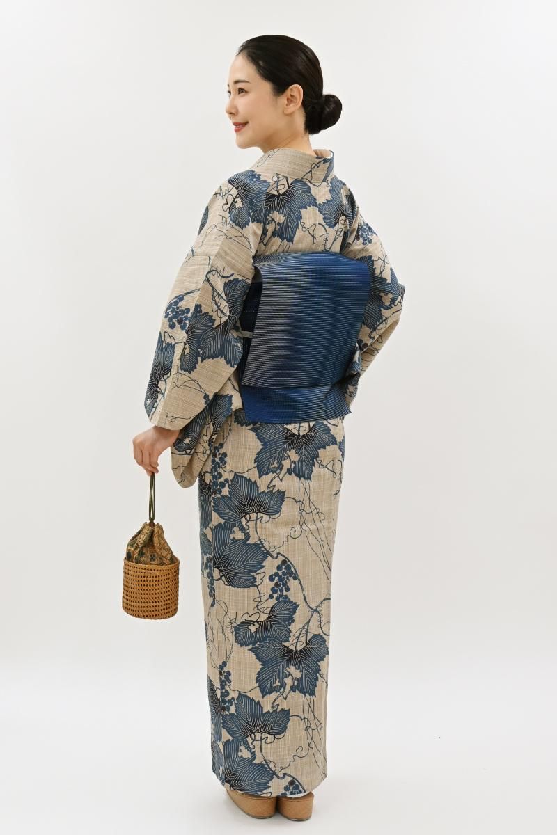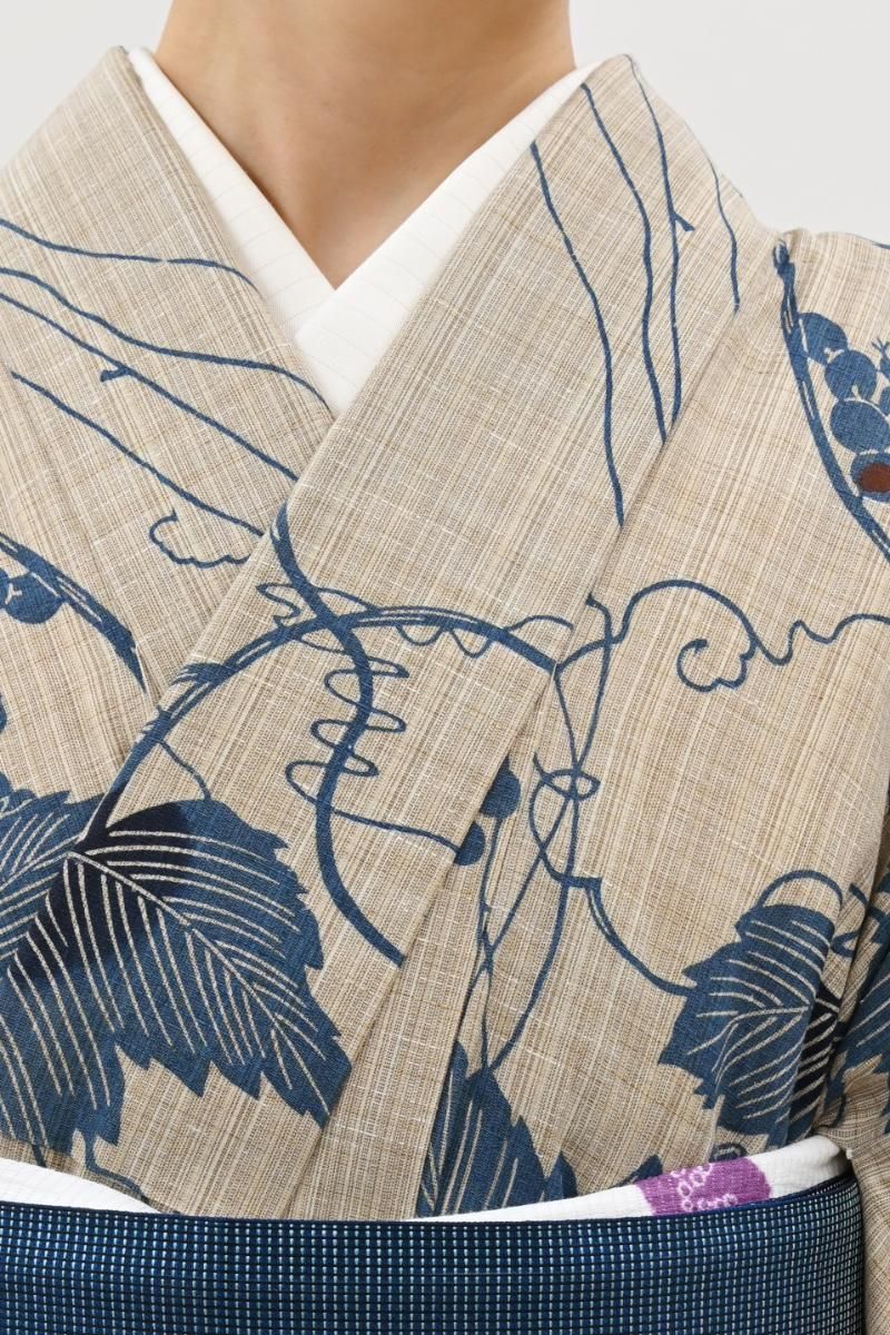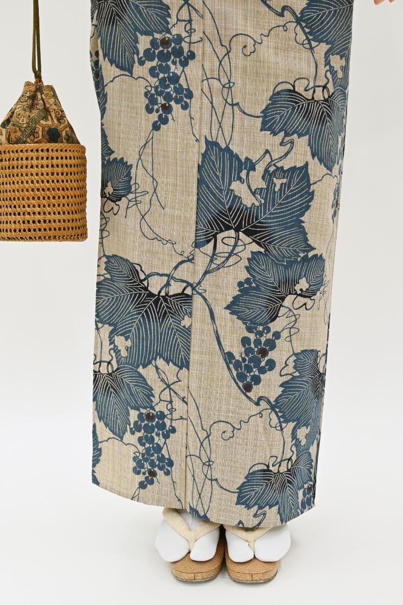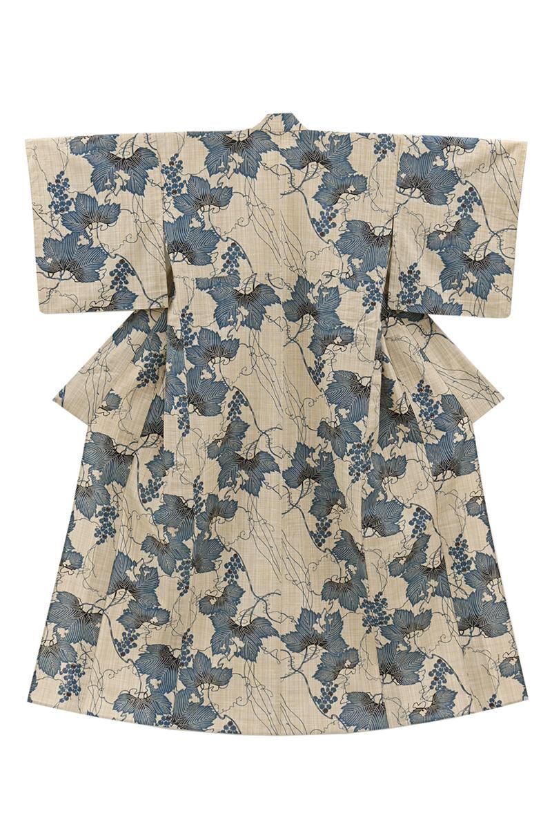 こちらは素色が近いでしょうか、灰みの薄茶に紺で葡萄唐草文を染めた優美な印象のお品、竪に絣を織り出した独特の風合いと程よい張りのある上質な奥州木綿地に小紋感覚の染めですので浴衣としてはもちろん、半衿を付けて木綿着物としての装いもお楽しみいただける事と思います。今夏のお出かけにいかがでしょうか。