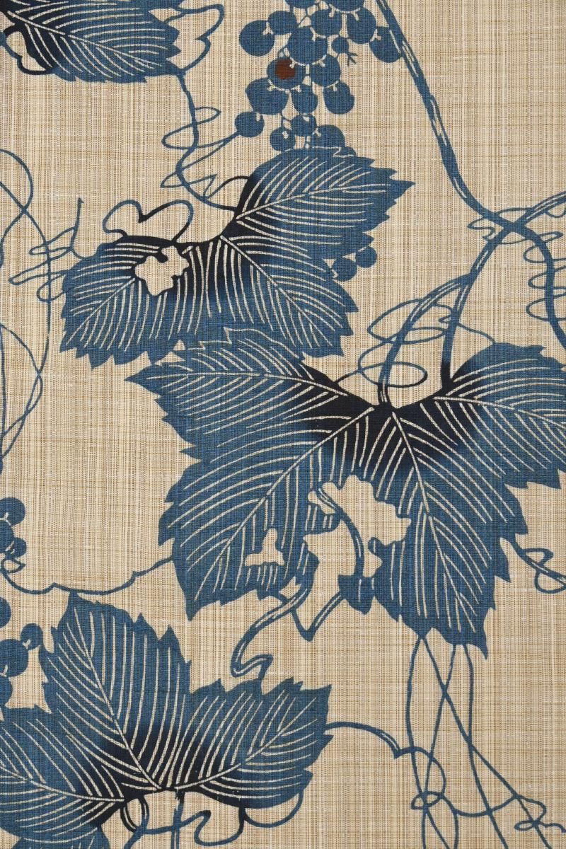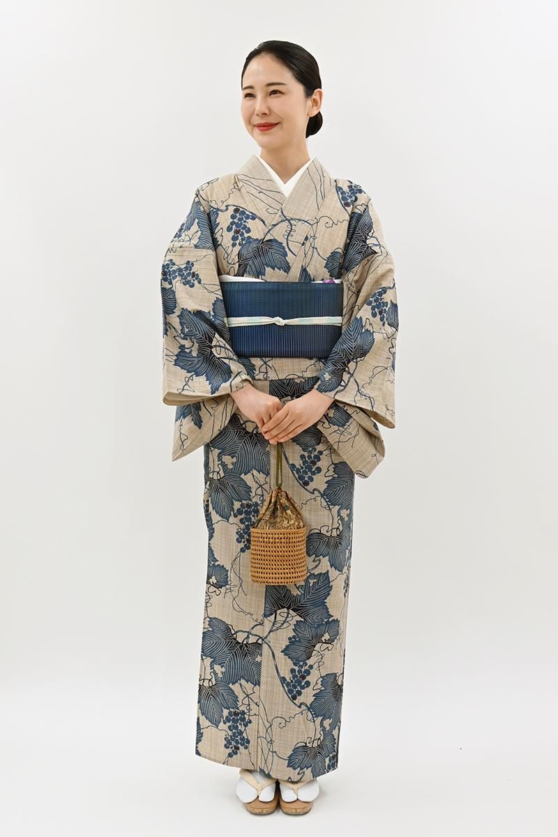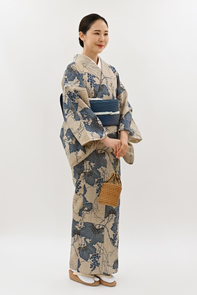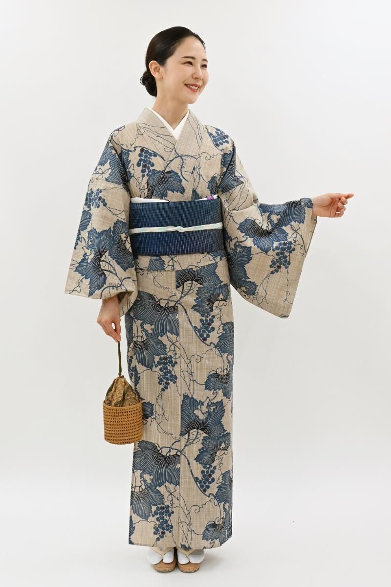 こちらは素色が近いでしょうか、灰みの薄茶に紺で葡萄唐草文を染めた優美な印象のお品、竪に絣を織り出した独特の風合いと程よい張りのある上質な奥州木綿地に小紋感覚の染めですので浴衣としてはもちろん、半衿を付けて木綿着物としての装いもお楽しみいただける事と思います。今夏のお出かけにいかがでしょうか。