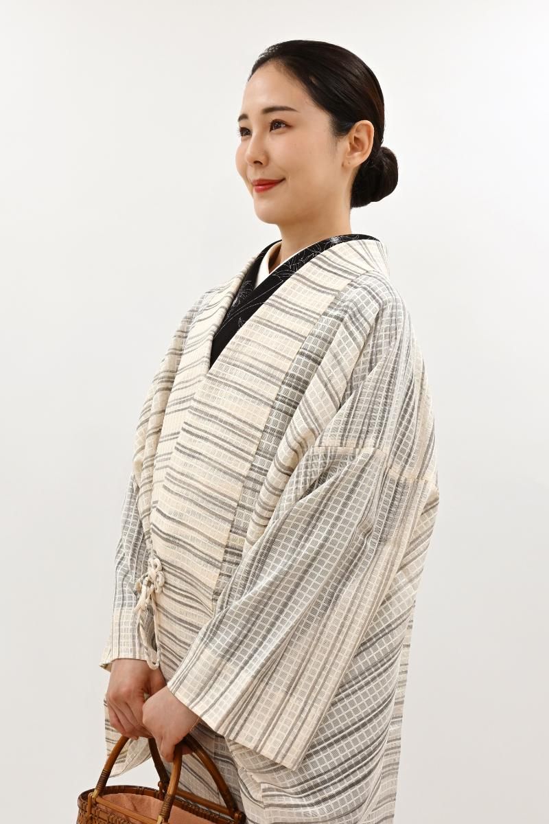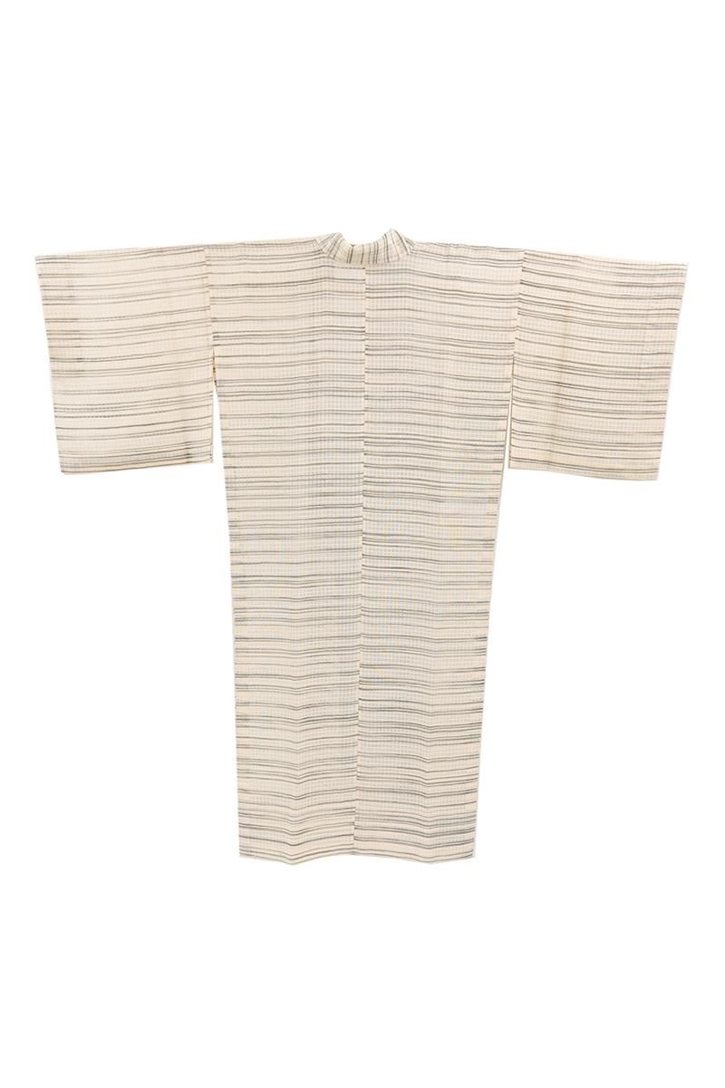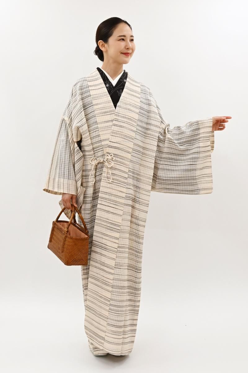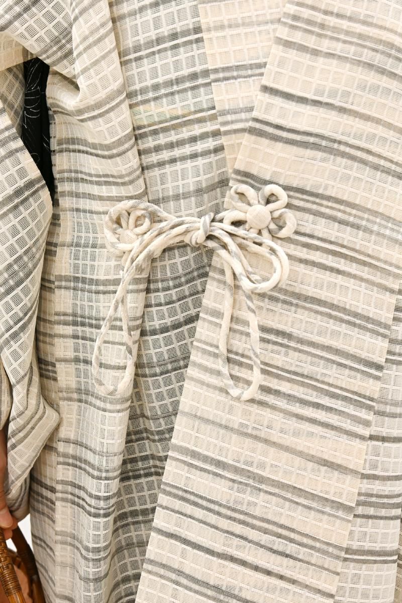 格子の織り出された淡いベージュの紋紗地に、グレーベージュで横段を染めた道中着です。