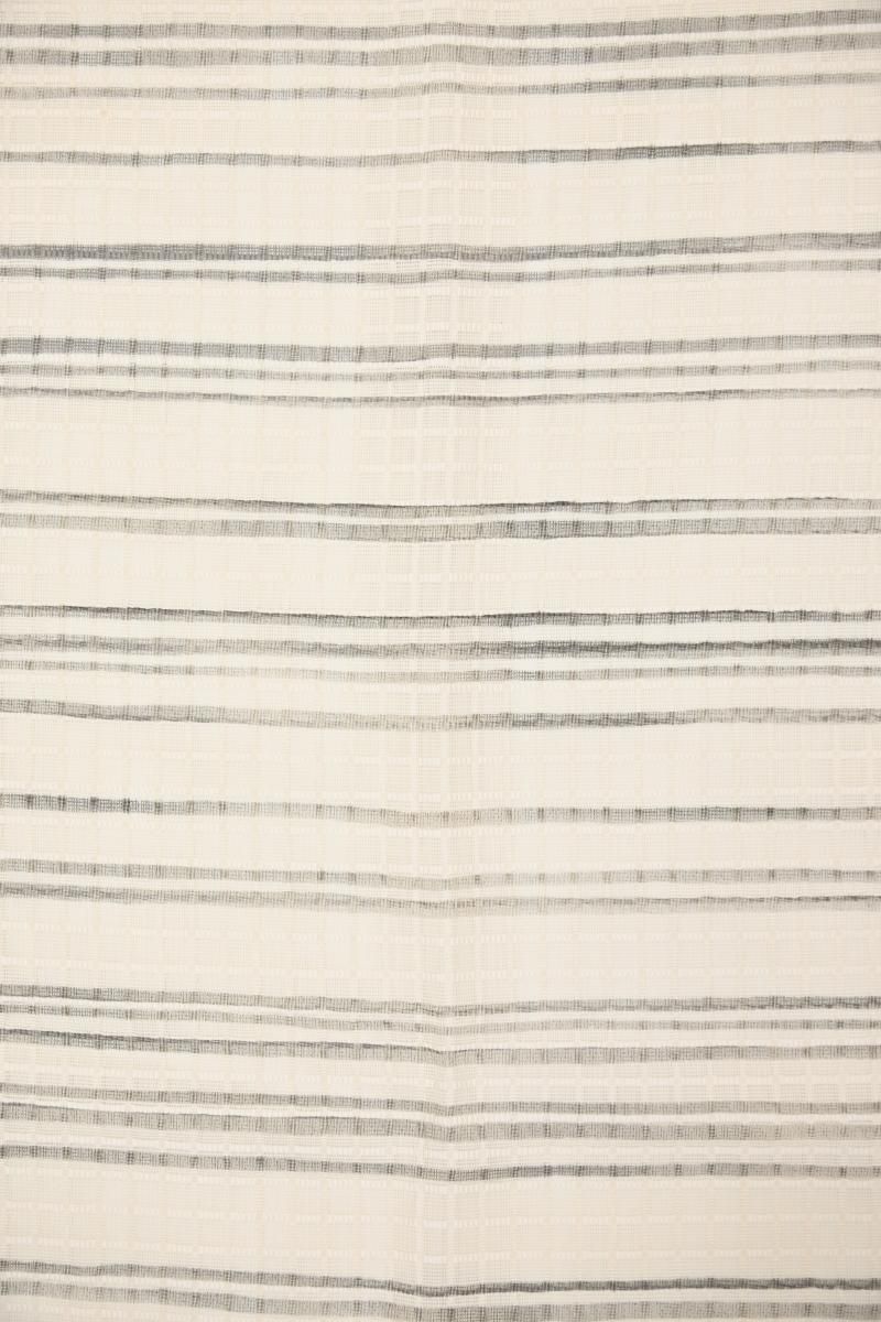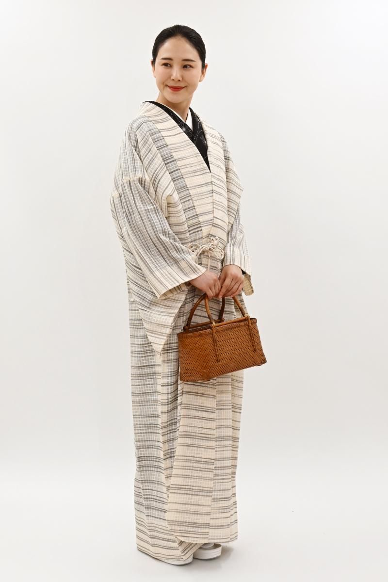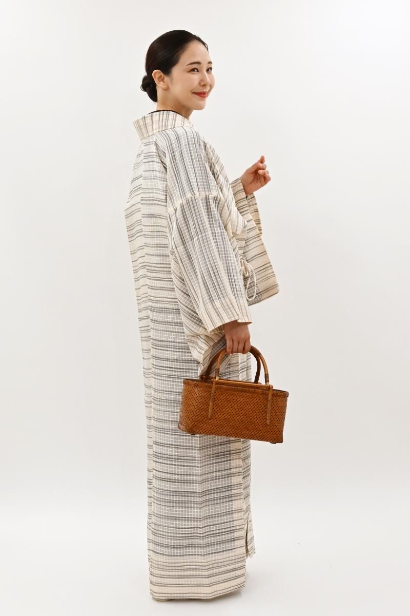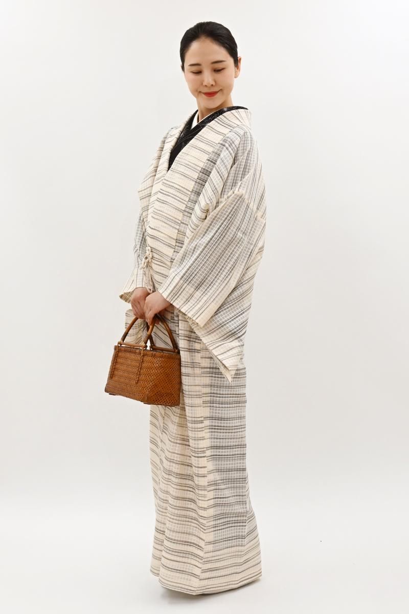 格子の織り出された淡いベージュの紋紗地に、グレーベージュで横段を染めた道中着です。