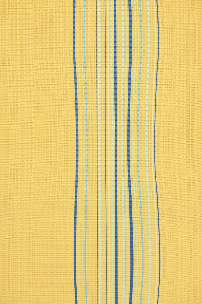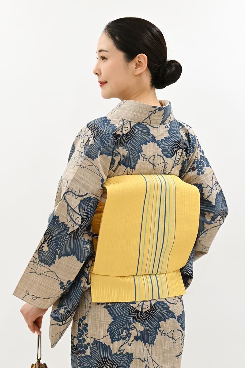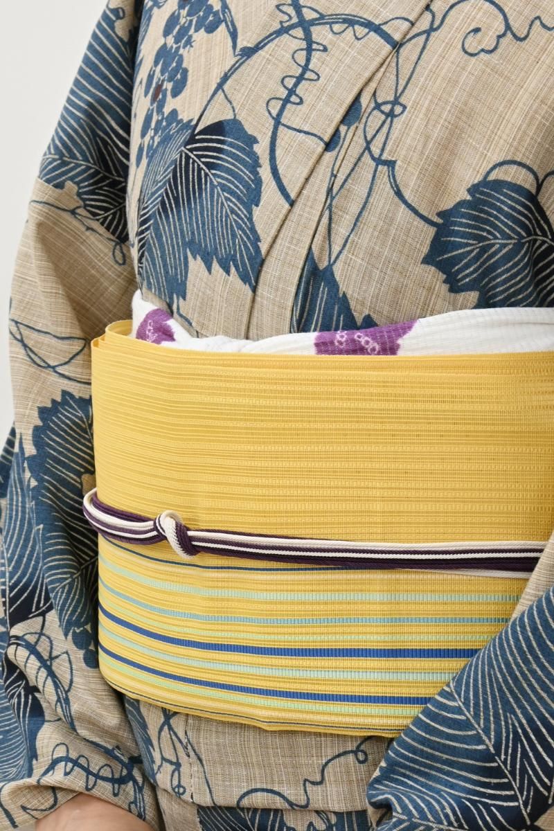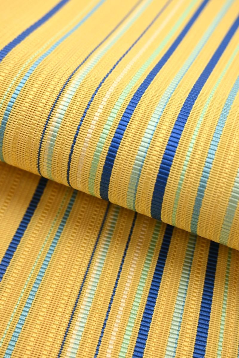こちらはひまわり色が近いでしょうか、こっくりとした黄色の地に、青色や水色などで竪縞を織り出したお品、すっきりとシンプルな色柄ですので、合わせる着物も様々にお楽しみいただけることと思います。博多織ならではの締め心地の良さも嬉しい一本、夏の小紋や紬などに合わせてちょっとしたお出かけなどにいかがでしょうか。