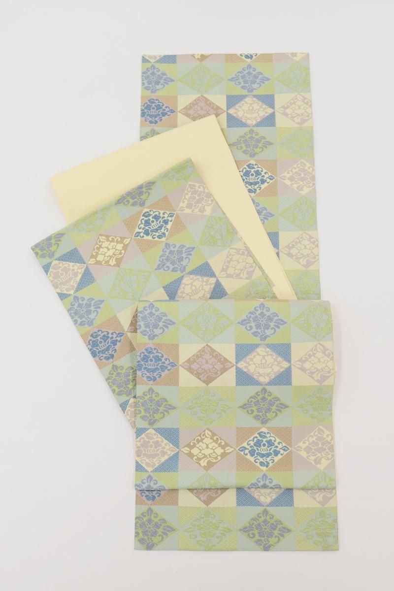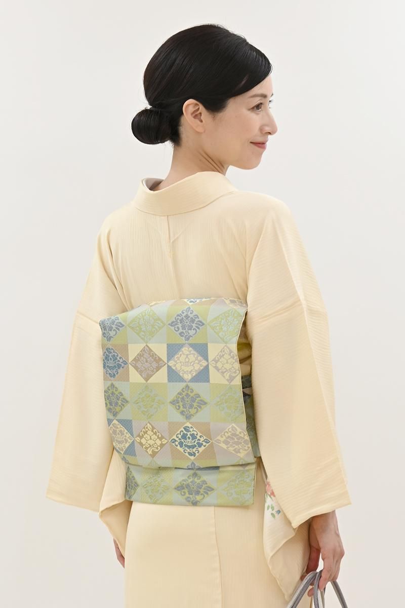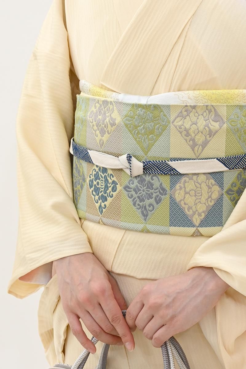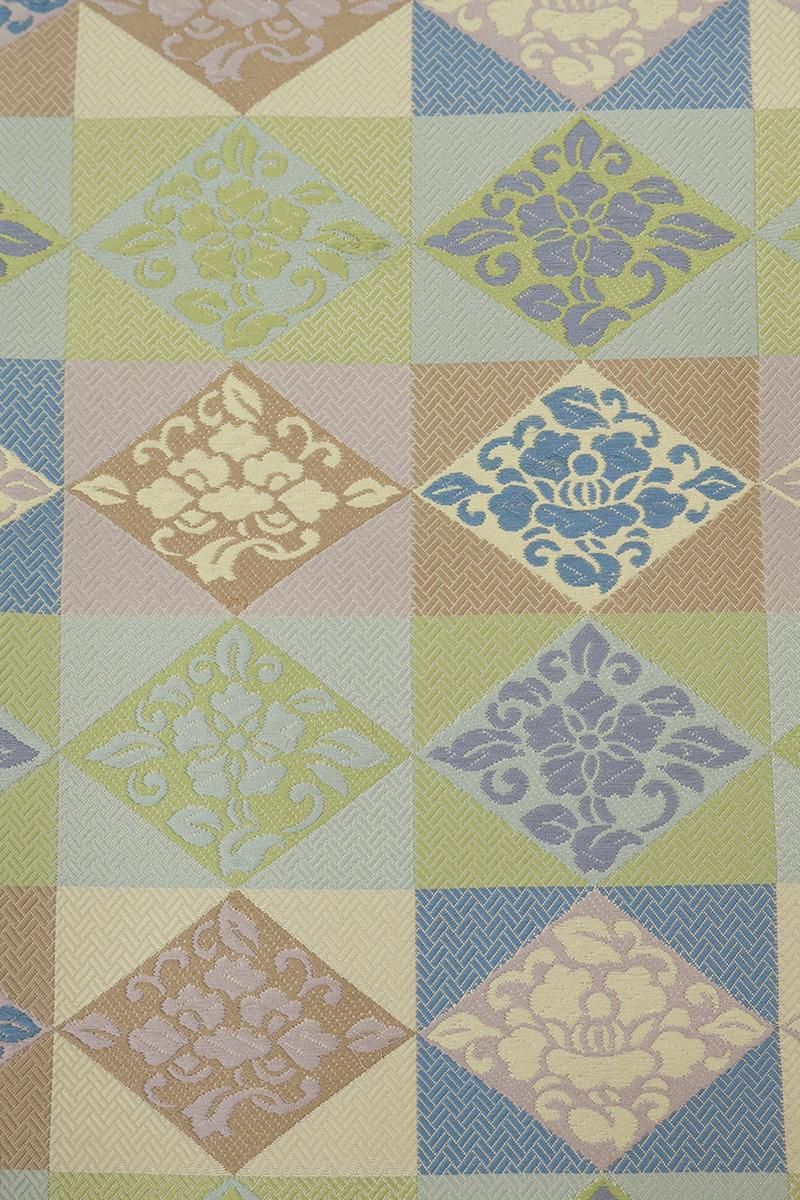 こちらは全体の印象としては若苗色が近いでしょうか、黄緑や青磁、薄紫やベージュなどで市松に花菱文を織り出したお品、朗らかな印象の彩りで表現された端正なモチーフに優しい気品と格調が漂います。しなやかな締め心地は、やはり川島さんならでは、ドレッシーな紬から格高の小紋、色無地などに合わせて洗練された装いをお楽しみ頂けることと思います。この機会にぜひお手に取ってご覧くださいませ。