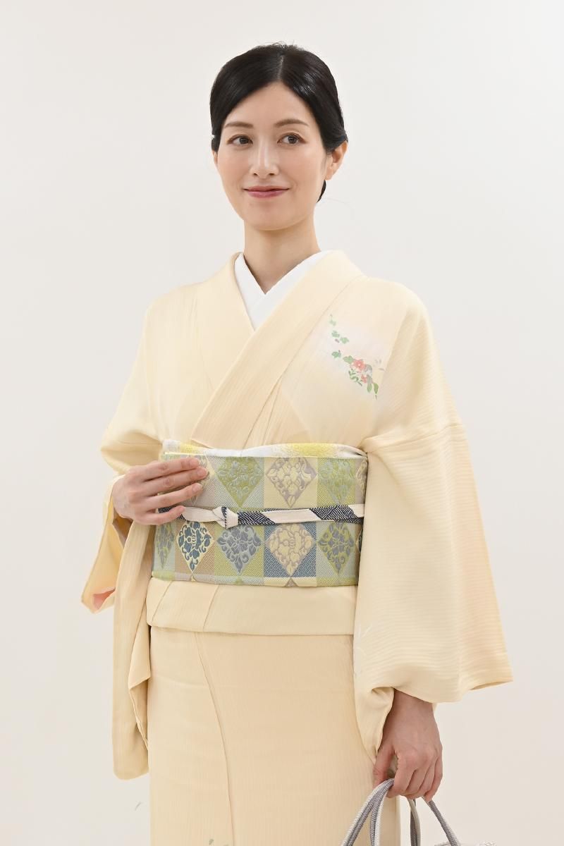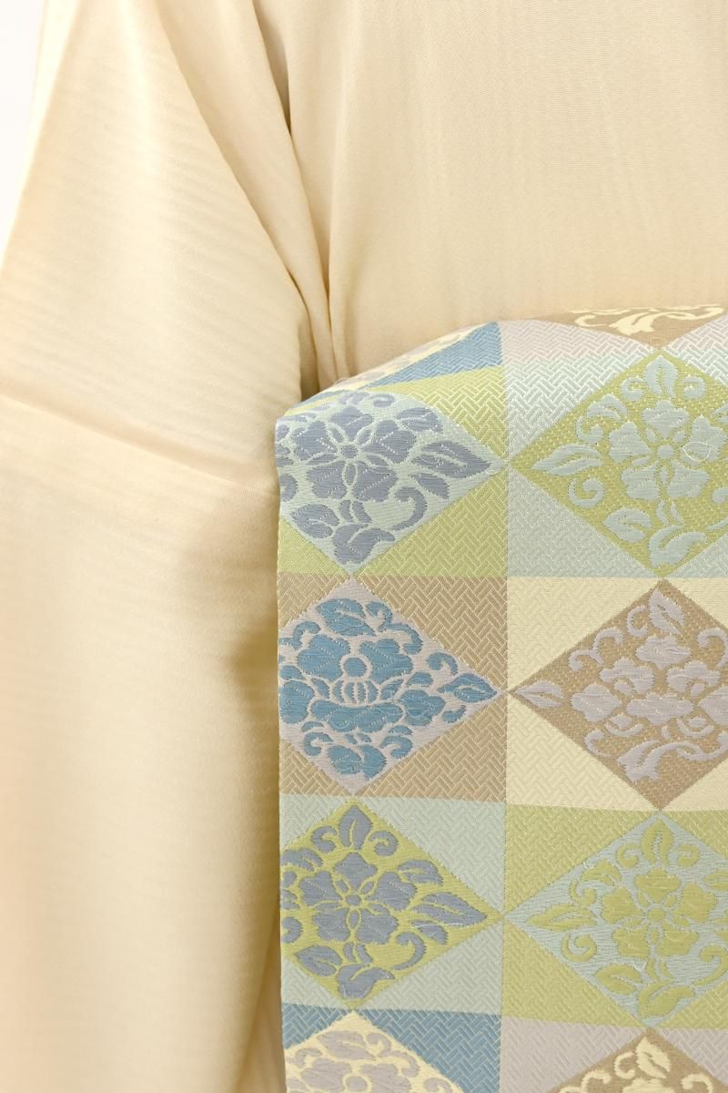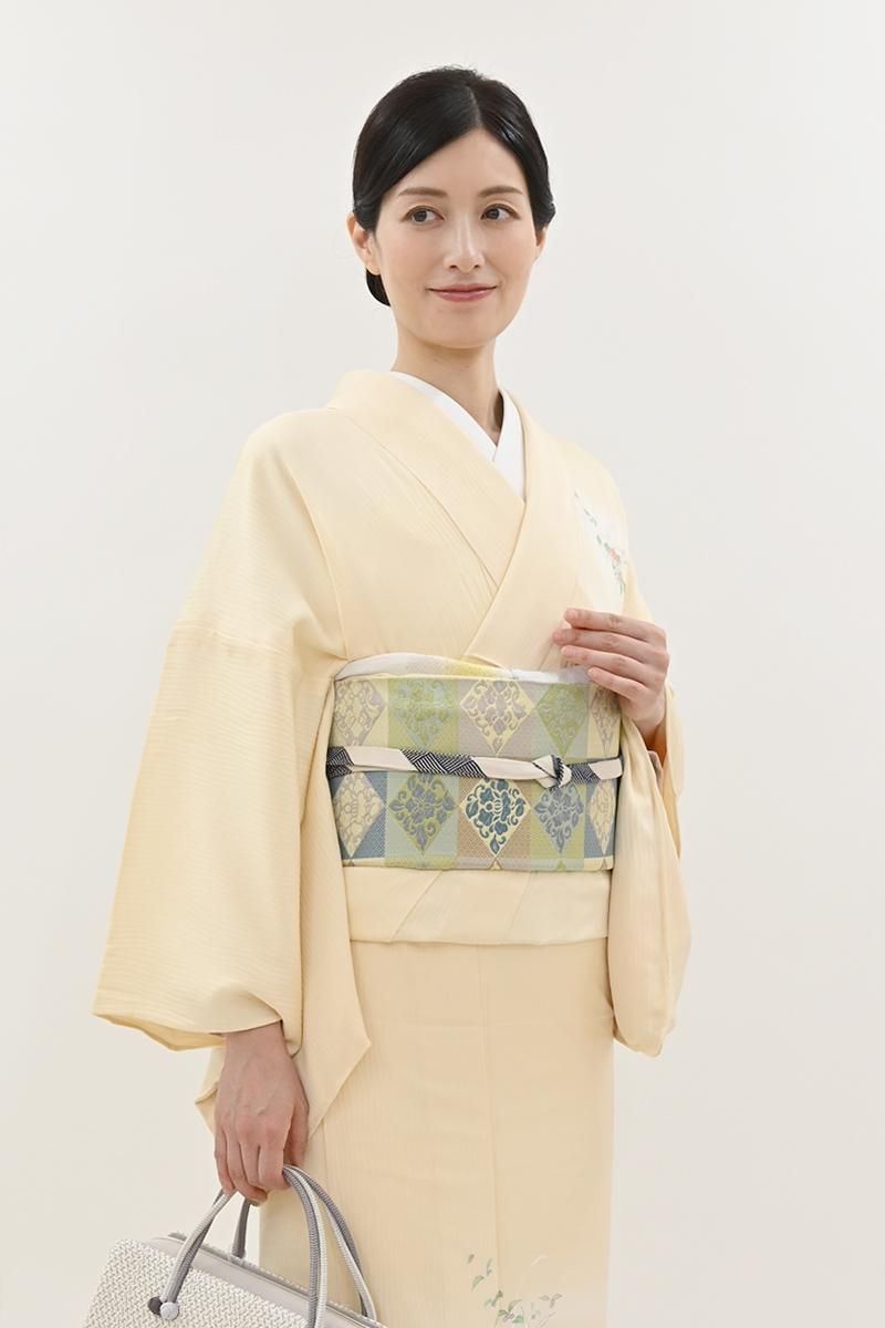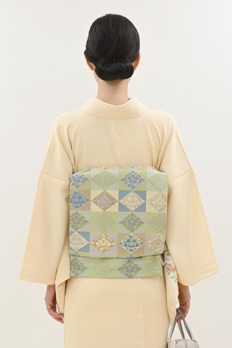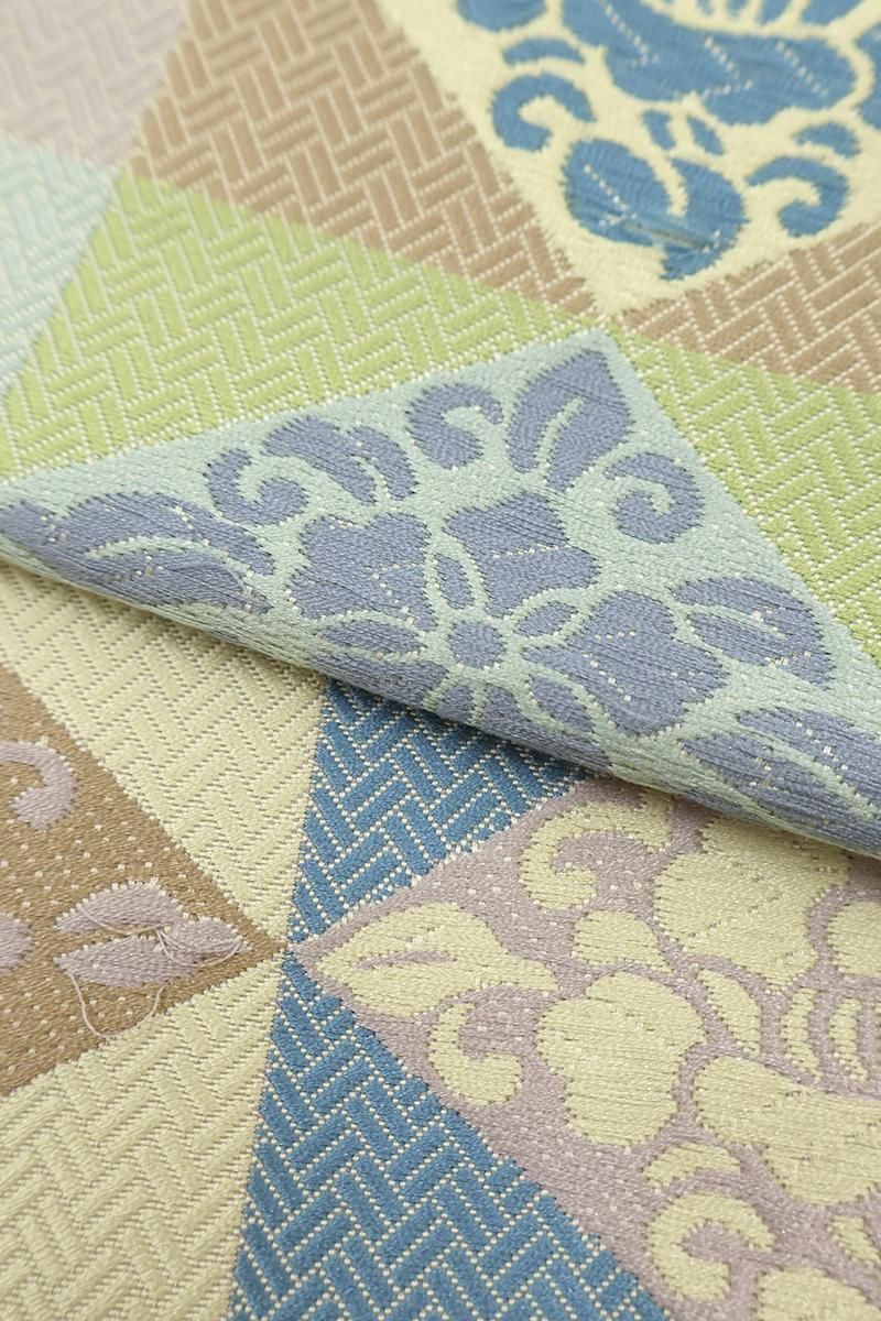 こちらは全体の印象としては若苗色が近いでしょうか、黄緑や青磁、薄紫やベージュなどで市松に花菱文を織り出したお品、朗らかな印象の彩りで表現された端正なモチーフに優しい気品と格調が漂います。しなやかな締め心地は、やはり川島さんならでは、ドレッシーな紬から格高の小紋、色無地などに合わせて洗練された装いをお楽しみ頂けることと思います。この機会にぜひお手に取ってご覧くださいませ。