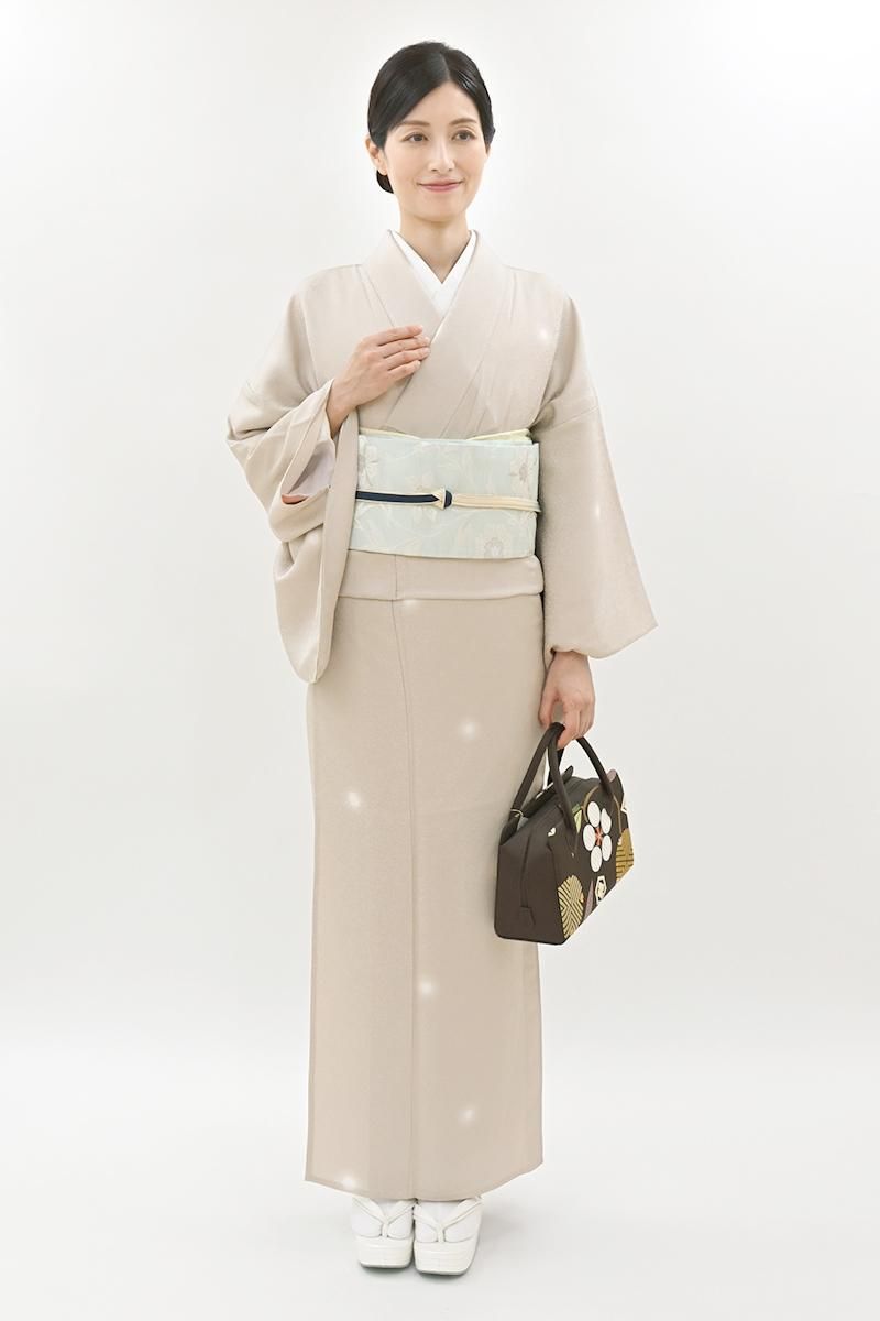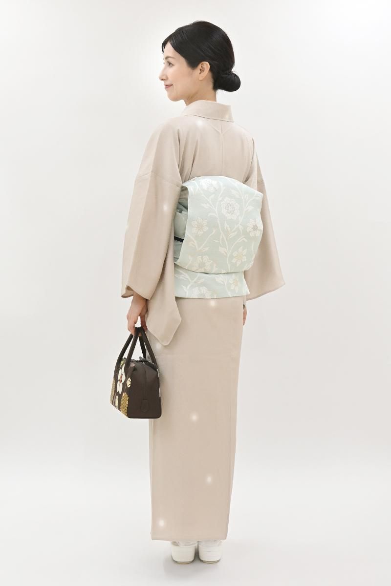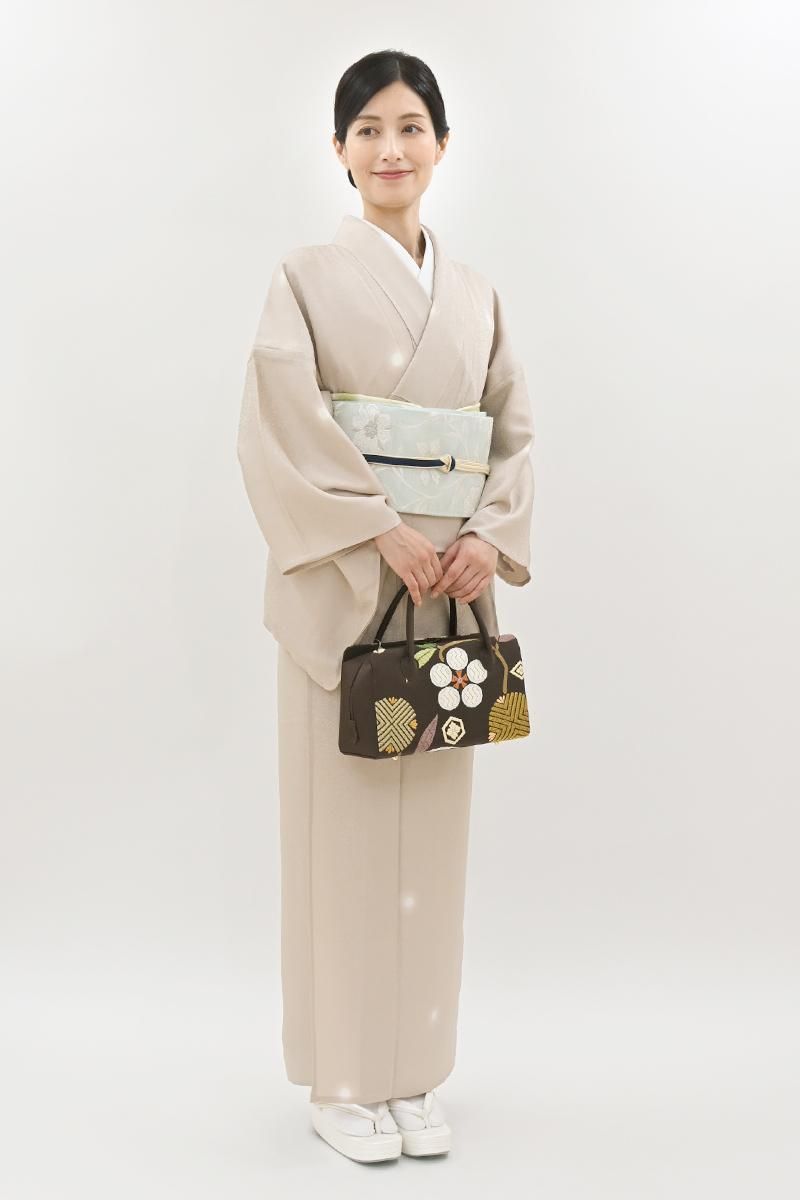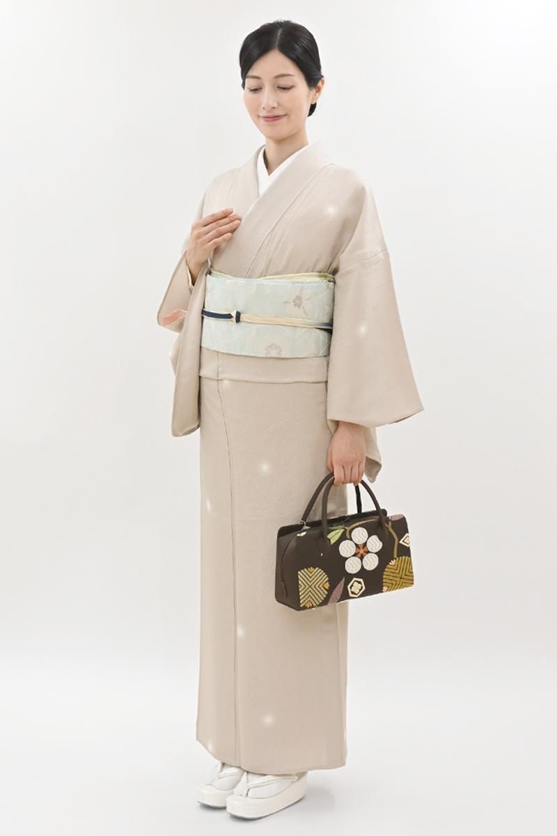 程よく落ち着いた色柄ゆきが着る方の優しく女性らしい表情を引き立ててくれる一枚、光の加減によってほのかに浮かぶ地紋にさり気ない華やかさが香りますね。シンプルな意匠は帯合わせを選ばず、また帯次第で街着からお茶の席など少し改まった場面まで、重宝にお召しになれることと思います。この機会にいかがでしょうか。
