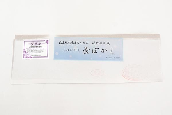 やや色を薄めた白茶色が近いでしょうか、桐竹鳳凰の地紋の浮かぶ淡いグレーベージュの地にふんわりと蛍暈かしを表した単衣の小紋です。