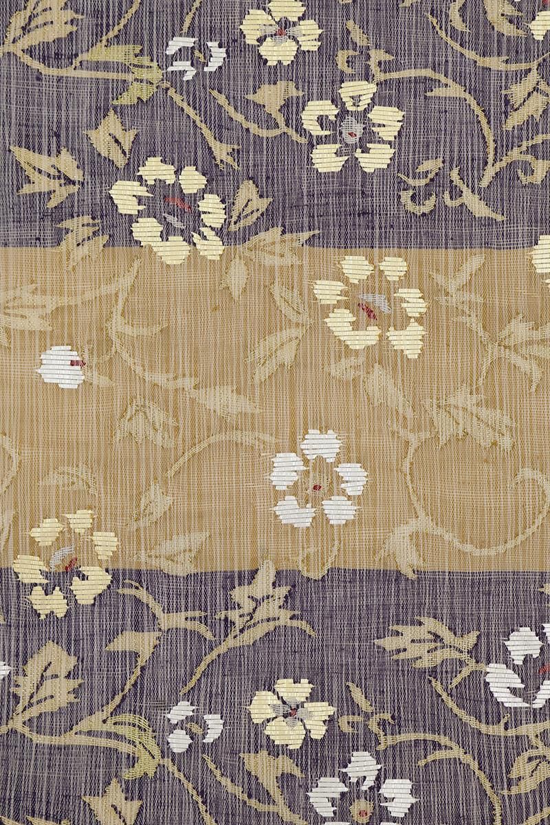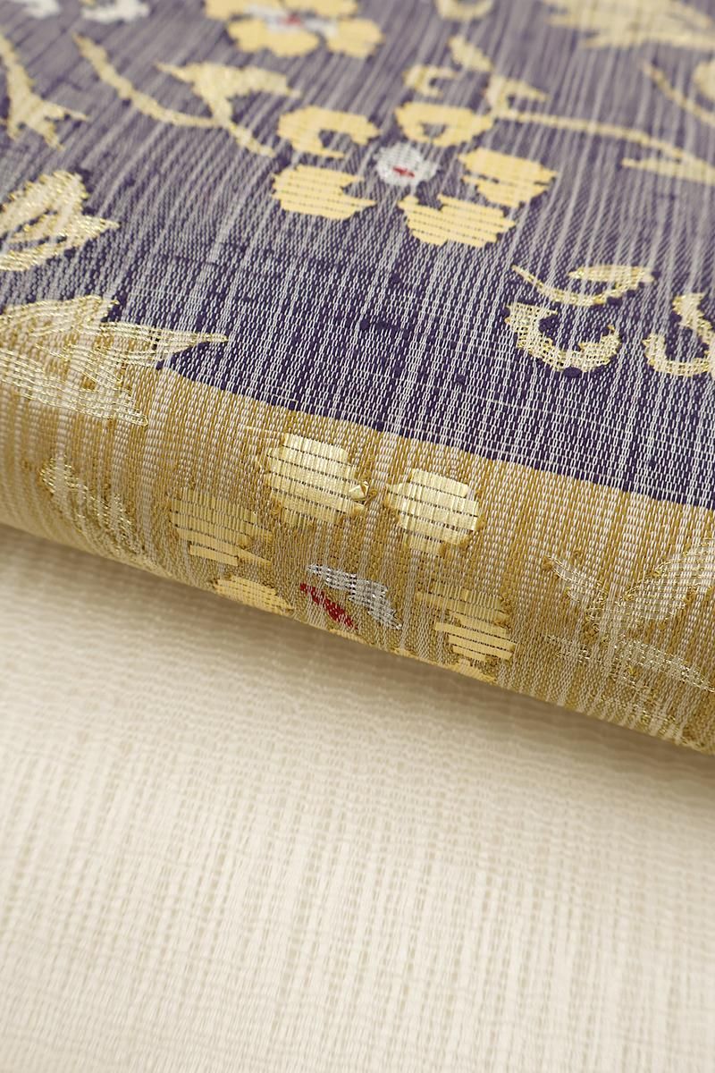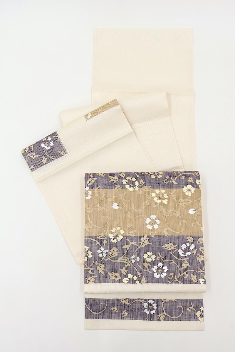 白色の地に紫やベージュの横段を配し、重ねて唐花文を織り出した夏の袋帯です。