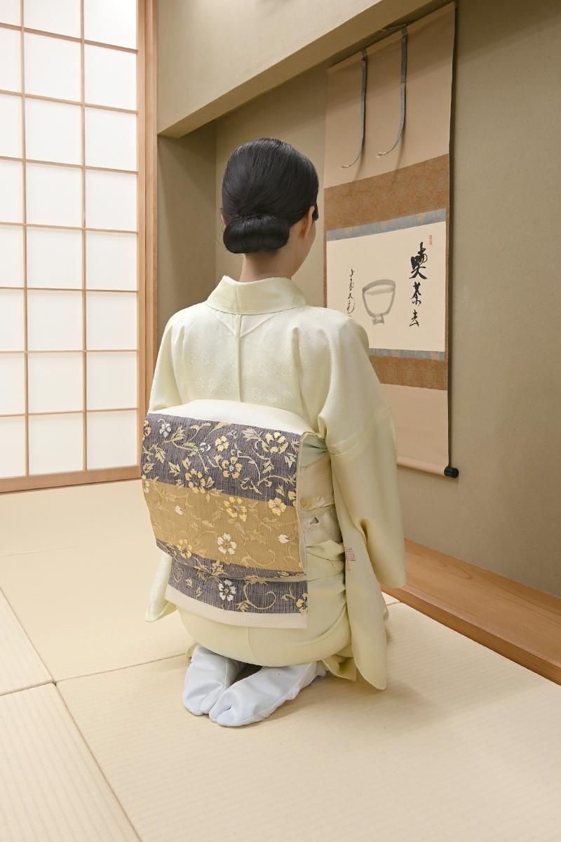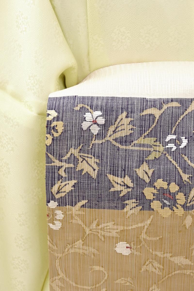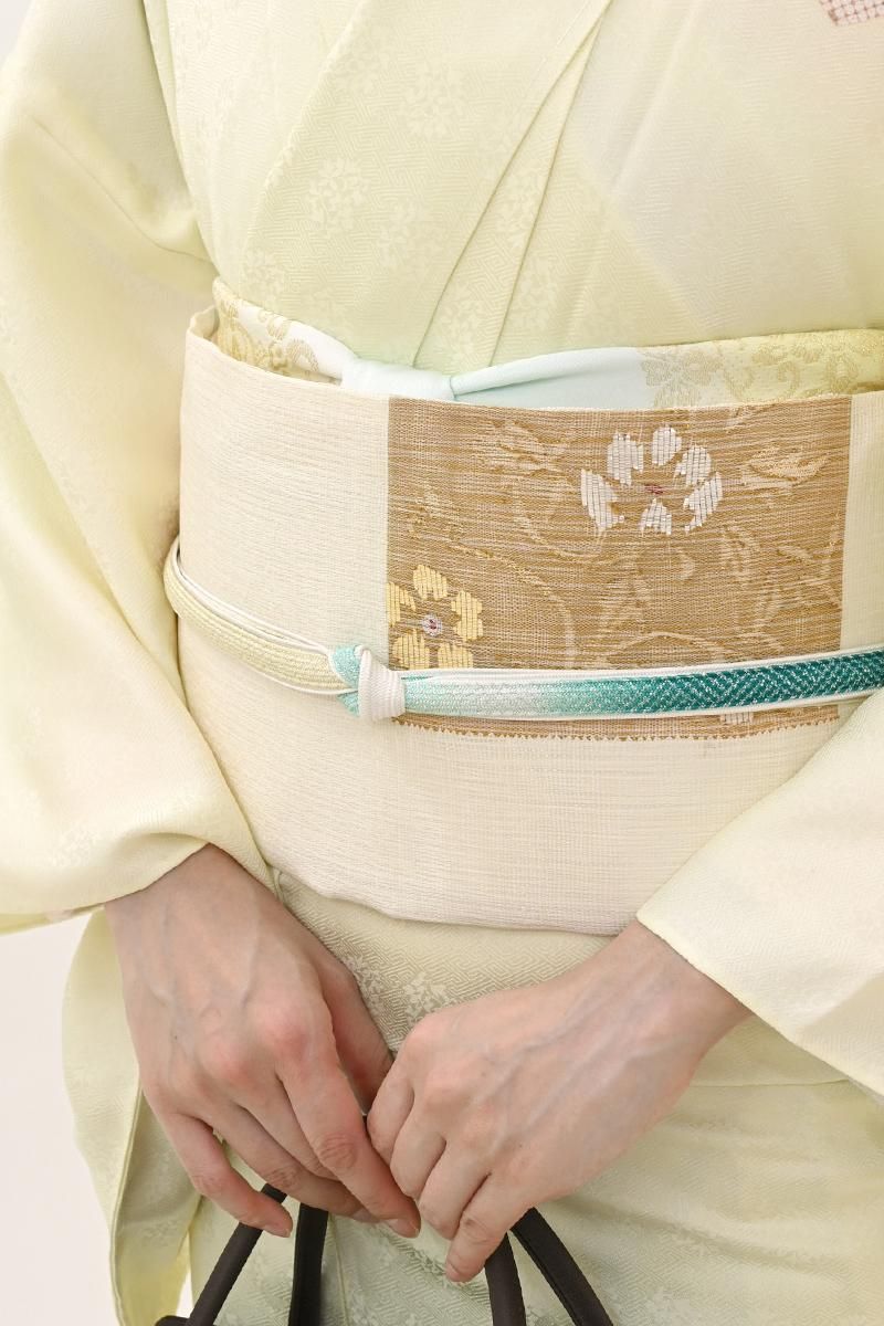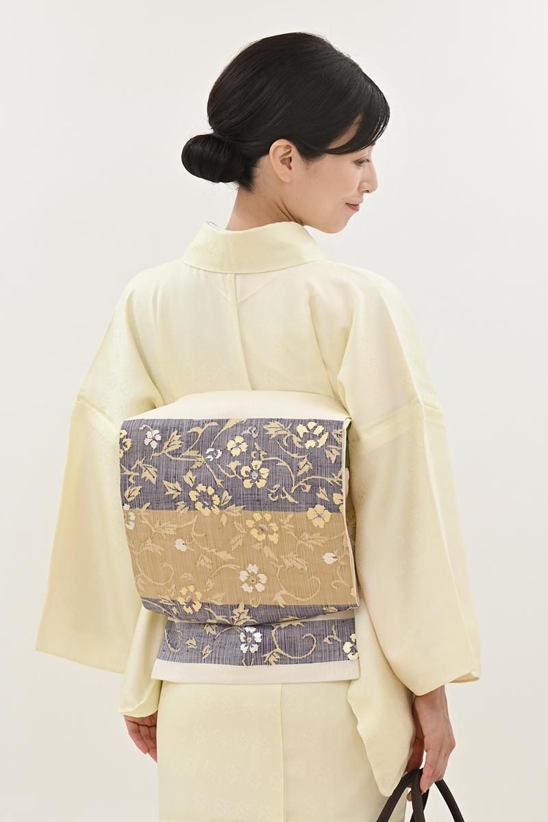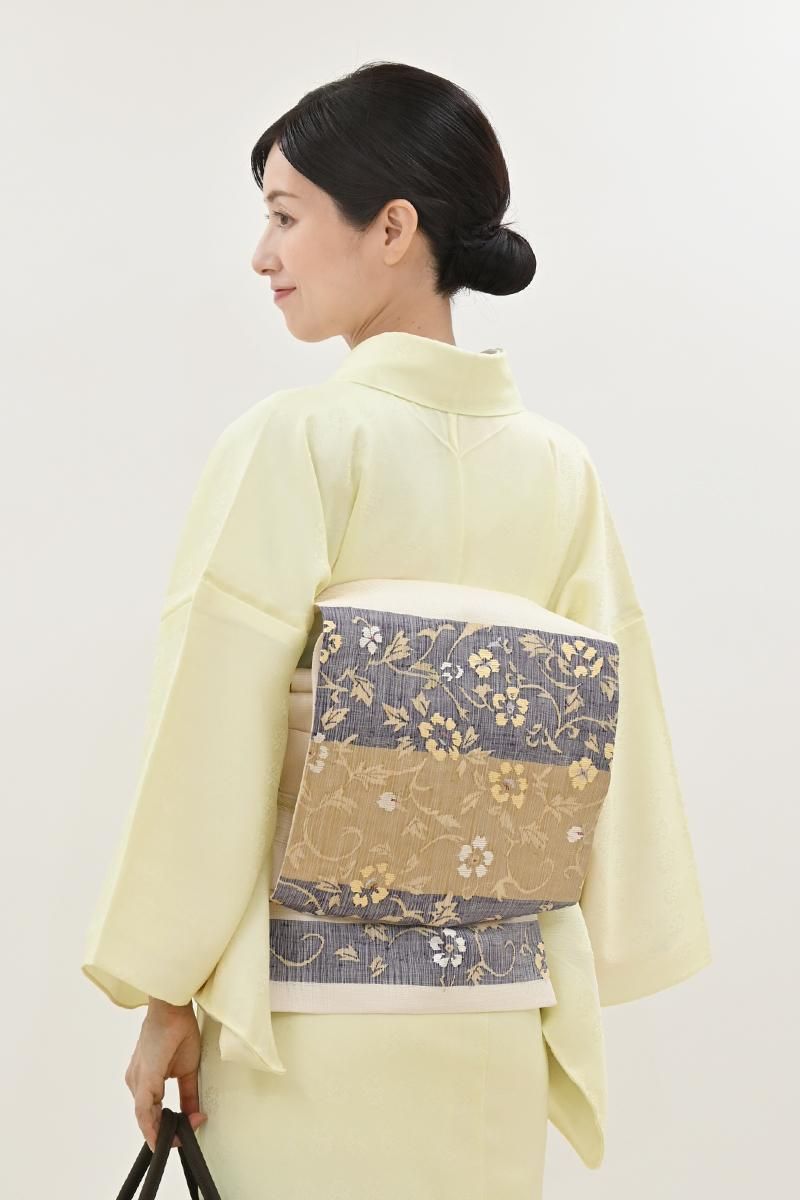 さっくりと軽やかな地風に、金糸を基調として表現された優雅な意匠が女性らしくモダンな雰囲気のお品、品良い華やぎで装いを引き立ててくれることと思います。夏の色無地や江戸小紋、付下げなどに合わせて、涼やかな装いをお楽しみくださいませ。