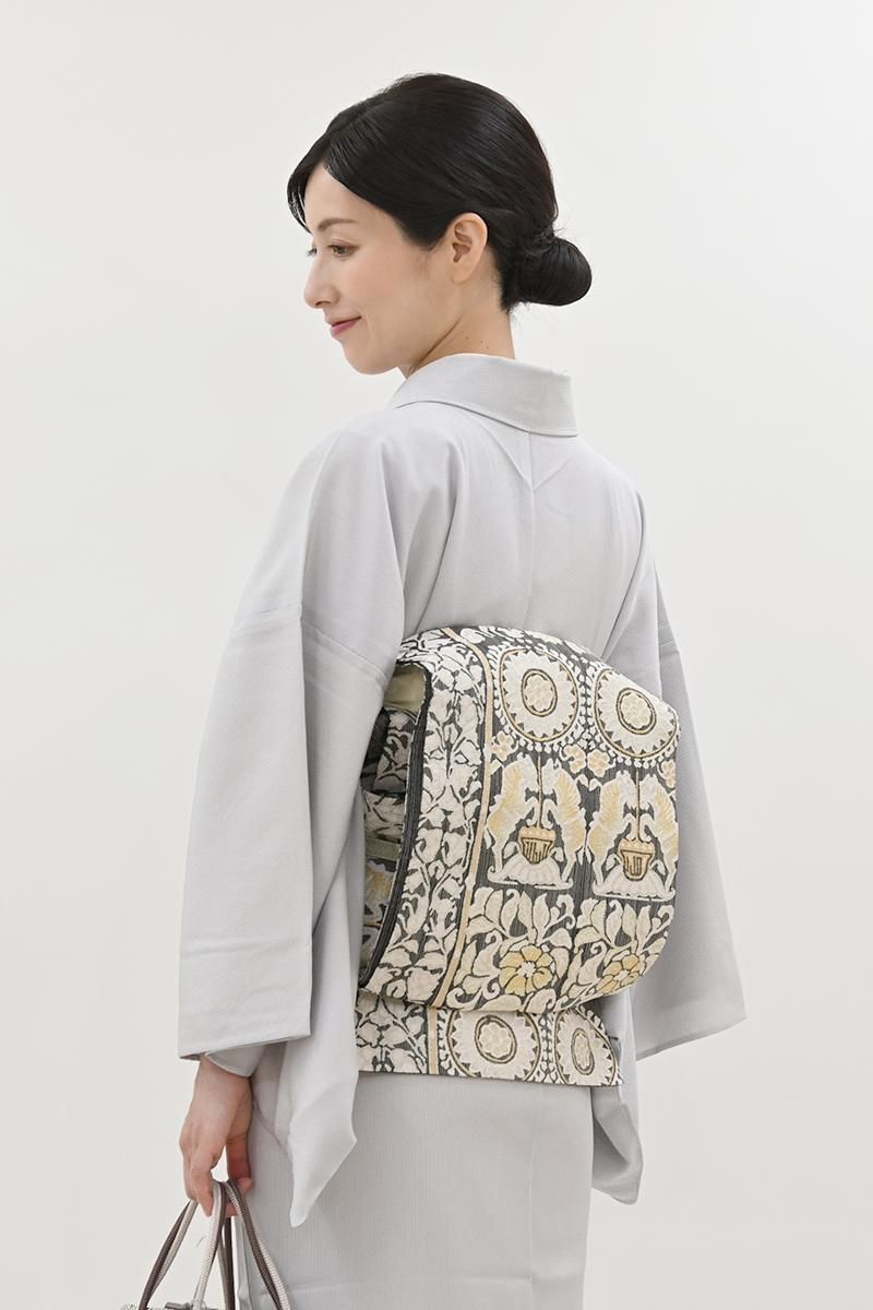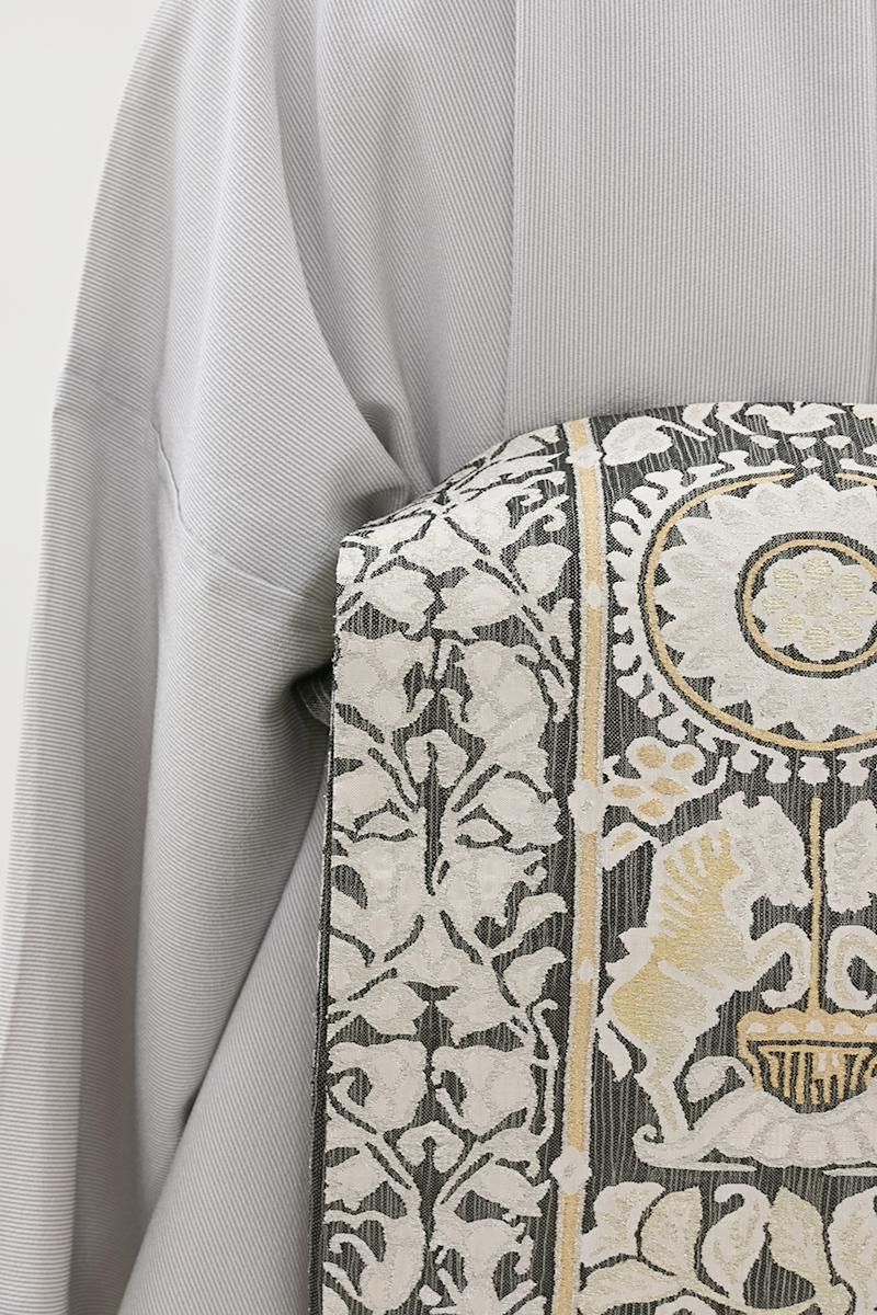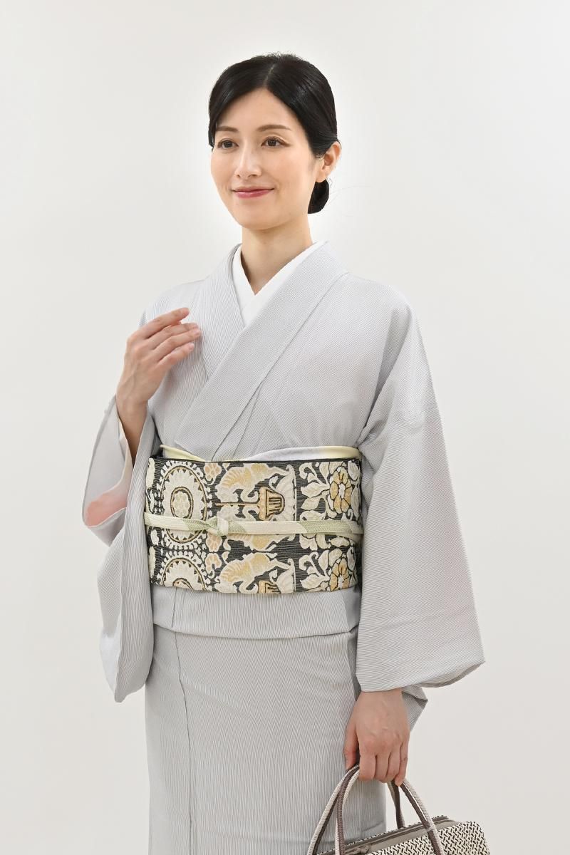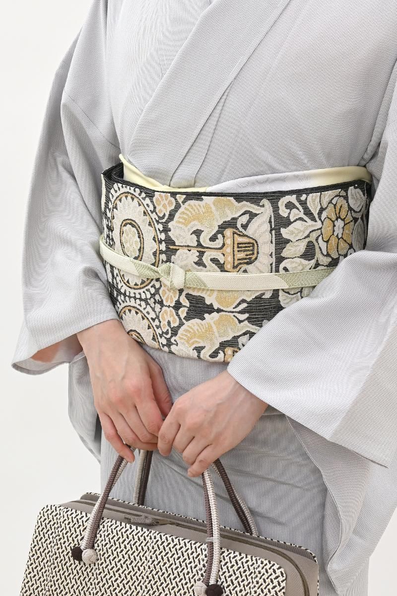 石板色が近いでしょうか、銀糸を織り込んだごく深いグレーの地に、装飾的な文様を織り出した夏の袋帯です。しゃりっとした地風のシックなお色目いっぱいに配されたモチーフがモダンな趣のお品、金銀糸のきらめきが気品を添え、洋の空間にも映える、洗練された個性のある装いをお楽しみ頂けることと思います。色無地や付下げなどに合わせて、ちょっとしたパーティやお食事会などにいかがでしょうか。