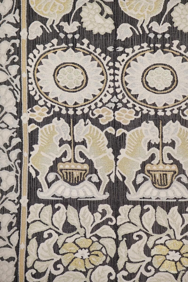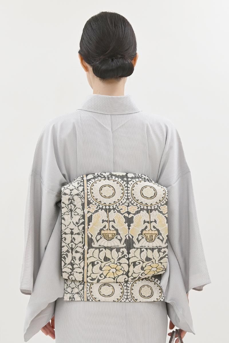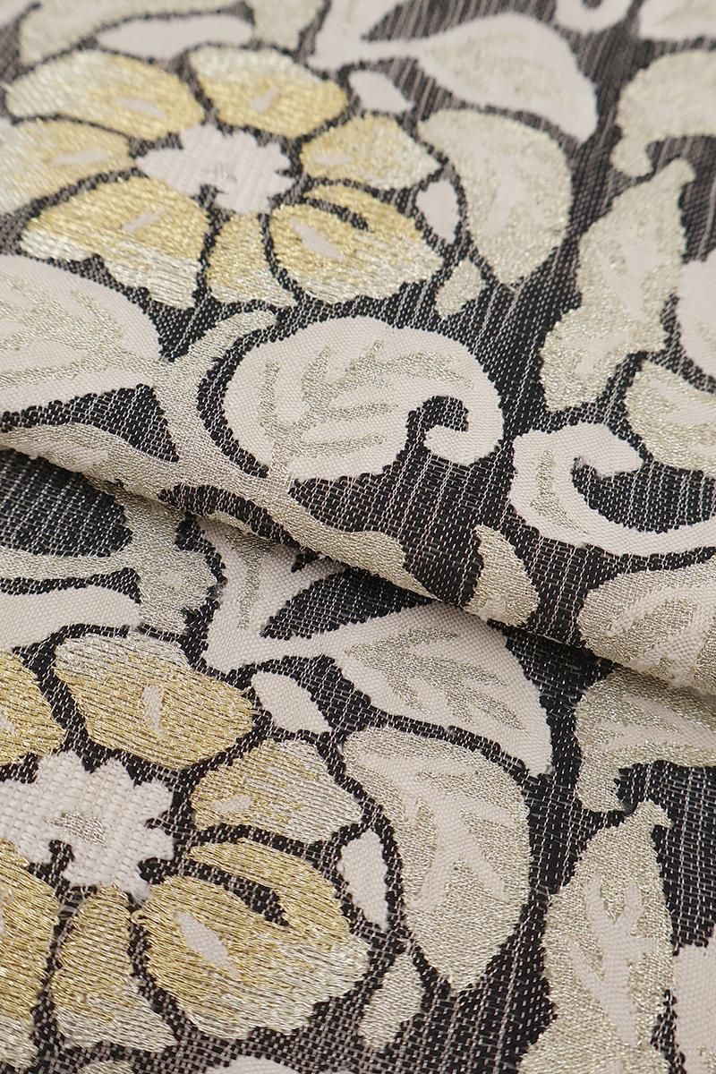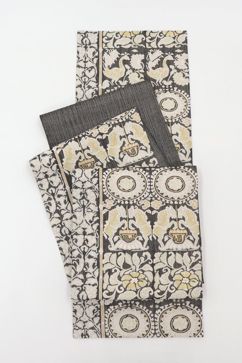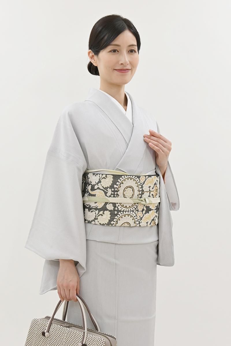 石板色が近いでしょうか、銀糸を織り込んだごく深いグレーの地に、装飾的な文様を織り出した夏の袋帯です。しゃりっとした地風のシックなお色目いっぱいに配されたモチーフがモダンな趣のお品、金銀糸のきらめきが気品を添え、洋の空間にも映える、洗練された個性のある装いをお楽しみ頂けることと思います。色無地や付下げなどに合わせて、ちょっとしたパーティやお食事会などにいかがでしょうか。