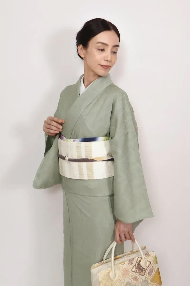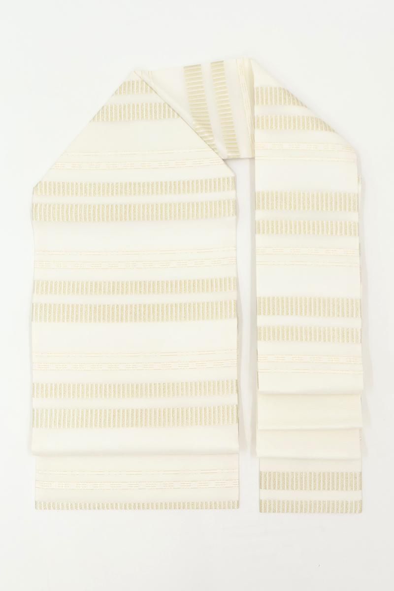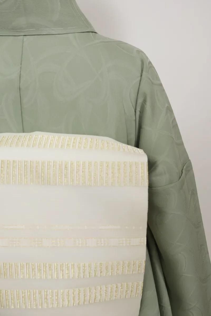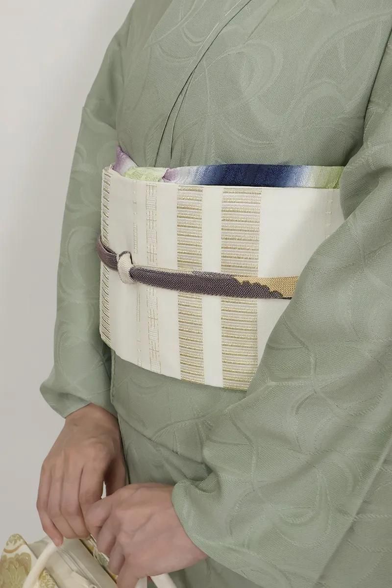こちらは透け感のあるすっきりとしたオフホワイトの地に白と金銀糸で端正な幾何文を横段に配したお品、シンプルな色彩と穏やかな金銀糸の煌めきが洗練された美しさを添えてくれますね。単衣から盛夏にかけて、色無地や付下げ、訪問着などの様々なお着物に合わせて女性らしい楚々とした装いをいかがでしょうか。