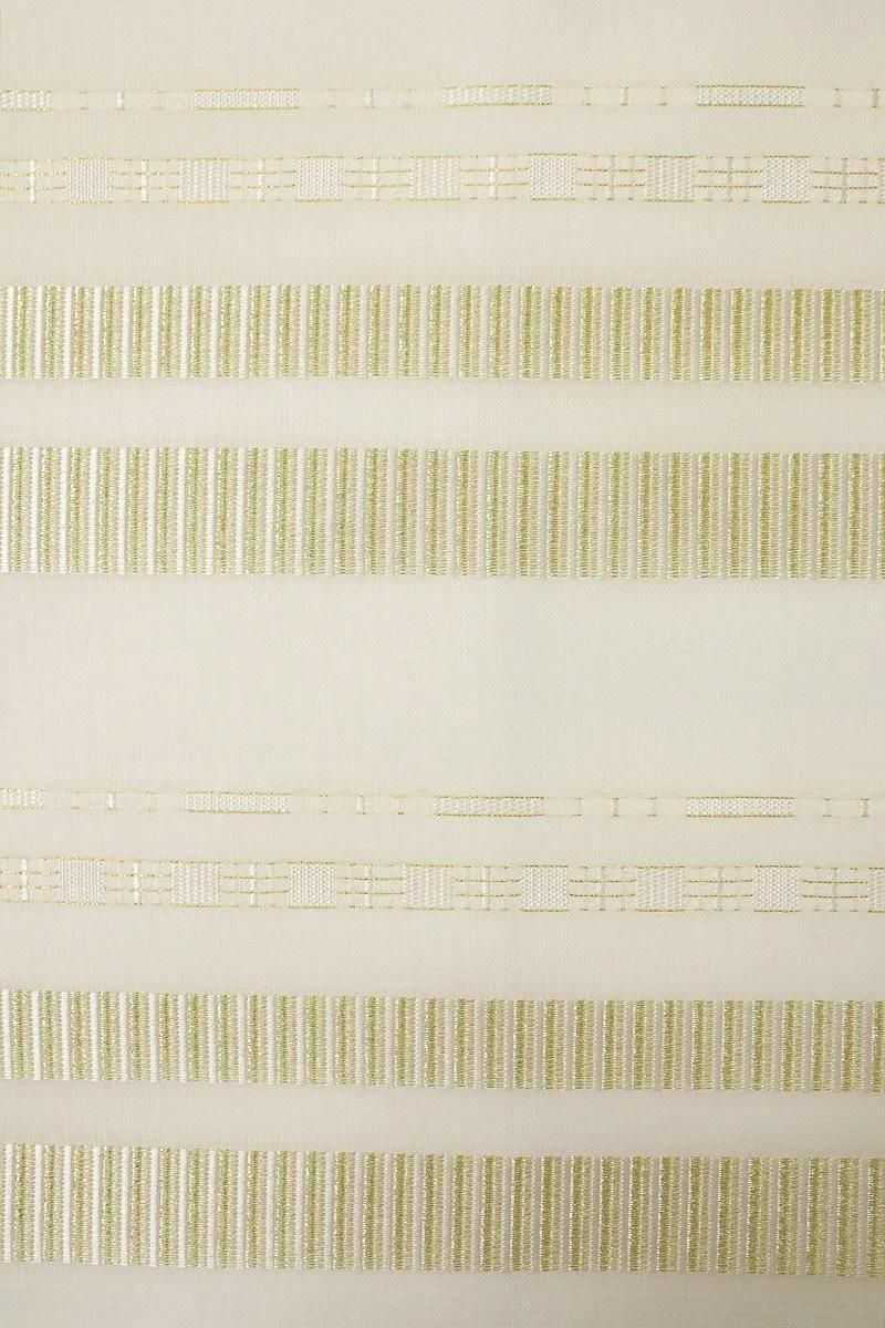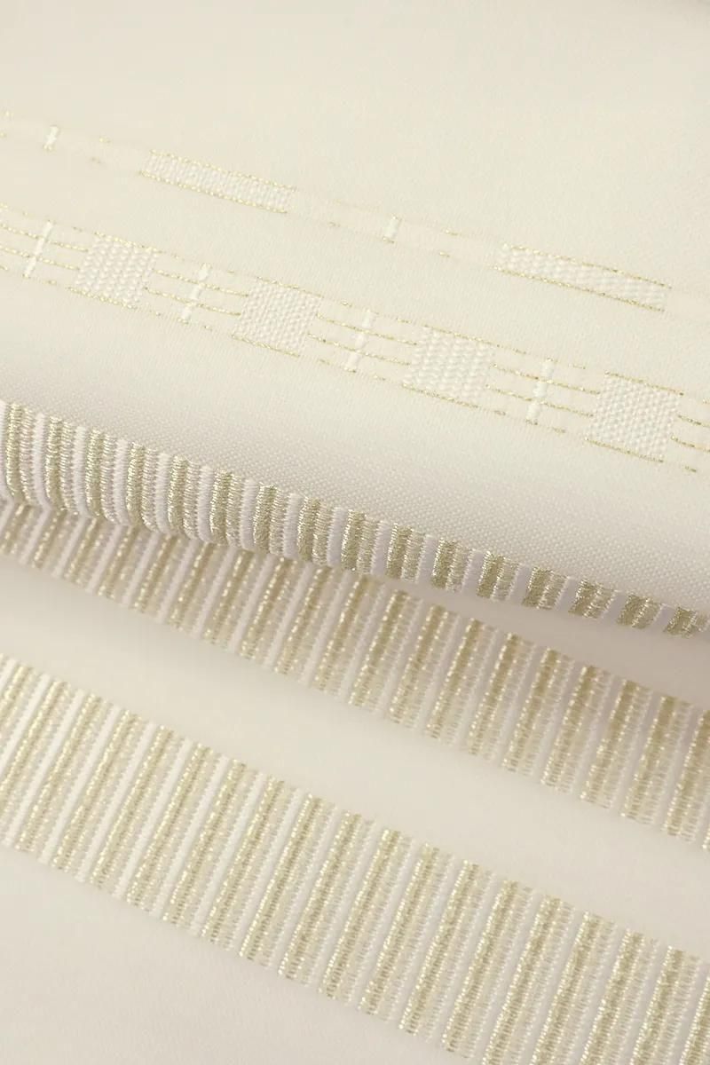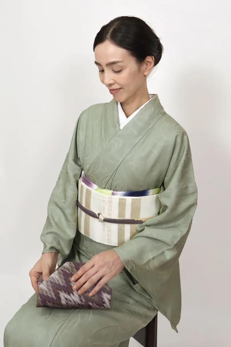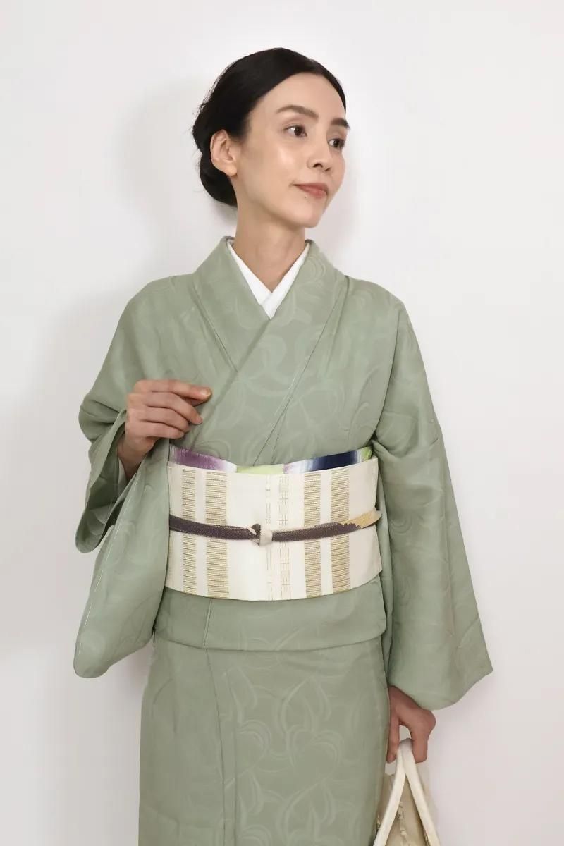 こちらは透け感のあるすっきりとしたオフホワイトの地に白と金銀糸で端正な幾何文を横段に配したお品、シンプルな色彩と穏やかな金銀糸の煌めきが洗練された美しさを添えてくれますね。単衣から盛夏にかけて、色無地や付下げ、訪問着などの様々なお着物に合わせて女性らしい楚々とした装いをいかがでしょうか。