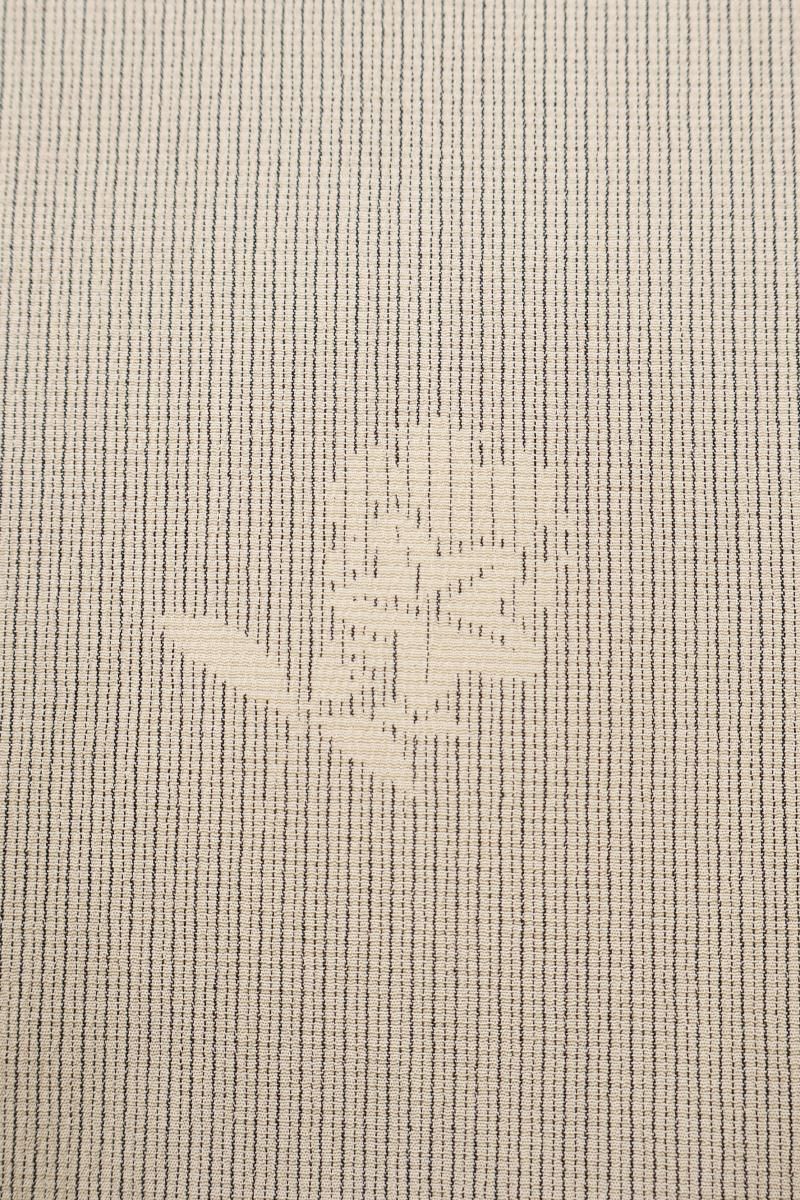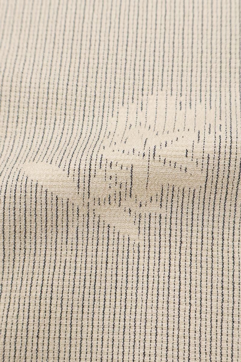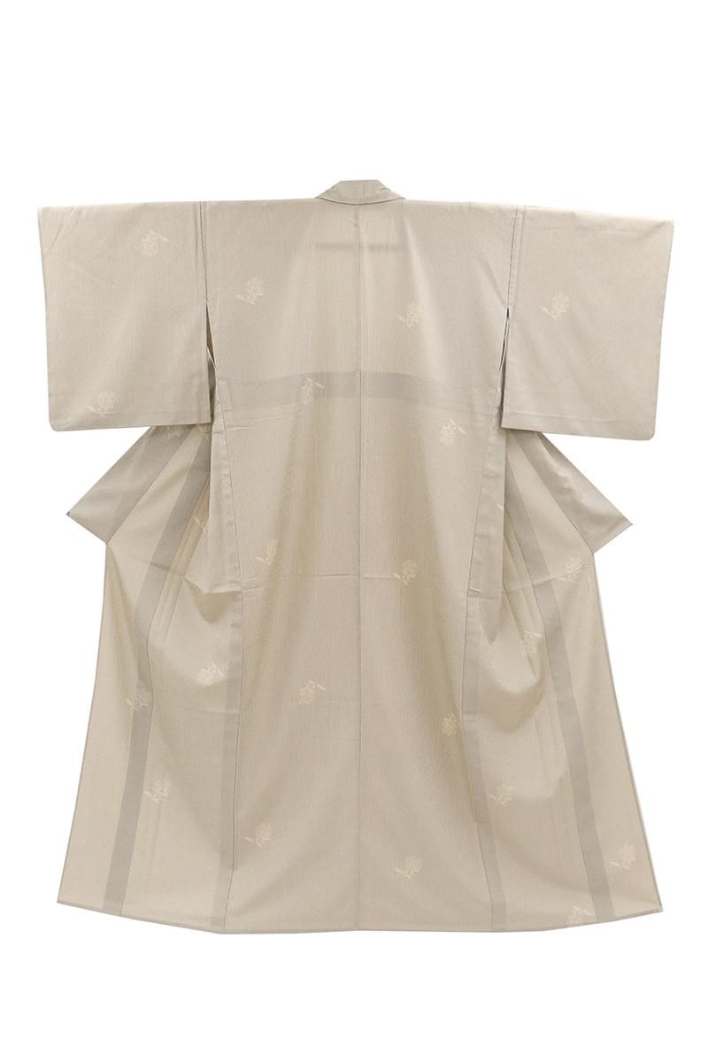 白茶色が近いでしょうか、ベージュがかったグレーの地に、竪縞に花の図を配した単衣の本塩沢です。穏やかな地色を背景にふんわりと浮かび上がる優美な意匠がさりげない華やかさを見せるお品、強撚糸による細やかなしぼがさらりとした風合いを生む本塩沢は、単衣時期には特に心地良くお召しいただけることと思います。ぜひこの機会にお手元にてご覧くださいませ。