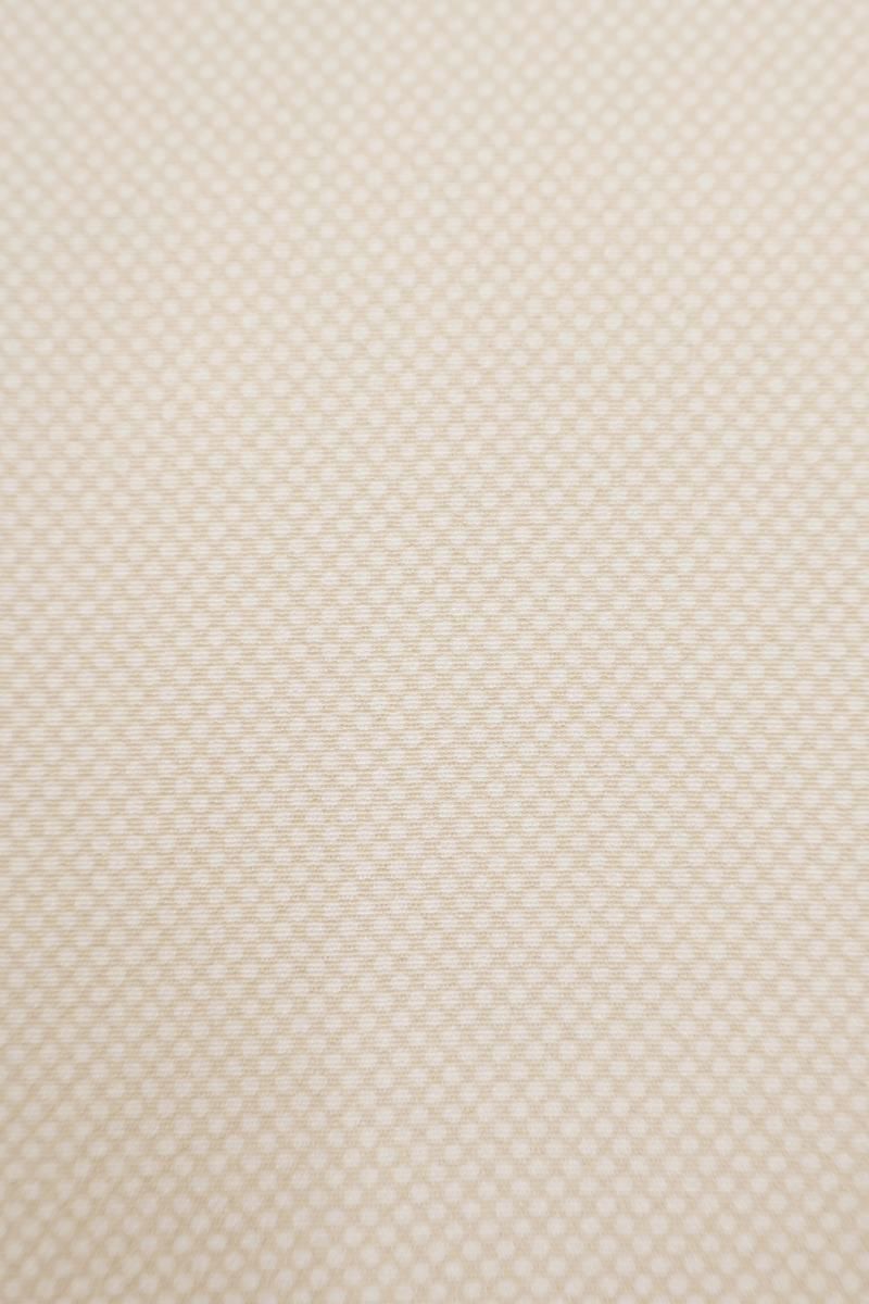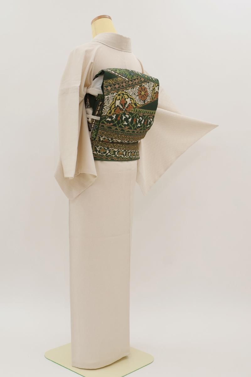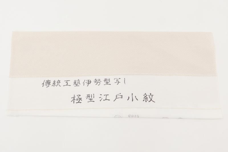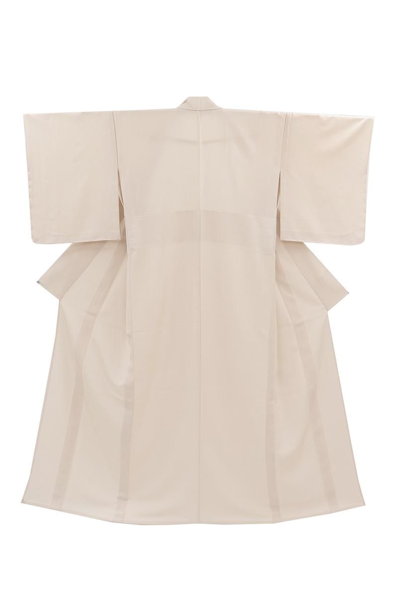 色を薄めた薄香色が近いでしょうか、わずかに灰みを含んだごく淡いベージュ系の地に行儀を染めた単衣の江戸小紋です。小紋三役の一つである行儀は格の高い柄行きとして人気ですね。控えめで優しいお色味はお召しになる方の年齢も幅広く、女性らしく柔らかな雰囲気をお楽しみいただけることと思います。この機会にいかがでしょうか。
