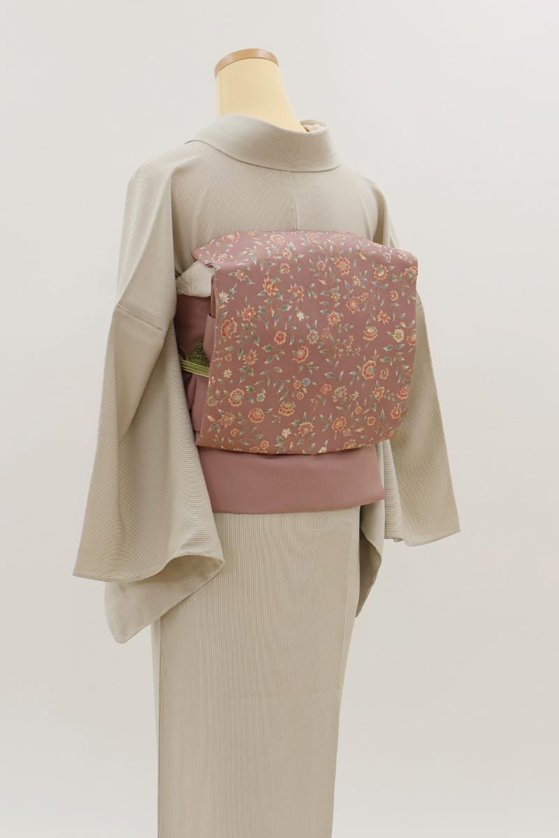 ぐっと色を薄めた薄蘇枋色が近いでしょうか、灰みの強いくすんだピンク色系の塩瀬地に、花唐草文を描いた名古屋帯です。程よく落ち着いた女性らしいお色目に、エキゾチックな意匠をすっきりと都会的に表現した一品、柄を縁取るほっそりとした金糸が気品を添え、装いを大人の女性らしく、しっとりと引き立ててくれることと思います。ドレッシーな紬や小紋、色無地などに合わせ、趣味性豊かな装いをいかがでしょうか。