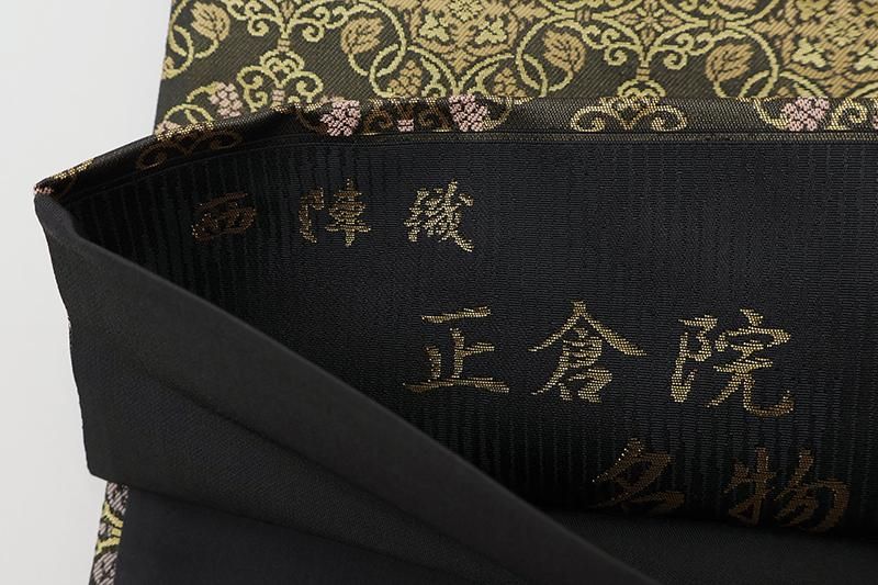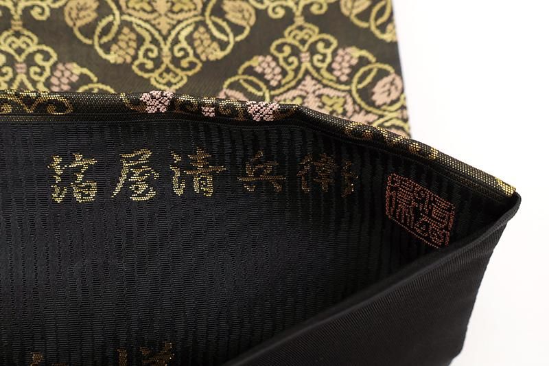 お茶の席など少し改まった場面で重宝にお使い頂ける、西陣証紙No.1522 陰山織物製・箔屋清兵衛ブランドの袋帯です。こちらは石板色が近いでしょうか、細やかな金を通したごく深いグレーの地に、名物華文を織りだしたお品、落ち着いた金糸遣いが端正な表情を創り出し、装いを格調高く引き締めてくれることと思います。色無地や江戸小紋などに合わせて、お茶席など改まった場面の装いにいかがでしょうか。