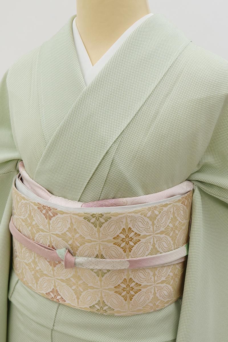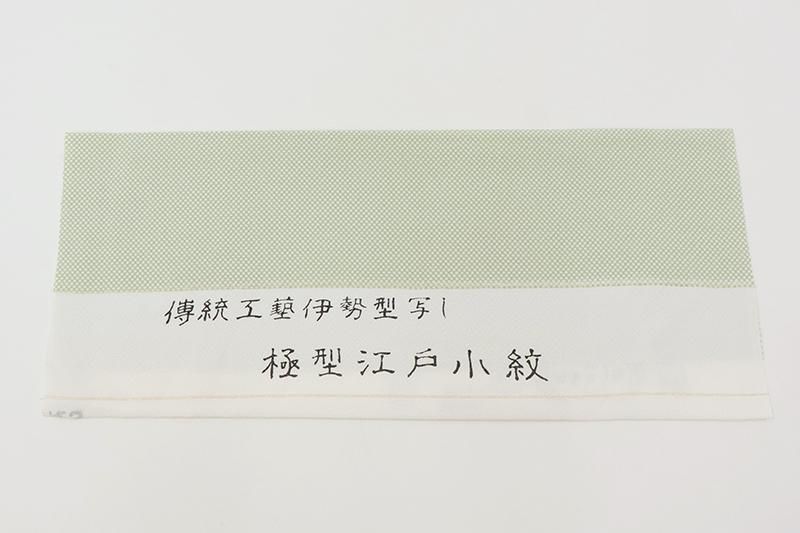こちらは格の高い小紋三役のひとつとしても人気の行儀を染めたお品、紋は入っておりませんので、季節の染め帯からやや格高の袋帯まで幅広い帯合わせで重宝にお召しいただけることと思います。優しげな印象の爽やかなお色目が装いを朗らかに引き立てる一枚、お食事会や観劇、少し改まったお席などにいかがでしょうか。