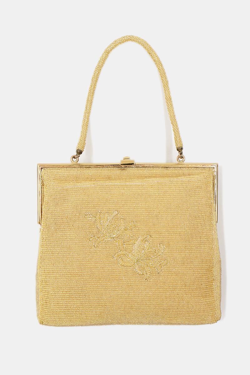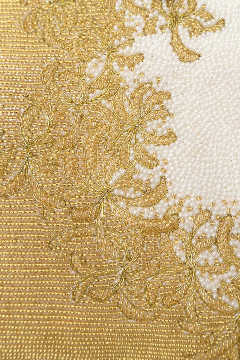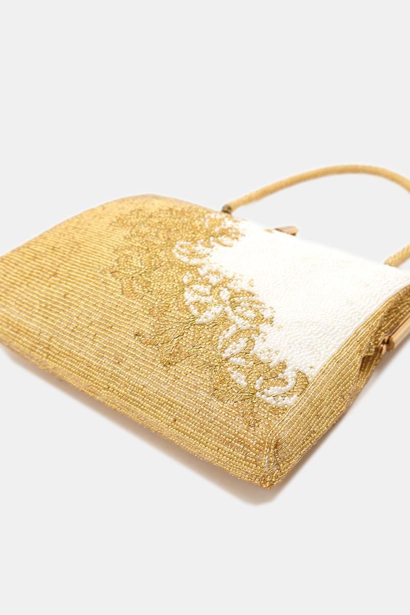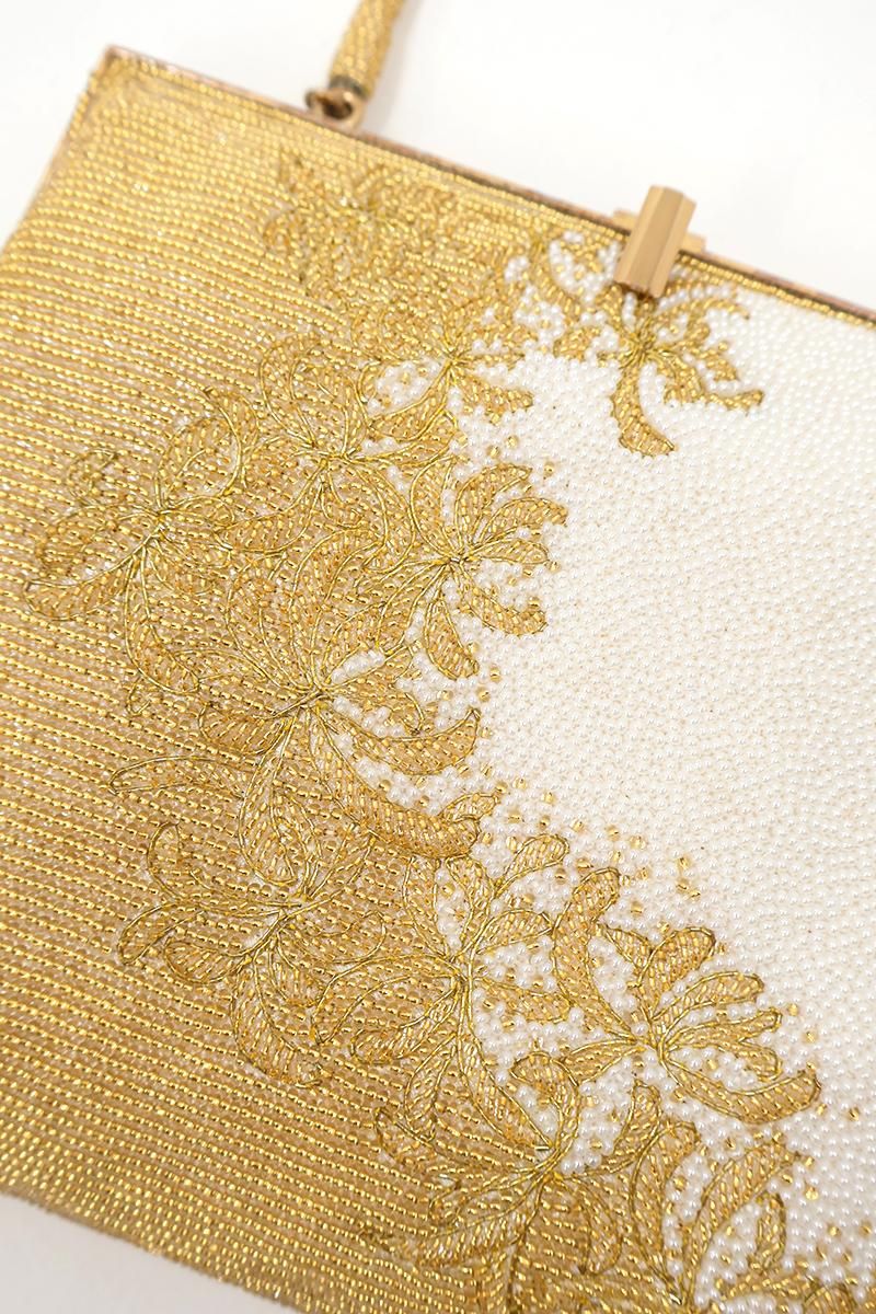 煌びやかなゴールドと白で、植物の意匠を表した豪華なビーズバッグです。