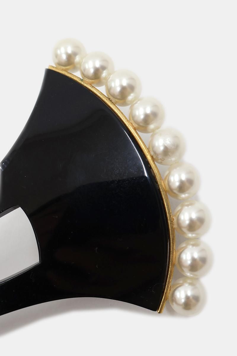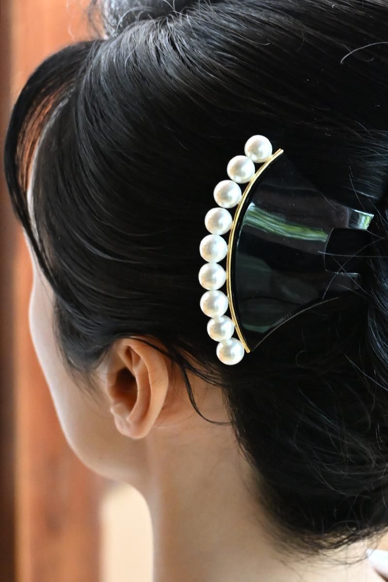 こちらは黒色一色のバチ型にパールが施されたお品、金のラインが一層の華を添えていますね。シンプルな無地ですので季節やお召しになる方の年齢を選ばず、重宝いただけることと思います。訪問着や留袖、色無地などフォーマルな装いにいかがでしょうか。
