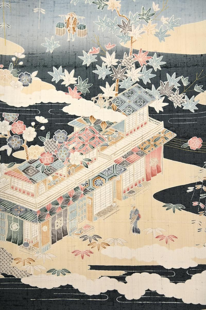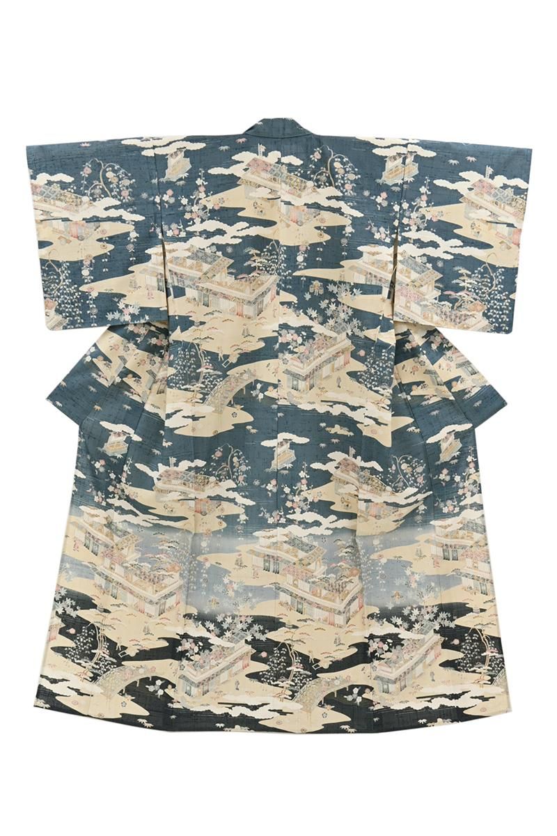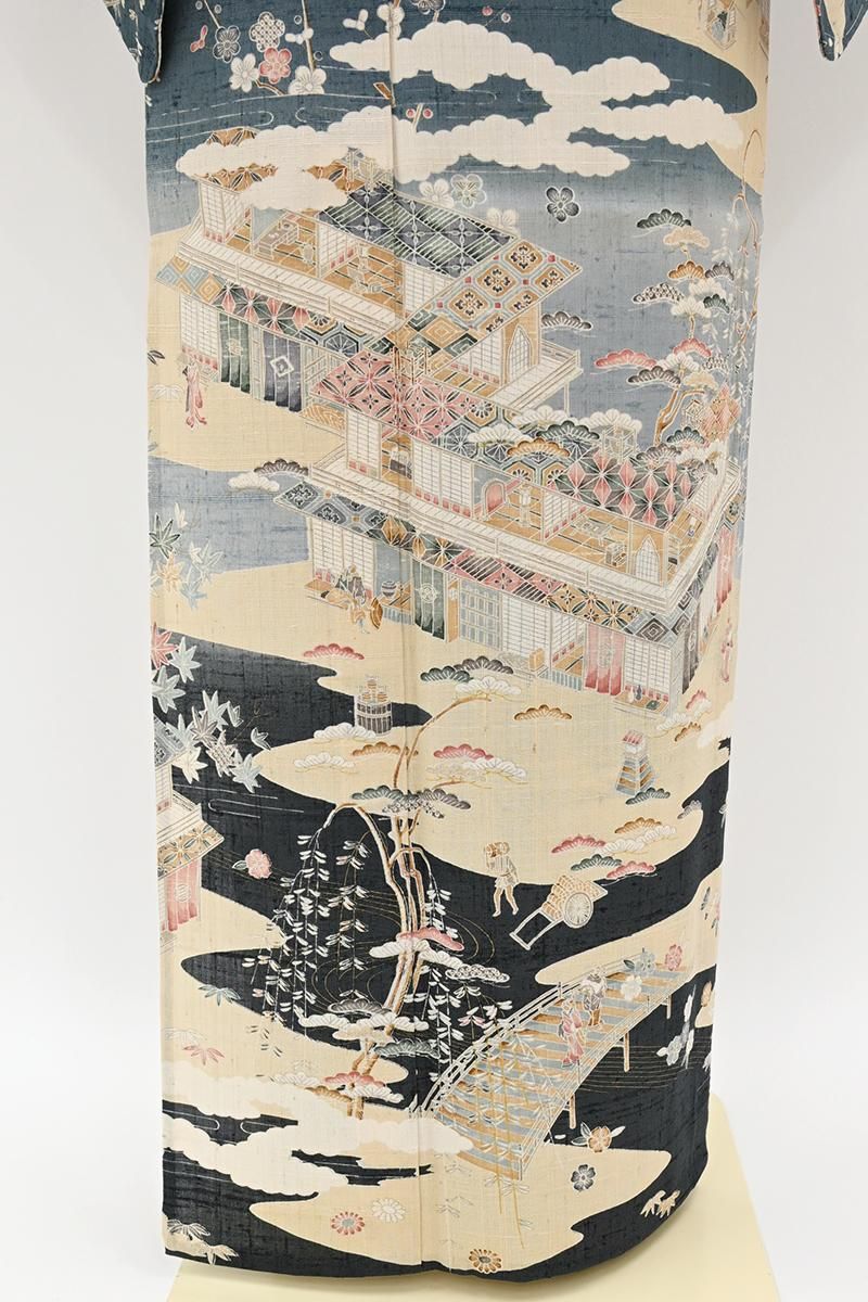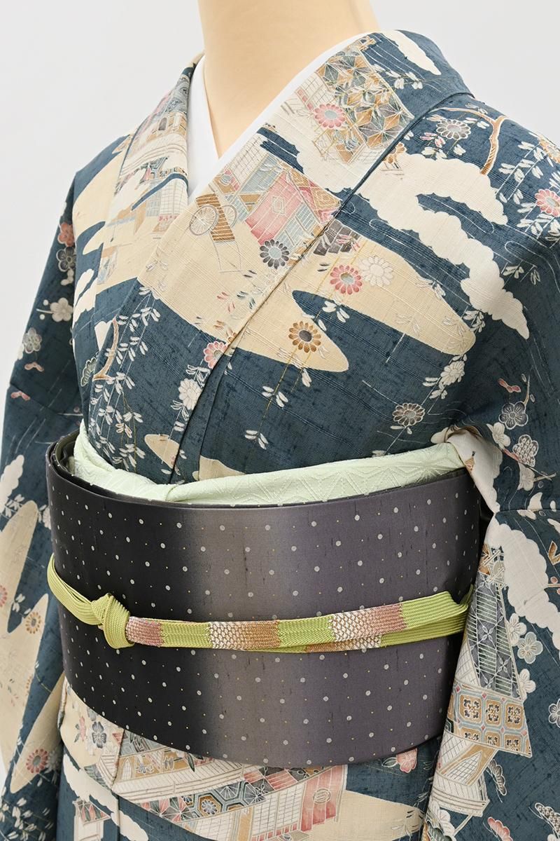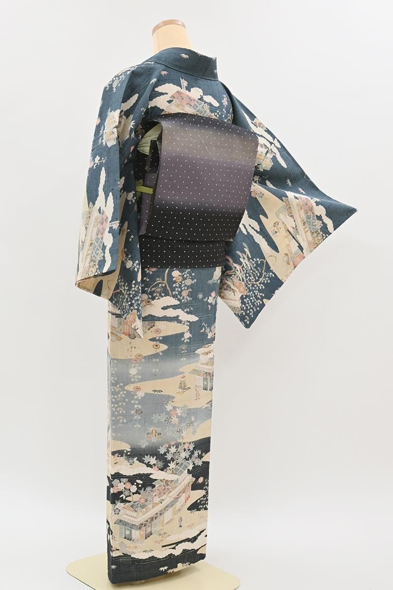 全体の印象としては濃縹色が近いでしょうか、灰みを帯びた深い青色の地に灰みのベージュでゆったりと暈かしを配し、四季花や風景などを描いた単衣の訪問着です。ぽつぽつと節の浮かぶ地風に風雅な意匠が一面に広がるお品、多彩な表現を集結させた洒落味あふれる一点は気軽な社交着として様々な場面でお楽しみ頂けることと思います。パーティなどのお席でも一際目を引く装いをいかがでしょうか。