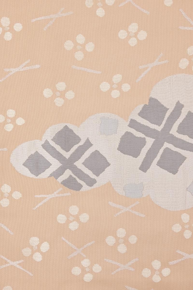 個性豊かな意匠が西陣の選ばれた老舗機屋の手で織り上げられる洛風林さんの帯は、着物を着る方の間でもとりわけ高い人気がありますね。こちらは赤白橡色が近いでしょうか、ピンクベージュの地に大きな雲取りを主役に、大小の切箔文を散らした大らかなタッチの意匠が膨れ織りで表現された一点、穏やかに調和する金銀を基調とした柄ゆきは、意匠の本歌である秀衡塗のうつわから受ける華やかさとはまた異なった、現代の装いにすっきりと馴染む軽やかな格調が引き立ちますね。古今東西を問わぬ膨大なデザインの蓄積から生まれる、洗練された古典美をお楽しみくださいませ。