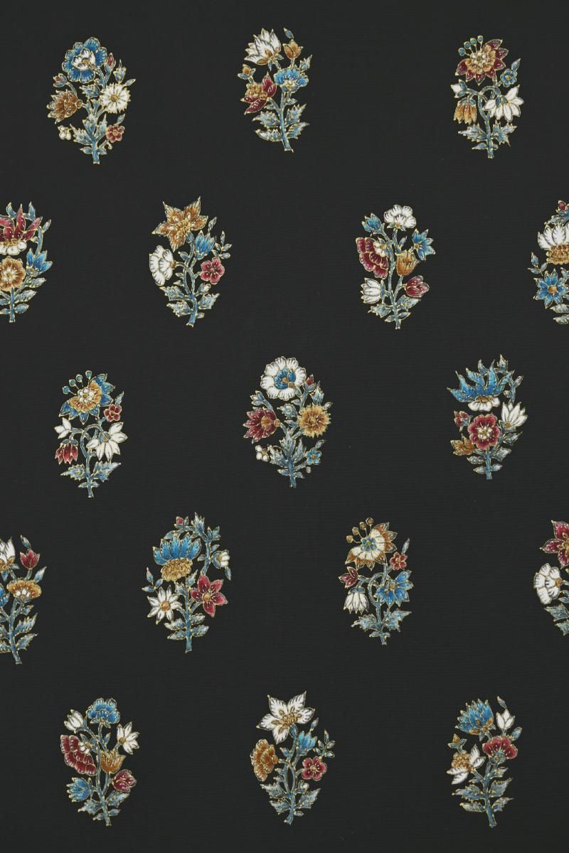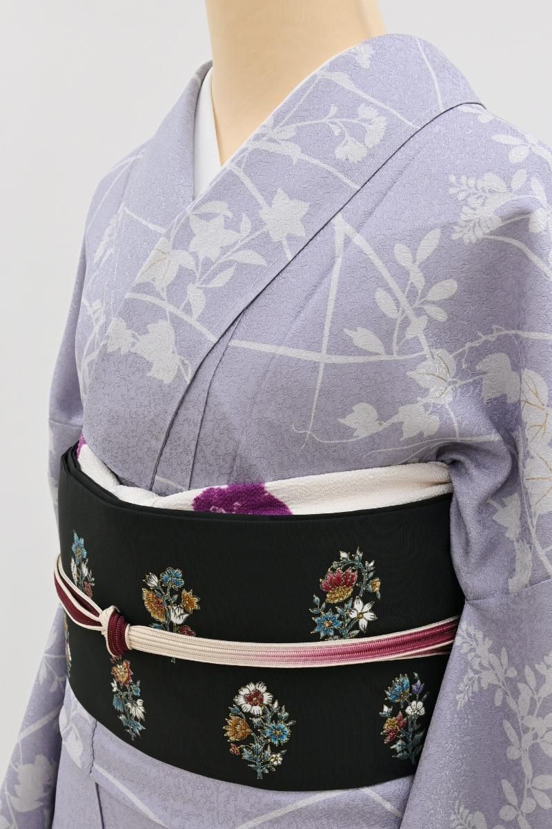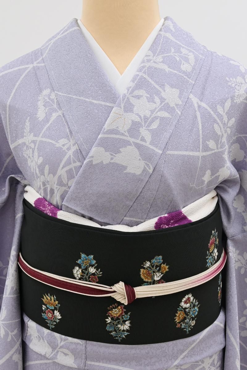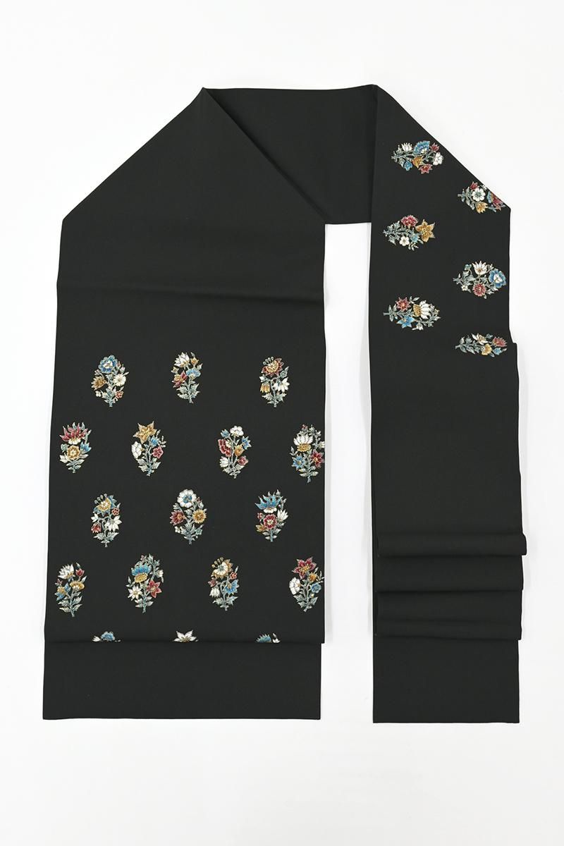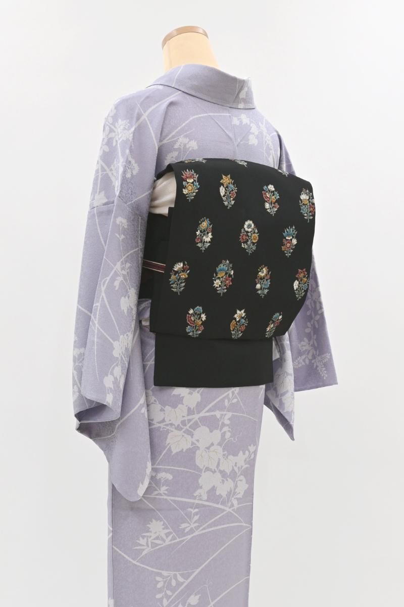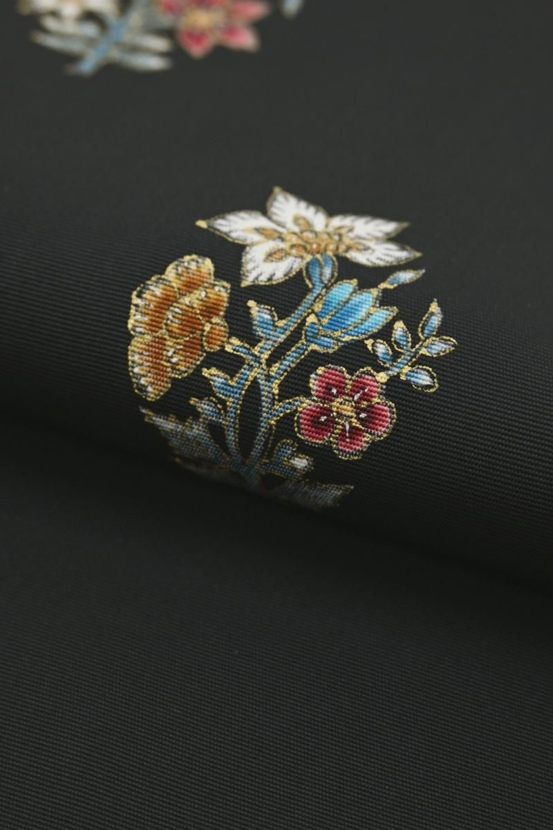 さらりとした地風の黒色の塩瀬地に、更紗花文を描いた名古屋帯です。