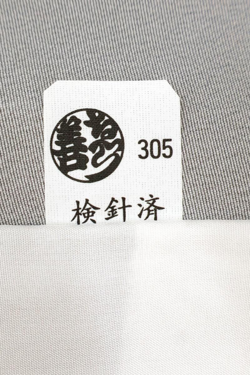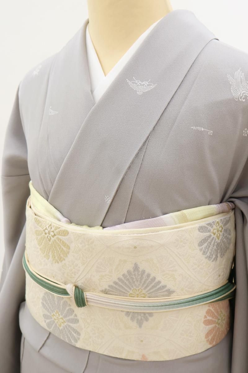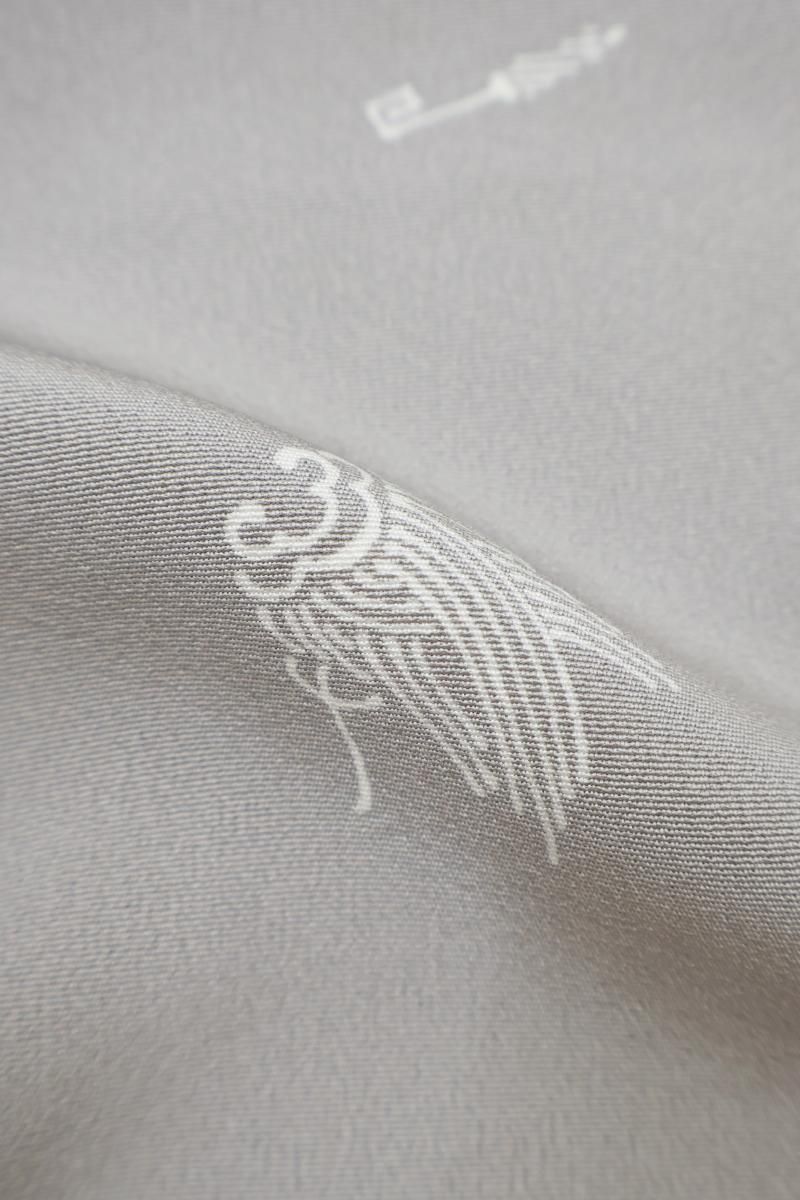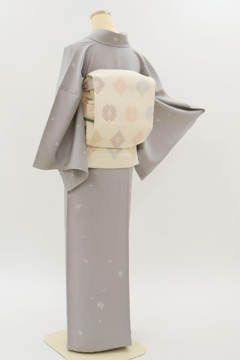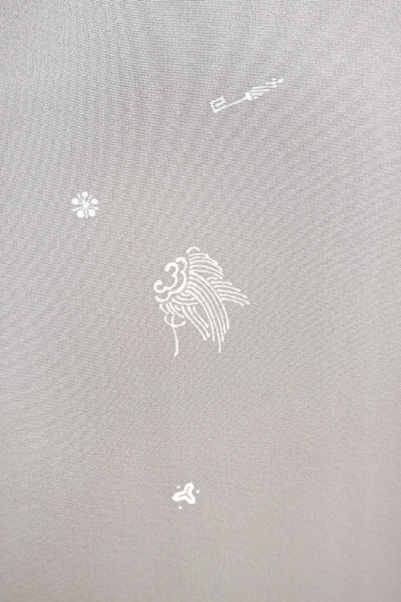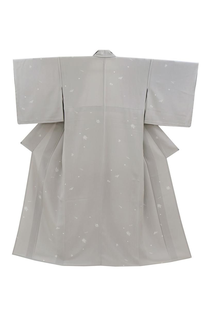 やや明度を上げた銀鼠色が近いでしょうか、淡いグレーの地に細かな宝尽くし文を散らした単衣の小紋です。