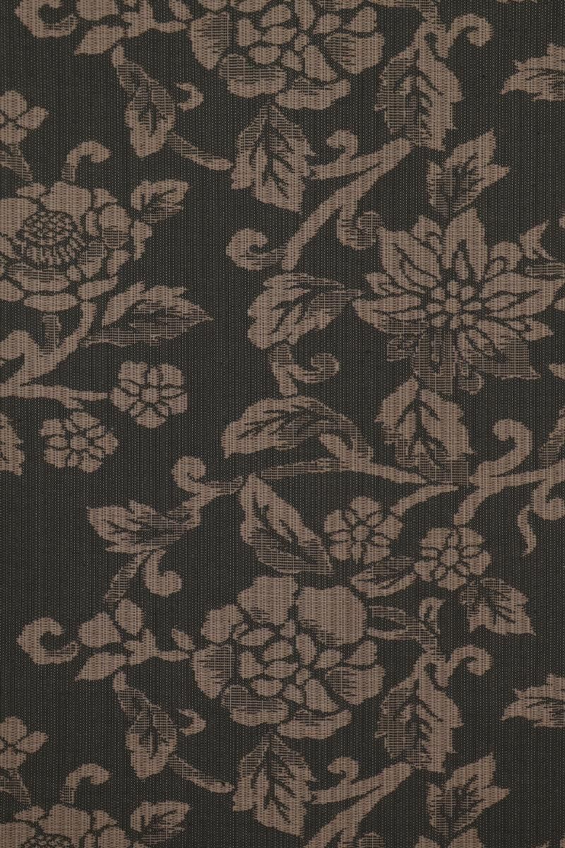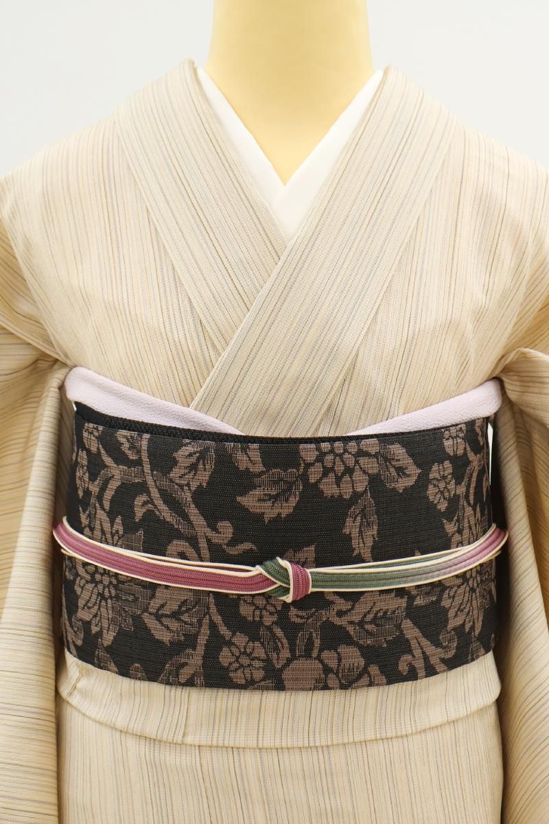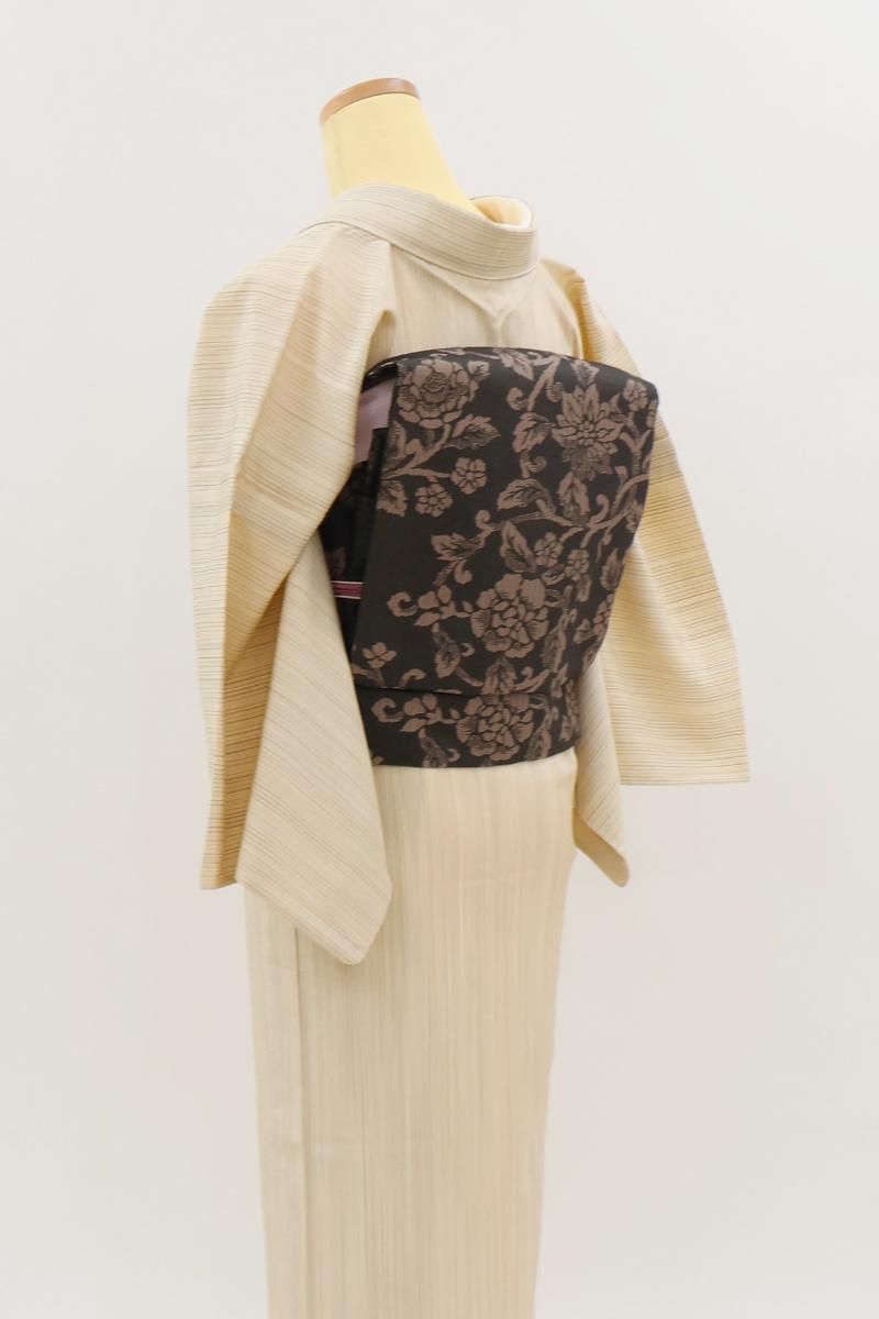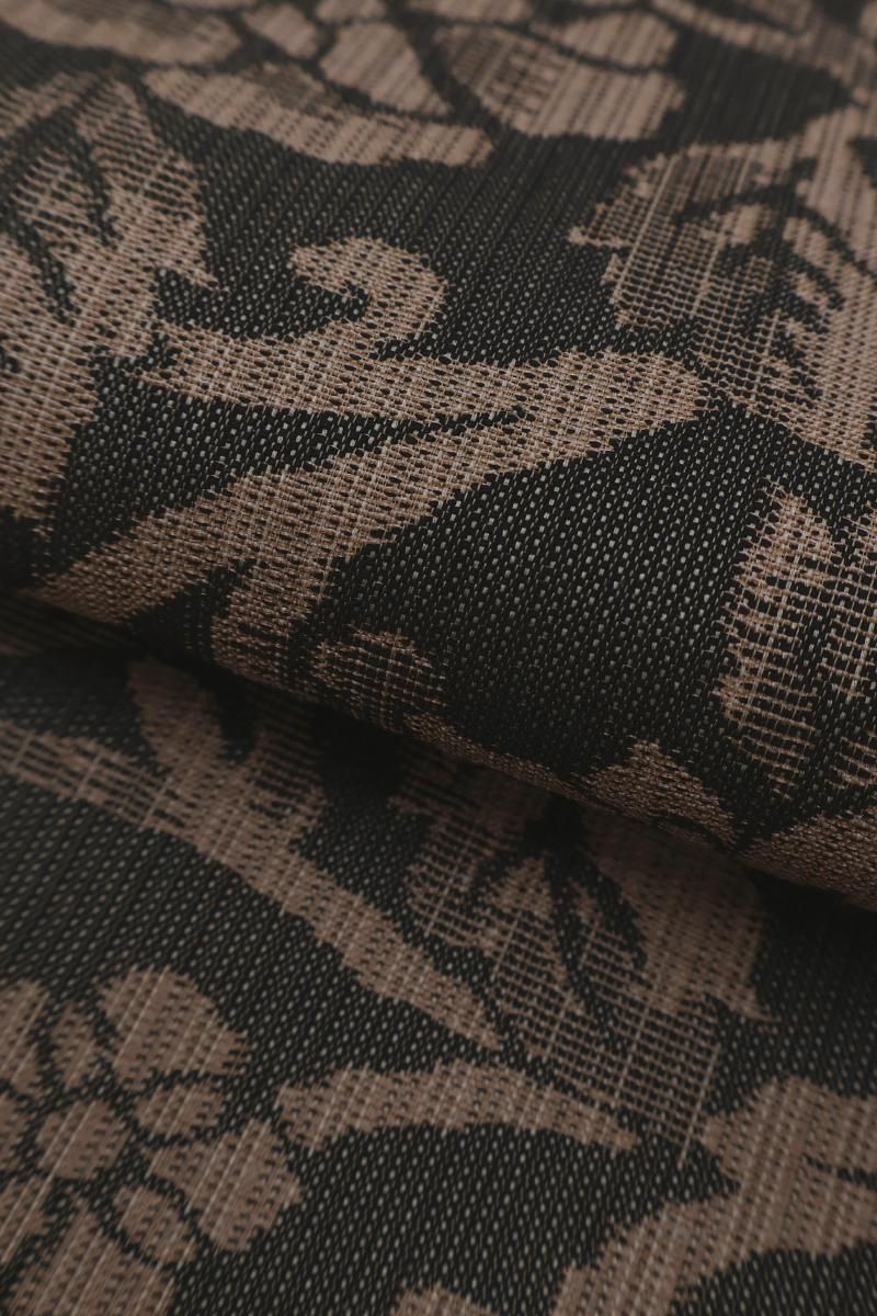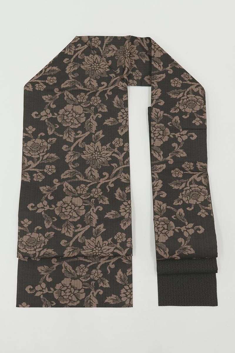 鈍色が近いでしょうか、灰みの焦茶色の地に、まろやかな茶色で牡丹唐草文を織り出した名古屋帯です。